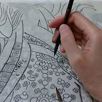 그리고 긴 선을 그을 때 손이 비단에 닿지 않도록 해야 하는것을 알게 되었다. 손의 기름이 비단에 닿으면 채색이 되지 않고 석채 채색 후에는 석채가 떨어질 우려가 있기 때문이다. 손을 대지 않고 먹선을 그어야 하는 것이다.