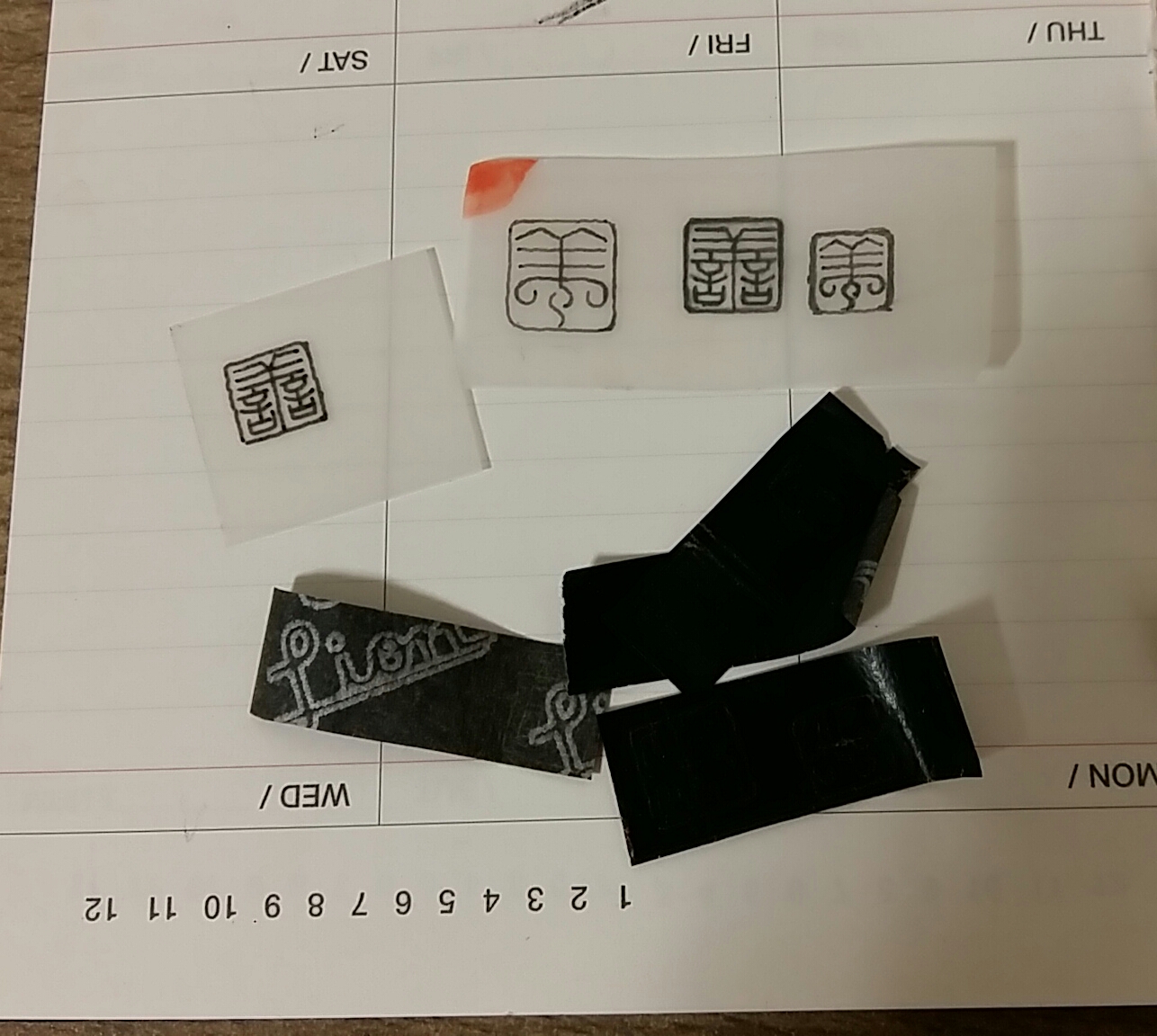 매끄럽게 갈린 전각석에 봉채 주황을 갈아 칠하여 말린다. 전각석을 인상에 고정하고 먹지, 트레싱지를 대고 샤프나 볼펜으로 따라 그린다. 이 때 트레싱지를 뒤집어 놓고 그려야 한다. 열심히 팠으나 좌우가 반전되면 너무 허망하다.