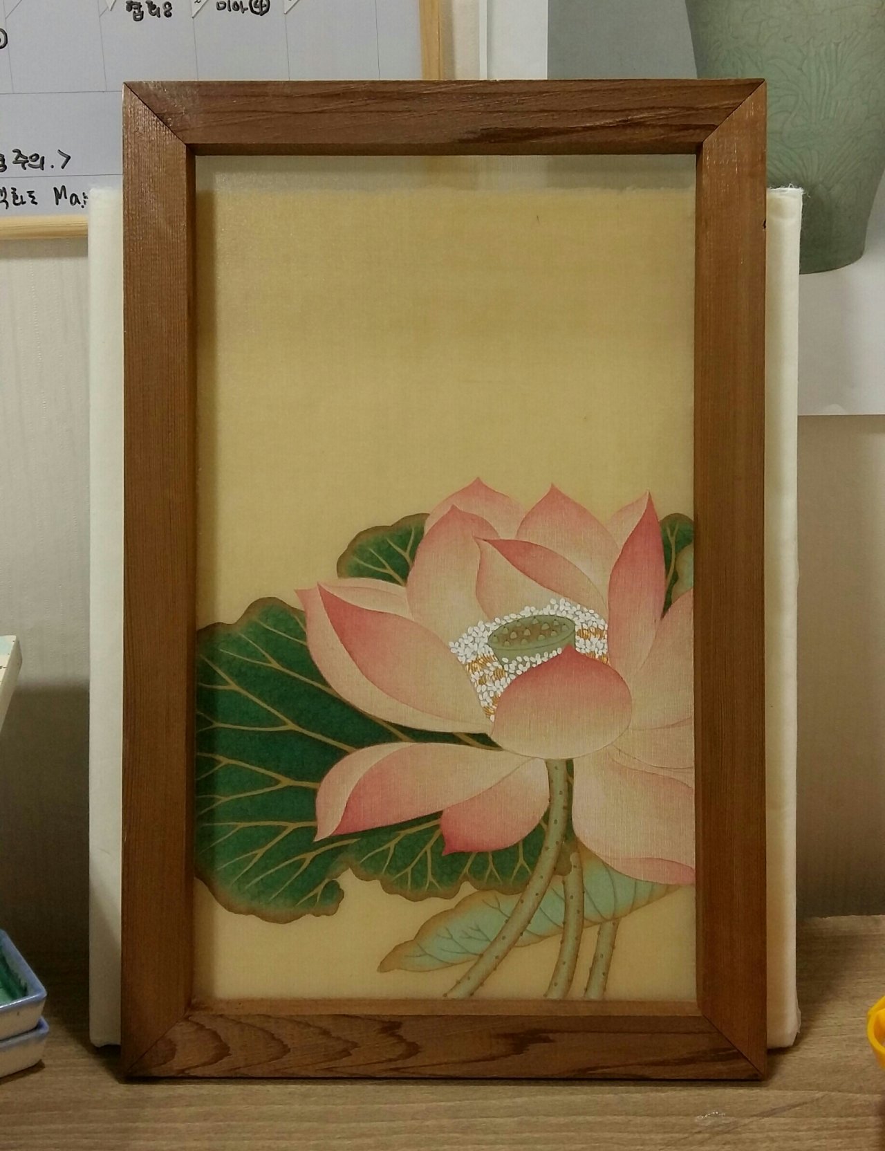 비단 수업은 비단정련, 염색, 틀에 붙이기, 교반수 칠하기, 순지에 선 긋기 연습, 채색 등 상세히 알려드립니다. 첫 그림은 출수부용도를 그립니다.