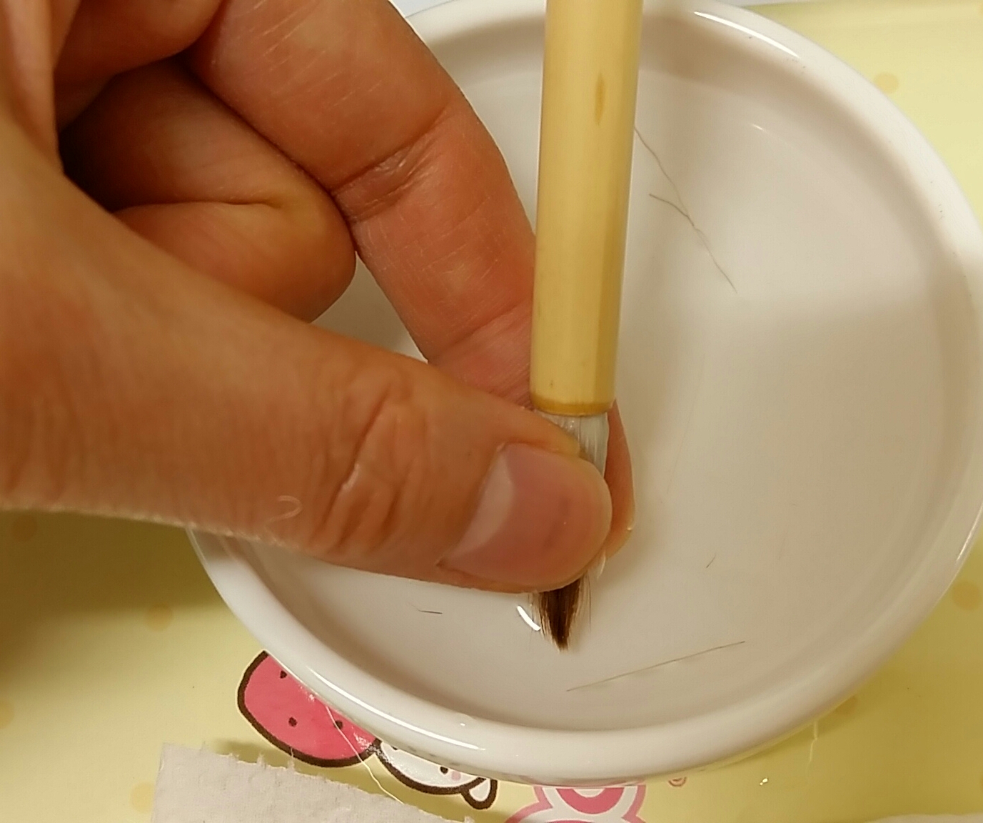 접시 물 속에서 손가락으로 붓털을 잡고 살살 누릅니다. 붓을 돌려가며 손가락으로 가만히 누르면 해초액이 다 물에 녹아나오며 털이 부드러워집니다.