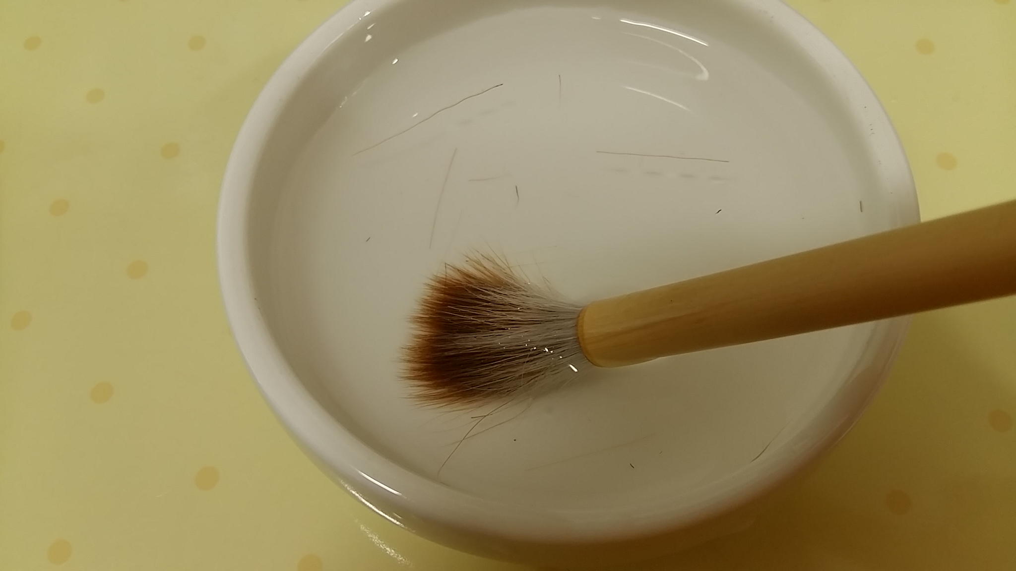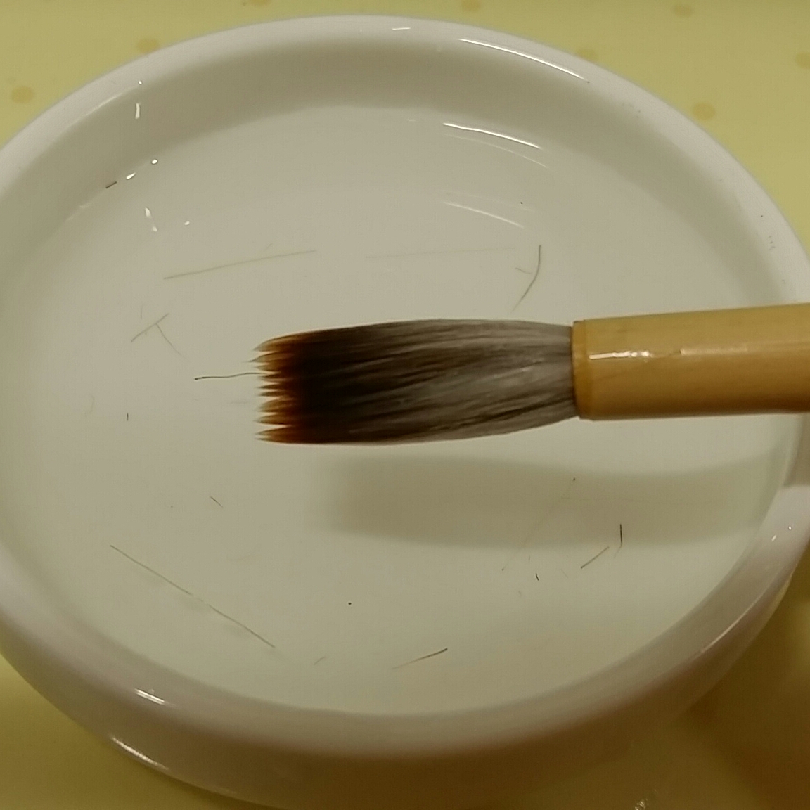 딱딱한 해초액이 불토록 접시에 미지근한 물을 담아 놓고, 붓 털 부분이 잠기도록 하여 엄지 검지 손가락 끝으로 살살 만져서 풀어 줍니다.