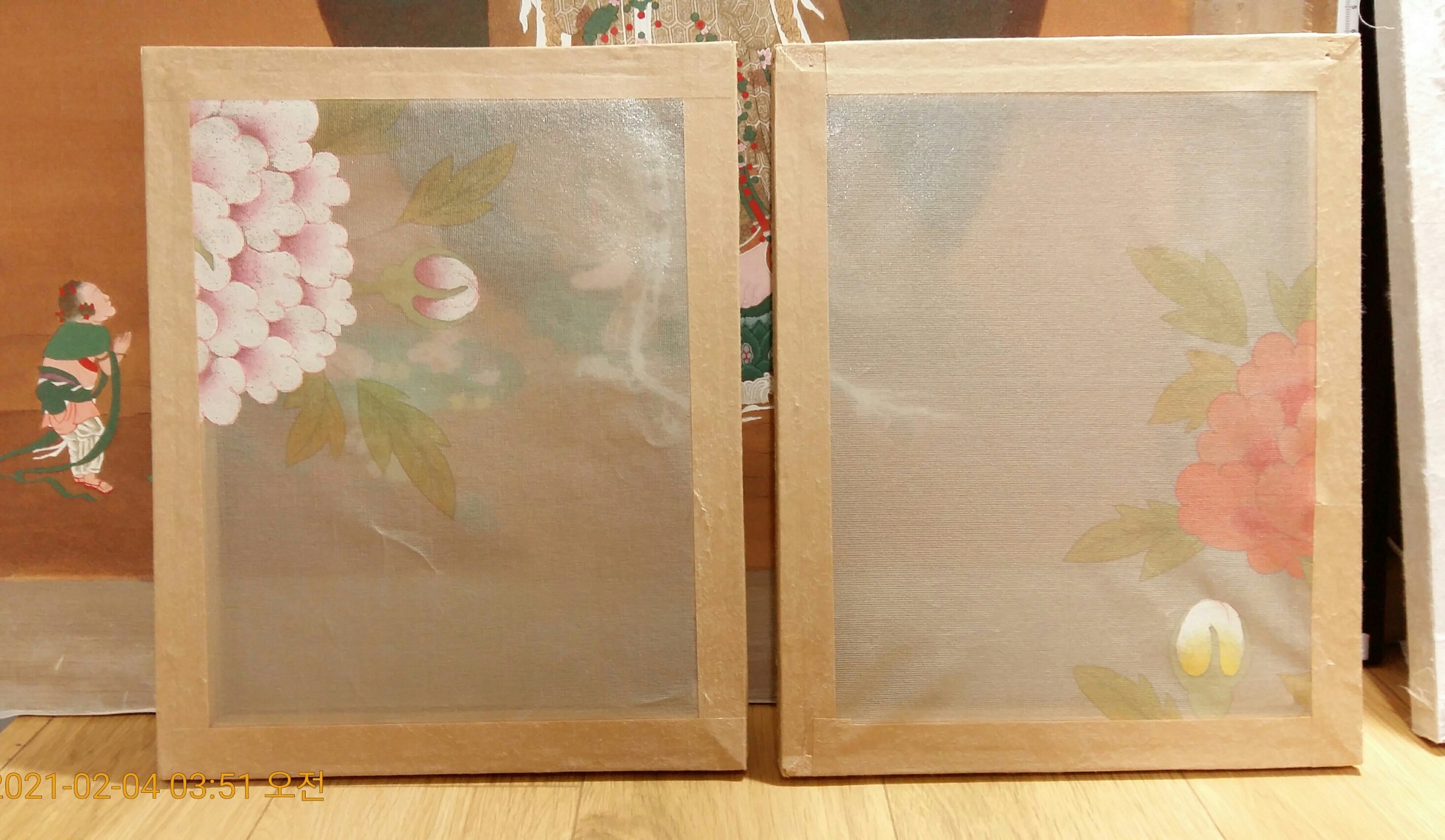 비단에 교반수 칠하고 완료한 후 채색하다 잘못되서 뜯게 되면, 풀칠이 안먹어서 다시 나무틀에 붙일 수 없습니다.