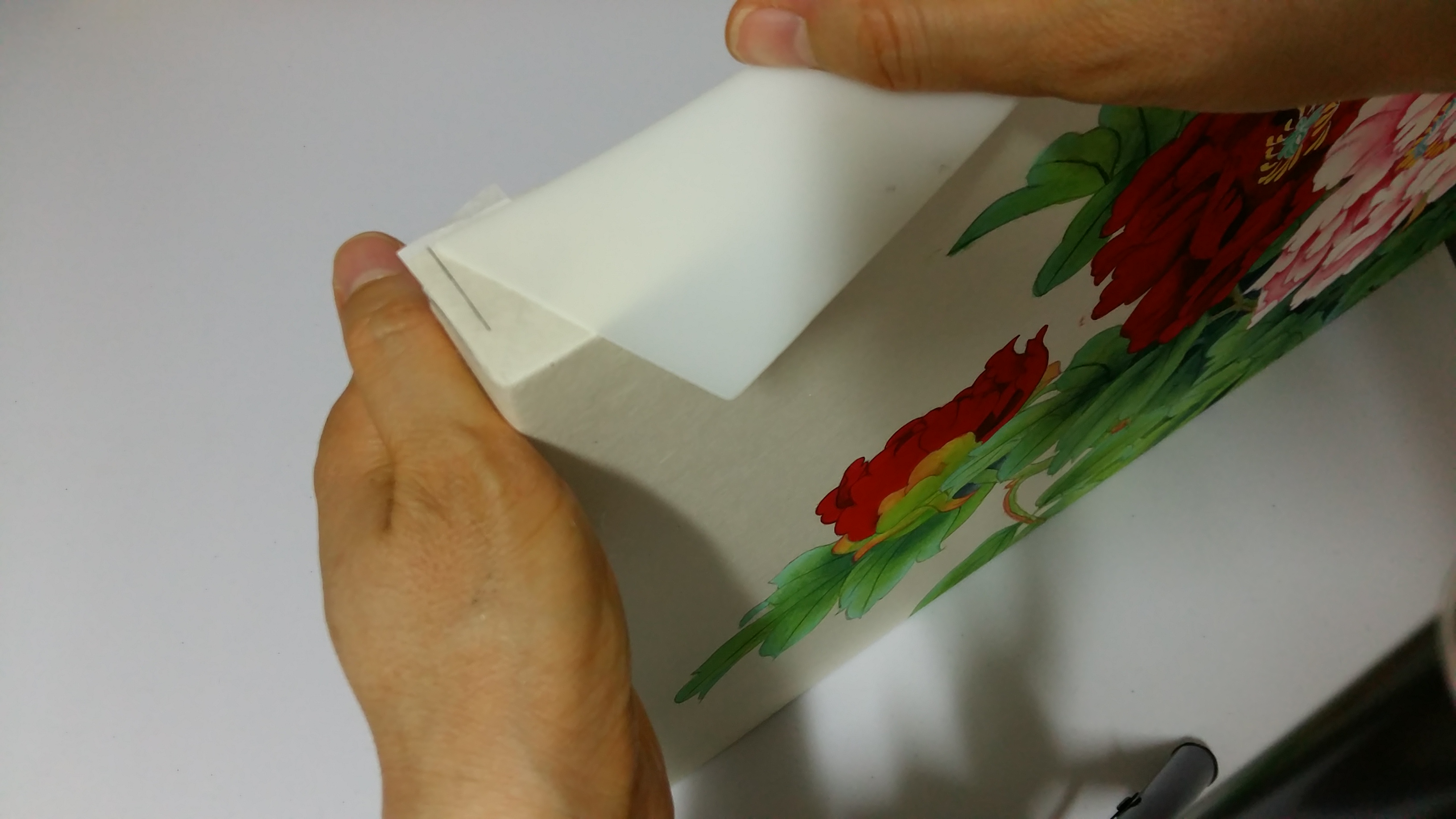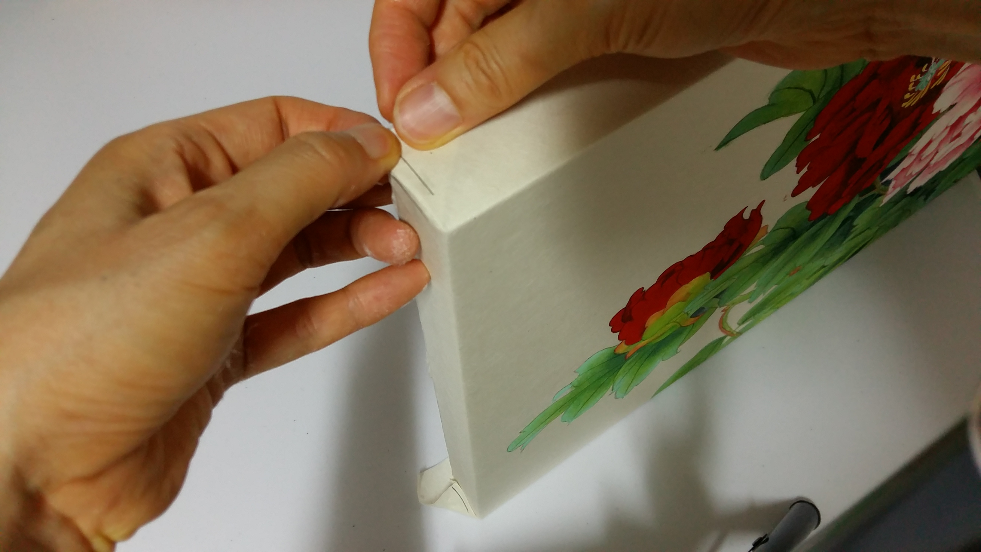 옆면에 같은 방법으로 풀칠을 하고 그림을 얹어 자리를 잘 잡습니다. 손으로 당겨가며 눌러 붙입니다.