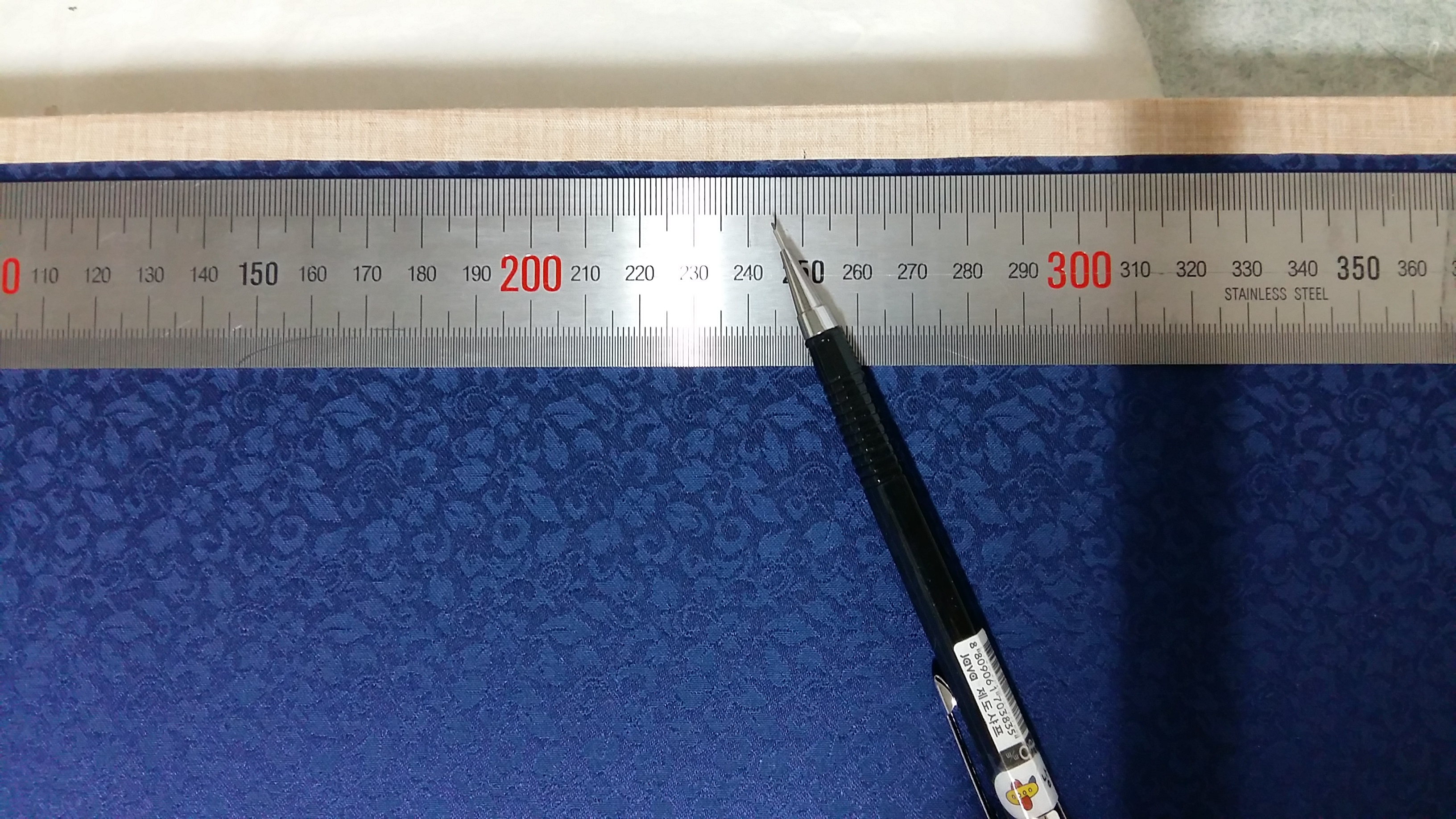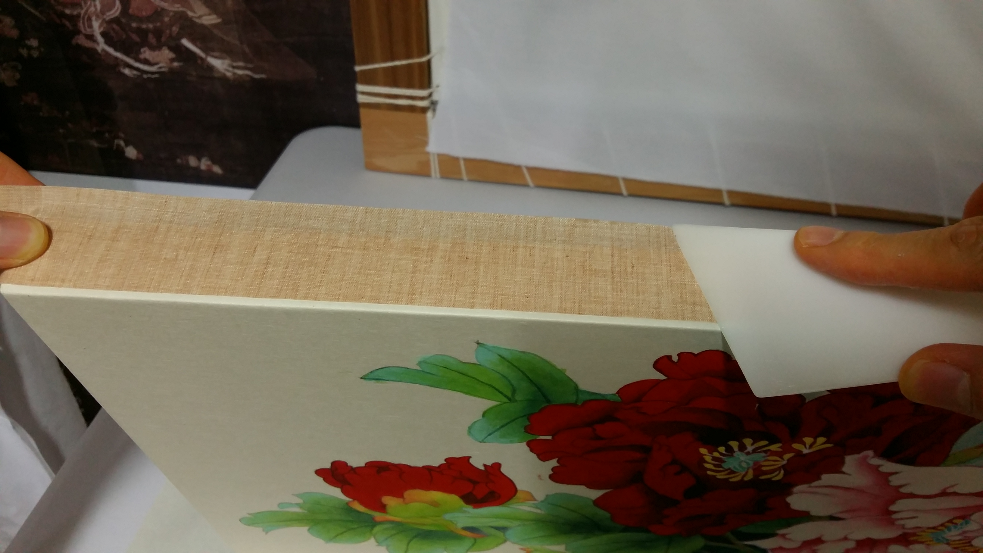 옆면에도 비단을 붙여 놓습니다. 그림쪽으로 2mm 정도 뒤로 붙입니다. 뒤로 접어 붙이기 위해 넓게 잘랐습니다.