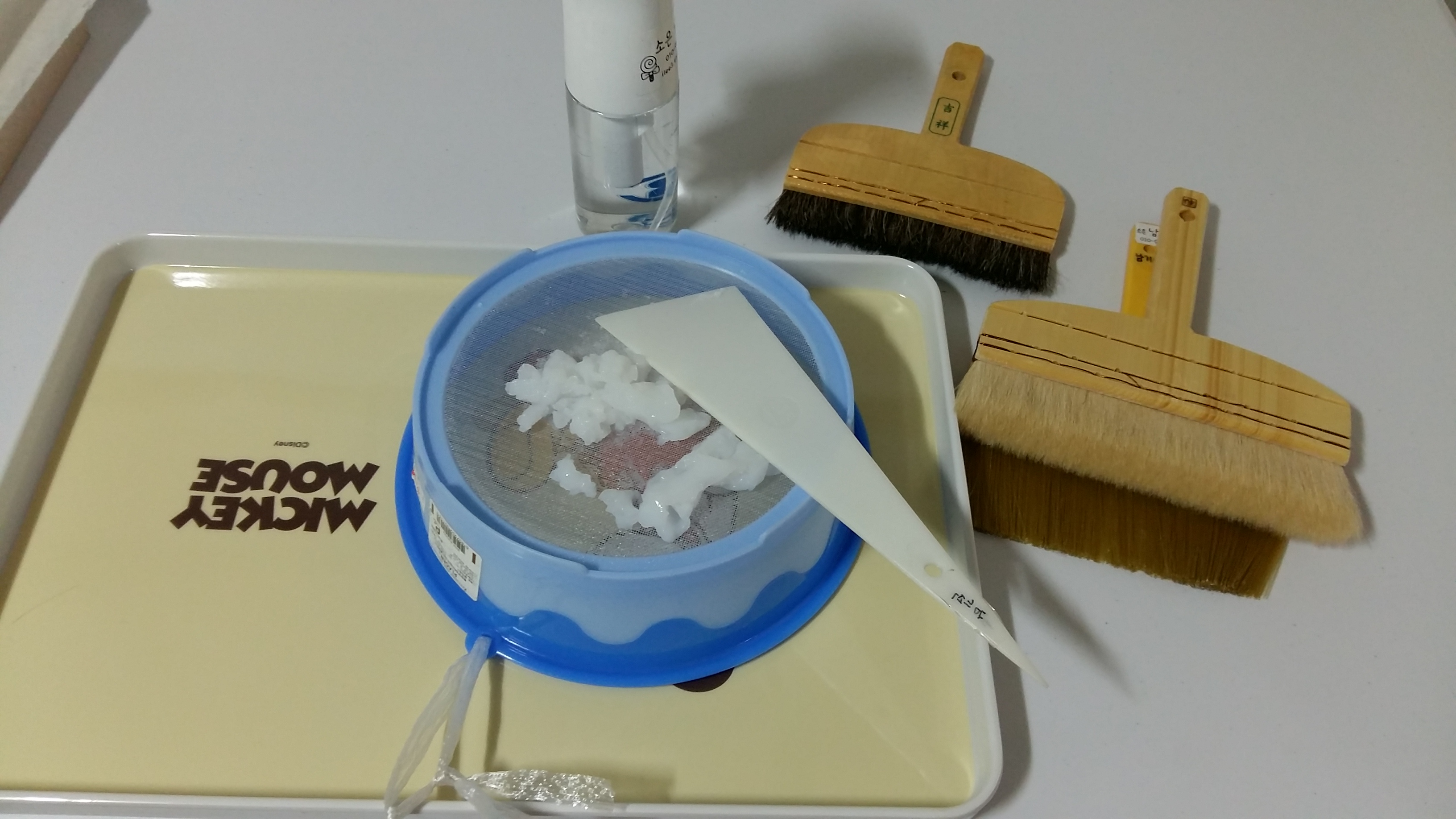 며칠 전에 쑤어 냉장고에 보관하던 풀을 꺼내 체를 통과시킨 후 물을 뿌려가며 풀솔로 이깁니다. 이 과정을 잘 해야 점성이 높아집니다. 된풀로 만듭니다.
