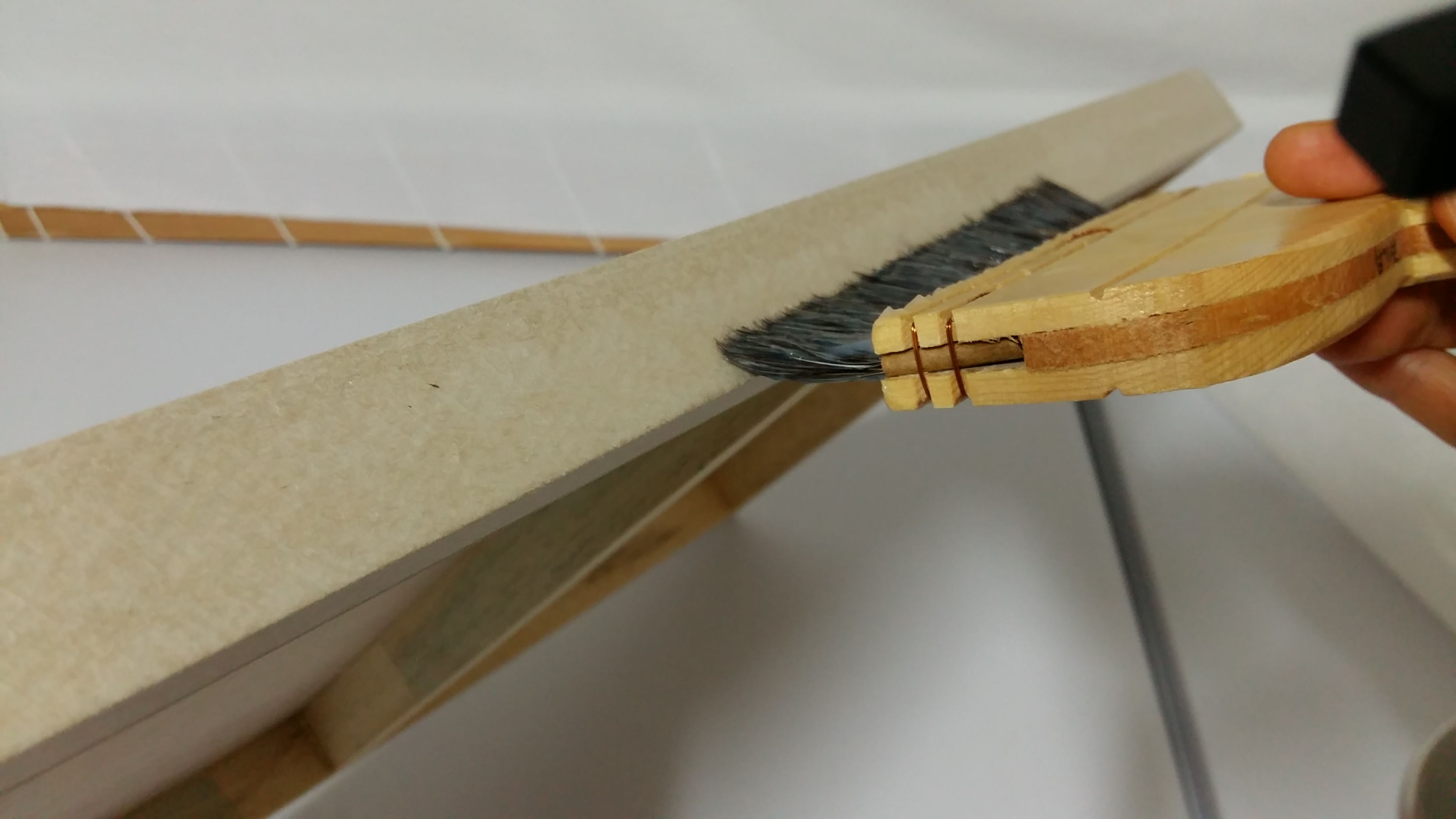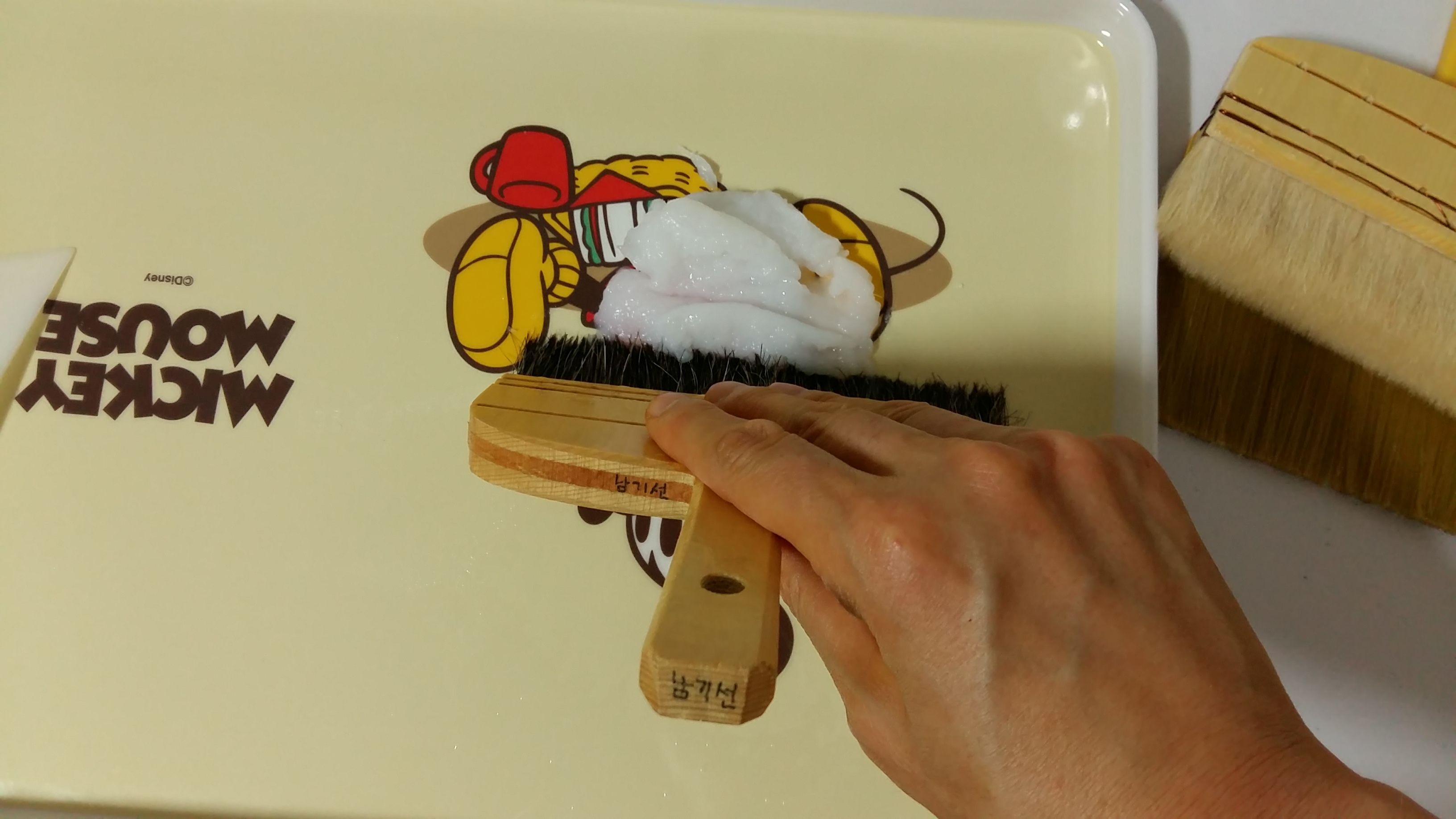 가운데서 방사형으로 솔질하여 순지를 늘린 후 옆면으로 솔을 내려 붙입니다.