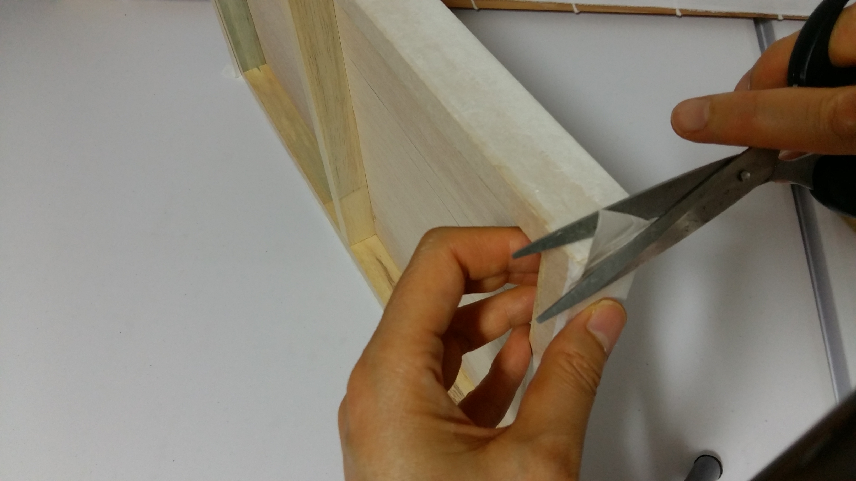 모서리 부분을 주의하여 손으로 당겨가며 붙입니다. 너무 세게 당기면 찢어집니다. 모서리는 가위로 잘라 버립니다.