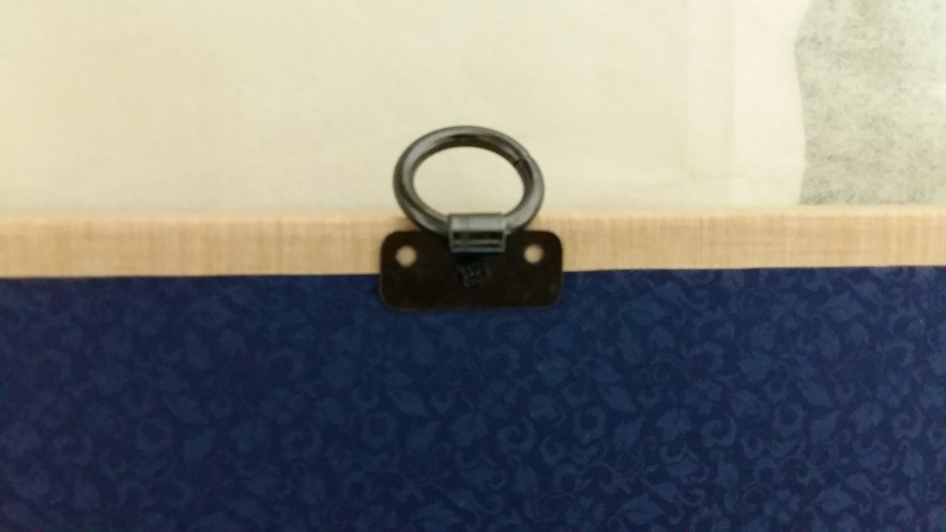 정 가운데 송곳로 찍어 자리를 만든 후 고리를 나사로 살짝 박아서 벽에 걸어봅니다. 수평이 안 맞으면 떼어서 자리를 다시 잡아 나사를 조입니다.
