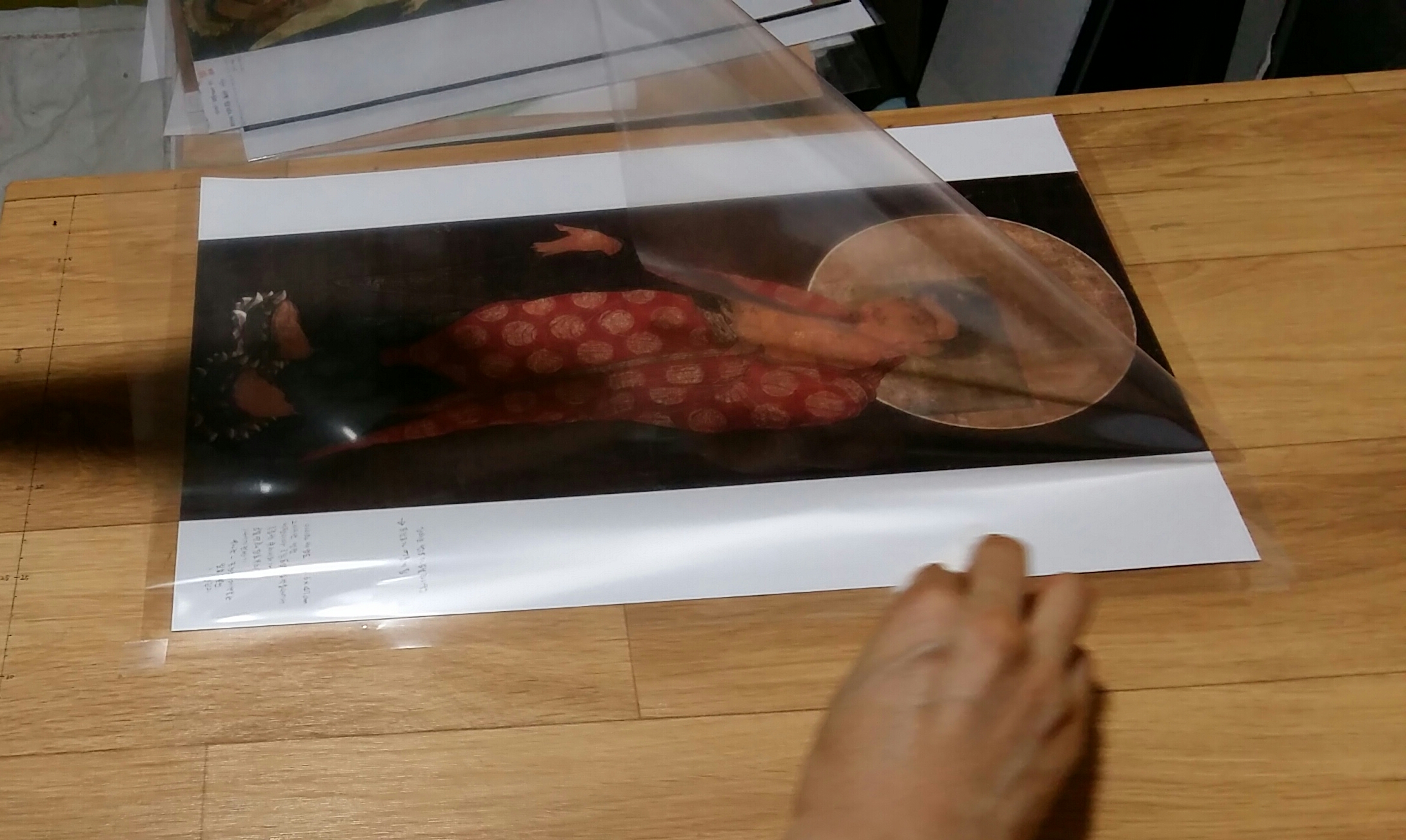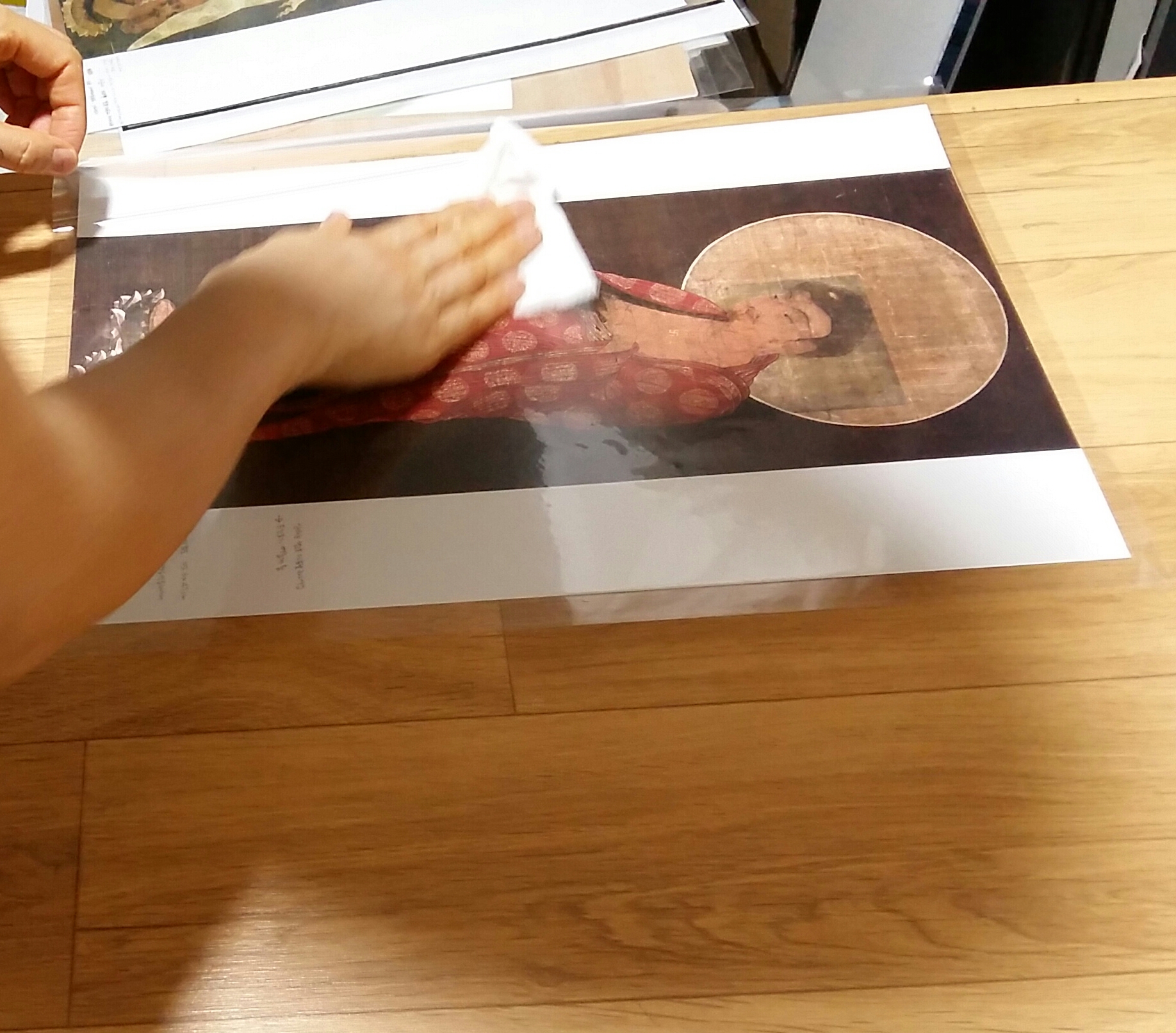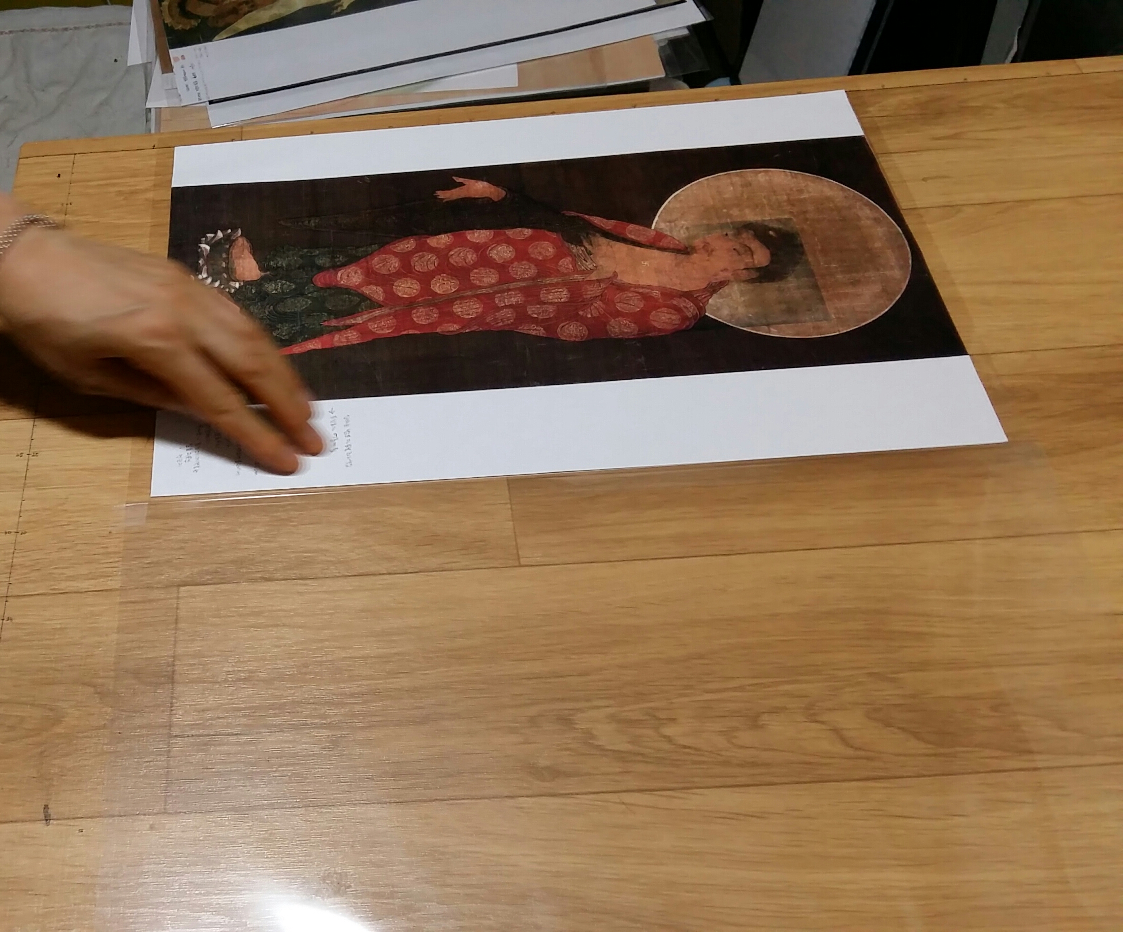 그림을 치우고 얇은 코팅지를 벗겨 냅니다.