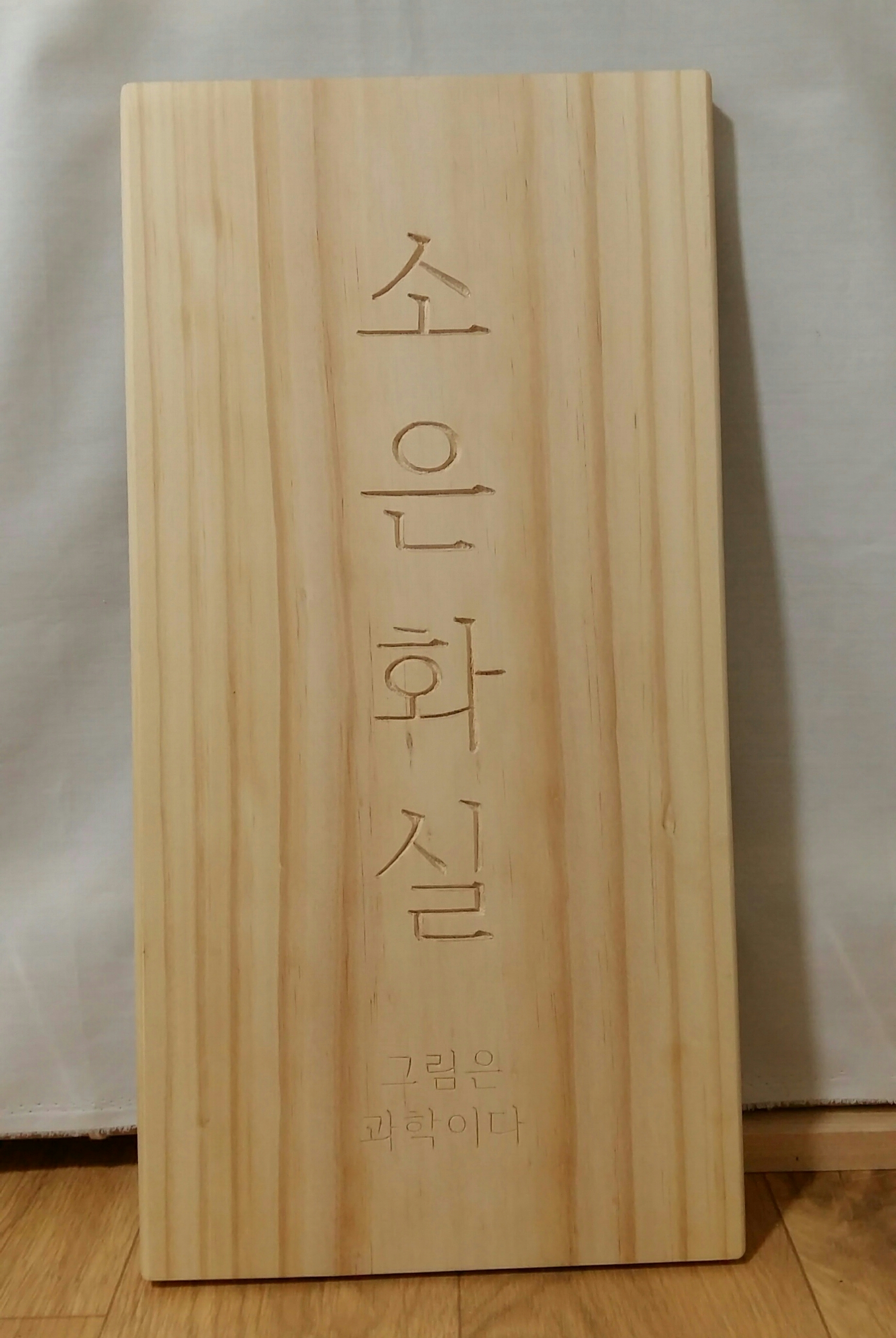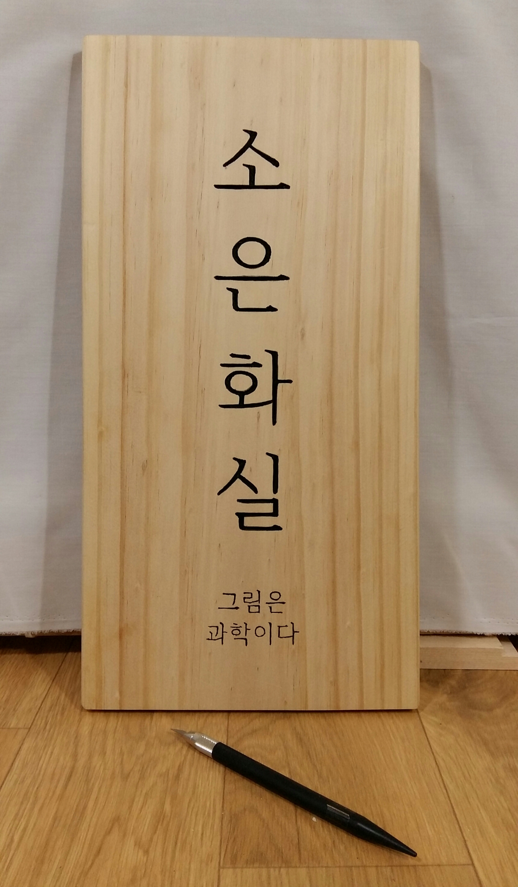 그리고 아크릴 검은색으로 붓으로 글씨를 만드는데 생각보다 어려웠습니다. 물감이 걸죽하고 물타면 번져서 원액으로 하는데 밖으로 삐져나가서 시간이 많이 걸렸습니다. 할수 없이 마른 후 글씨 주변을 사포질을 하였는데 사포의 검은색이 나무에 번졌습니다.