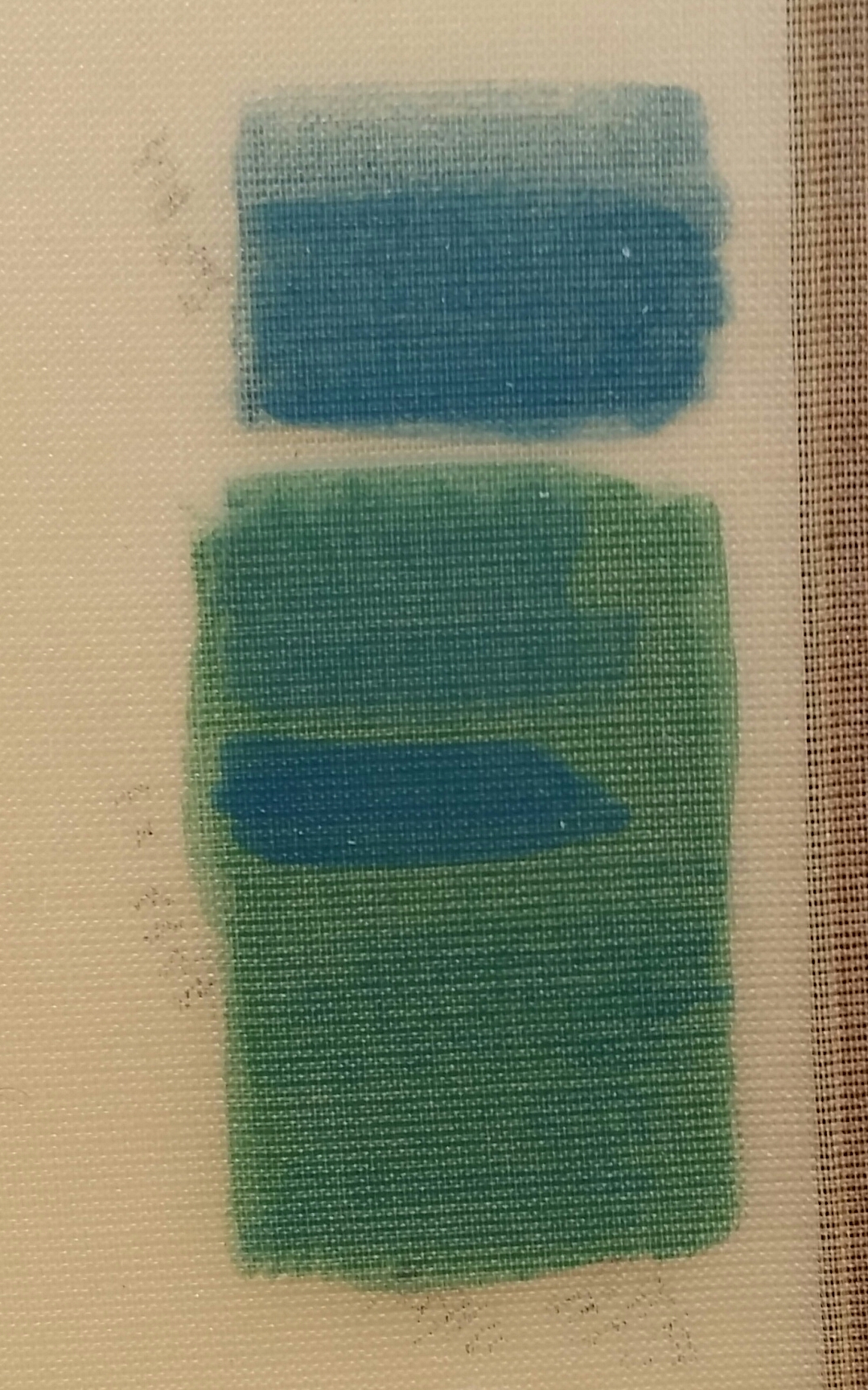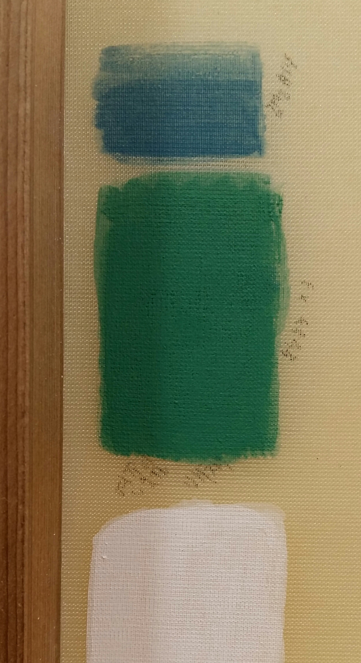 석채를 충분히 올리기 위해 오간자 3합을 사용하였습니다. 오간자 3합 비단을 수세하고 염색한 후 틀에 붙입니다. 교반수를 칠할 때 중앙으로 몰리는 현상을 해결하여 비단에 고른 두께로 교반수가 칠해지도록 합니다.