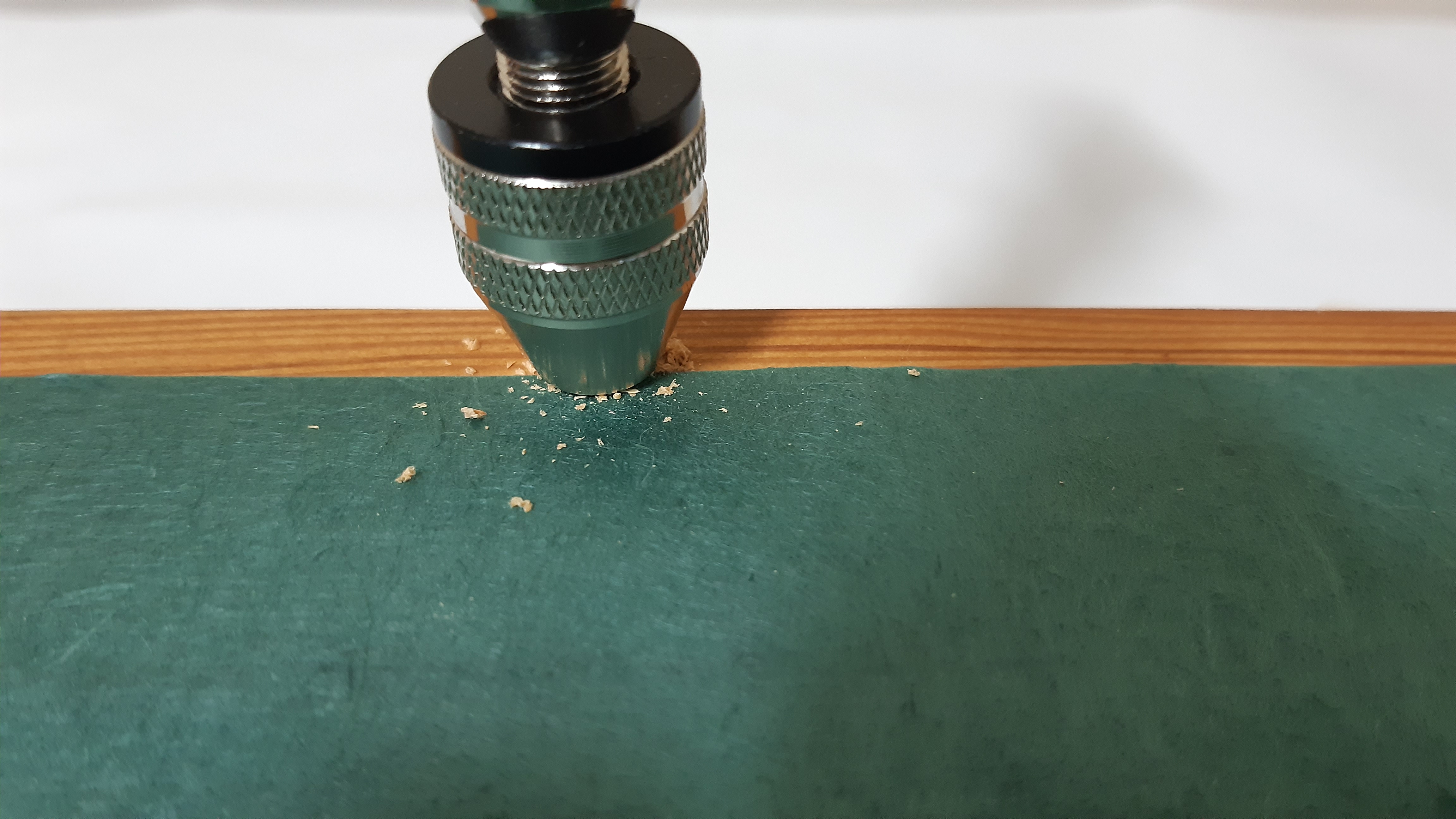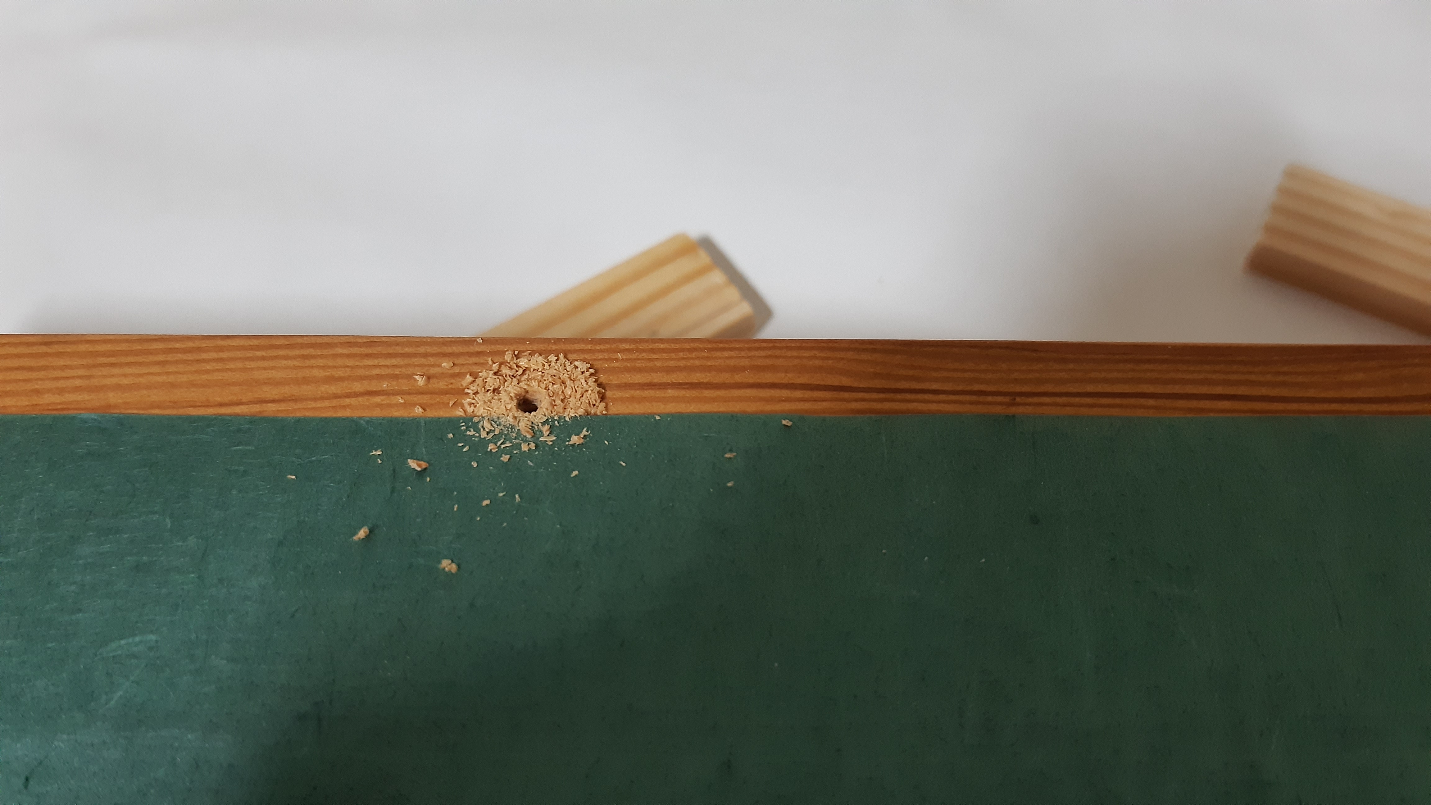 나사를 박다가 후레임 나무가 갈라지는 것을 방지하기 위해 핀바이스로 먼저 나무에 구멍을 뚫습니다.