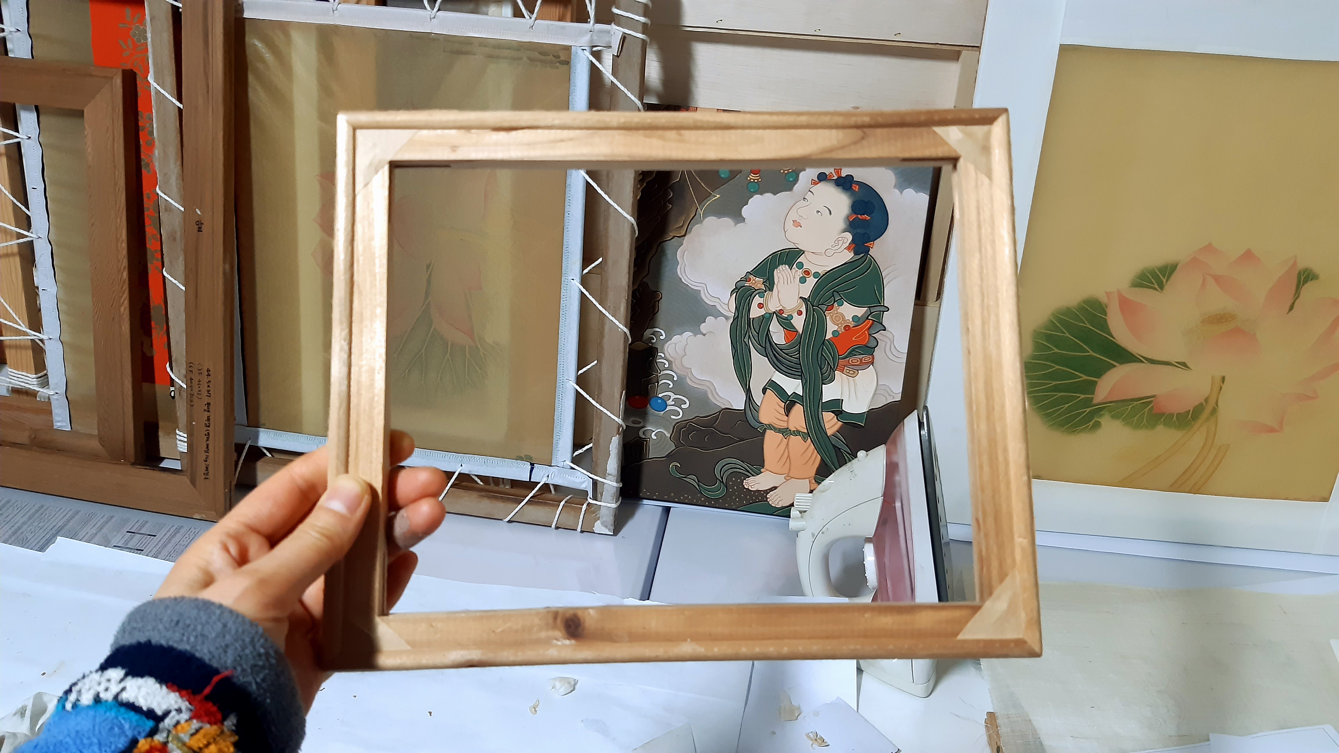 틀 : 다이소 22×27cm 캔버스 구입, 천을 뜯어내고 비단을 붙입니다.