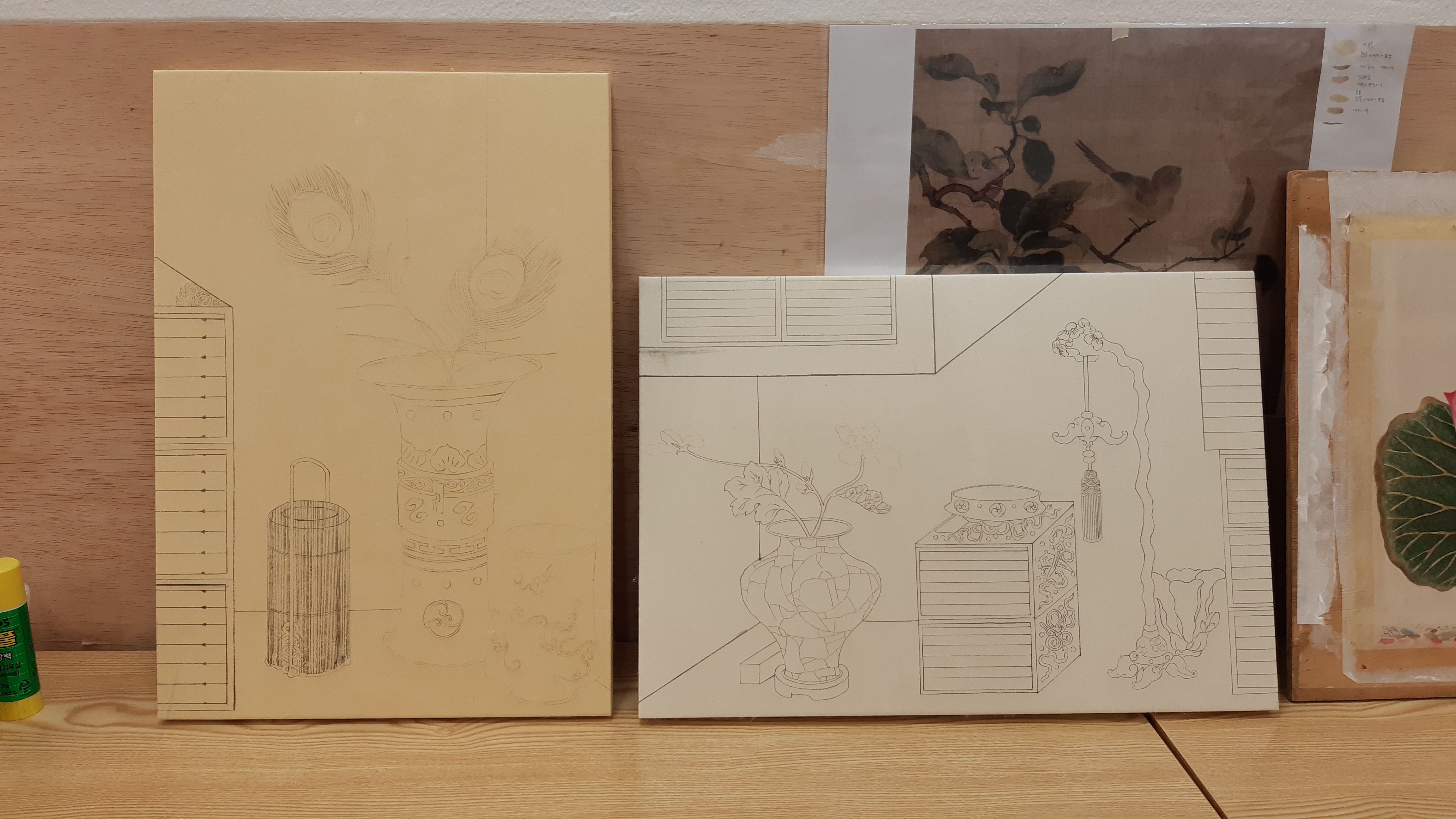 두 그림은 배접하여 보관할 용도로 건조판에 붙였고 하나는 판넬에 붙였습니다.