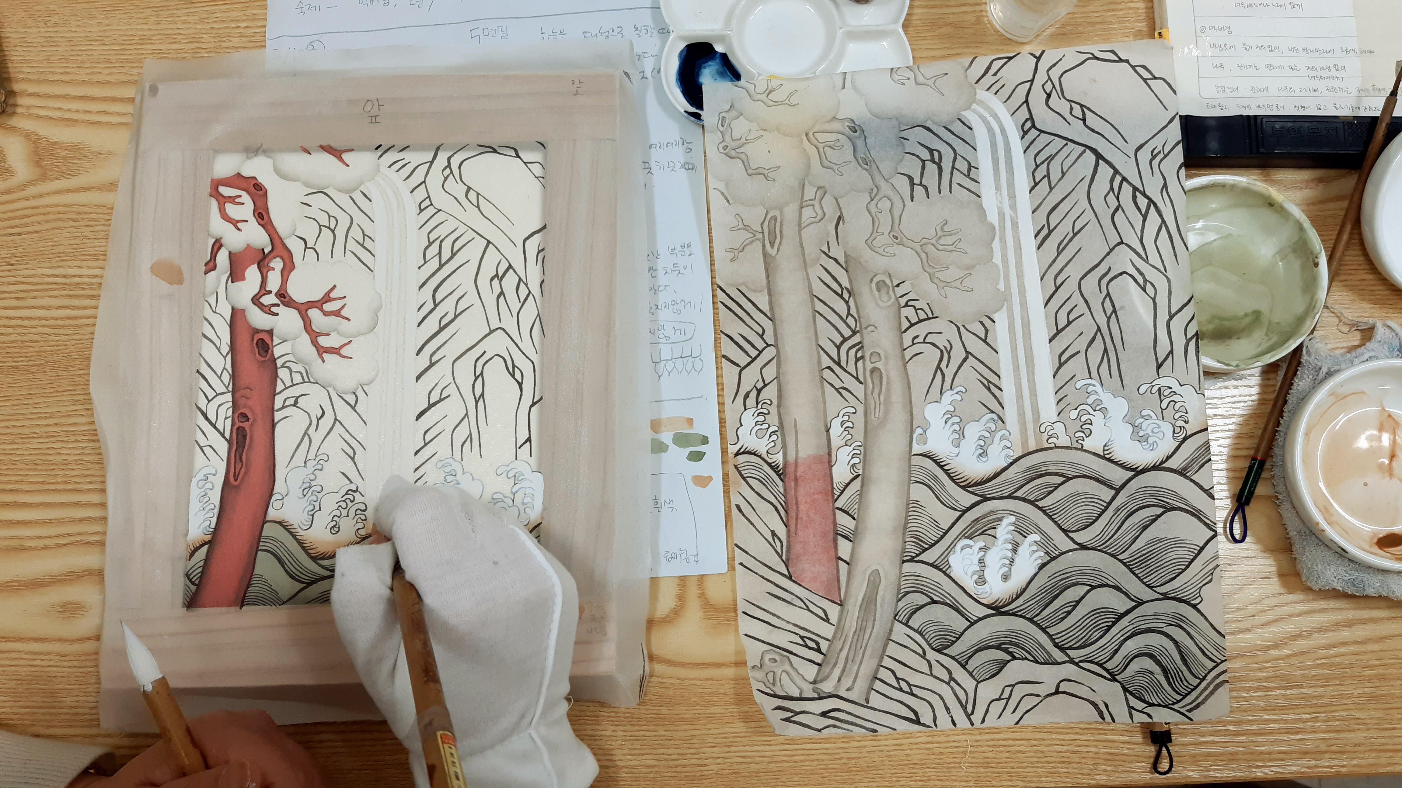 한 분은 송지방 2합 비단으로 (10호), 한 분은 좀 더 두꺼운 한지마트 비단을 (20호) 바탕재로 사용합니다.