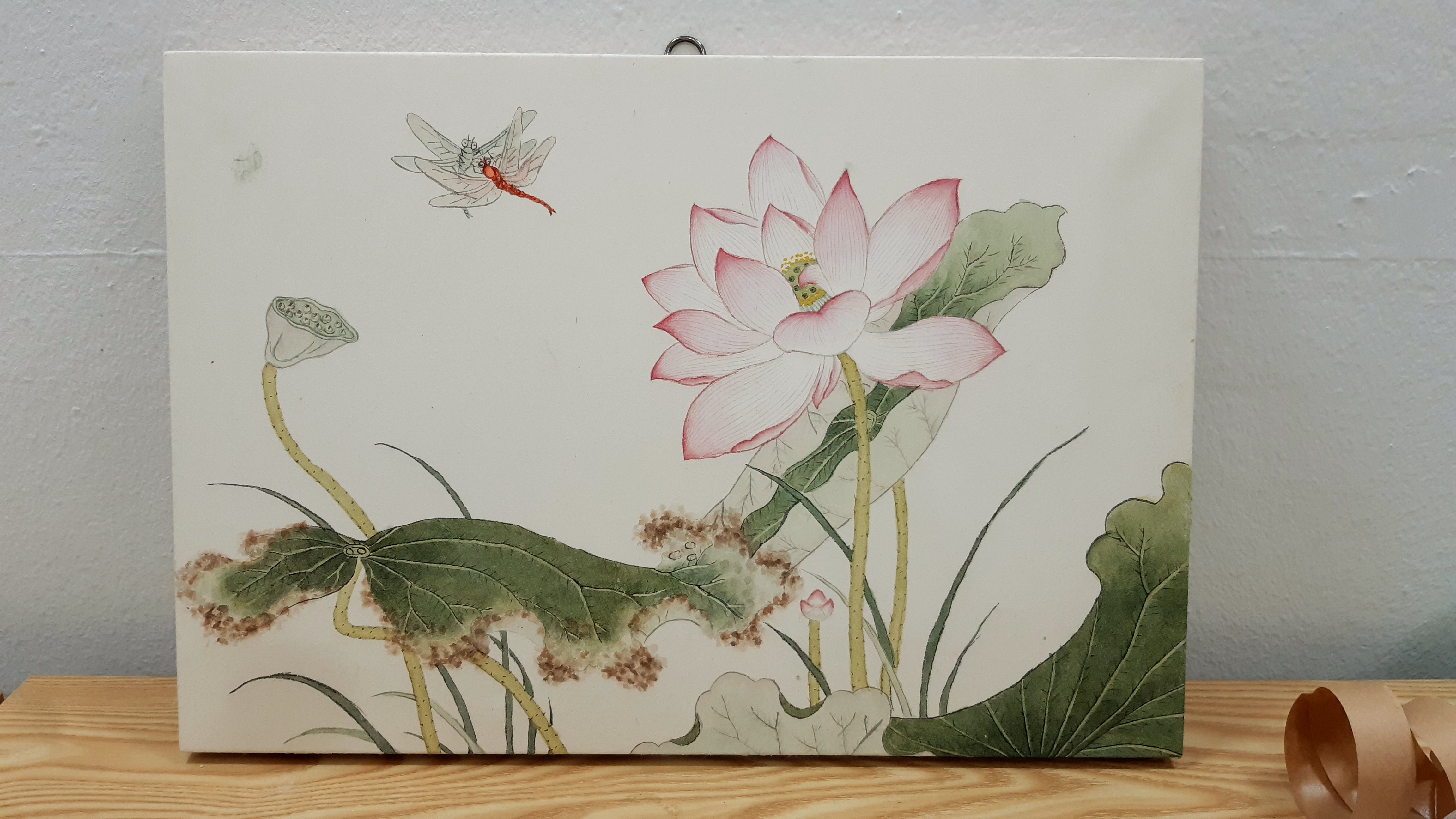 바탕을 원하는 색으로 염색하고, 여러가지의 흰 안료를 연구하여 그림에 맞는 것을 선택하여 그림을 완성 하셨습니다.