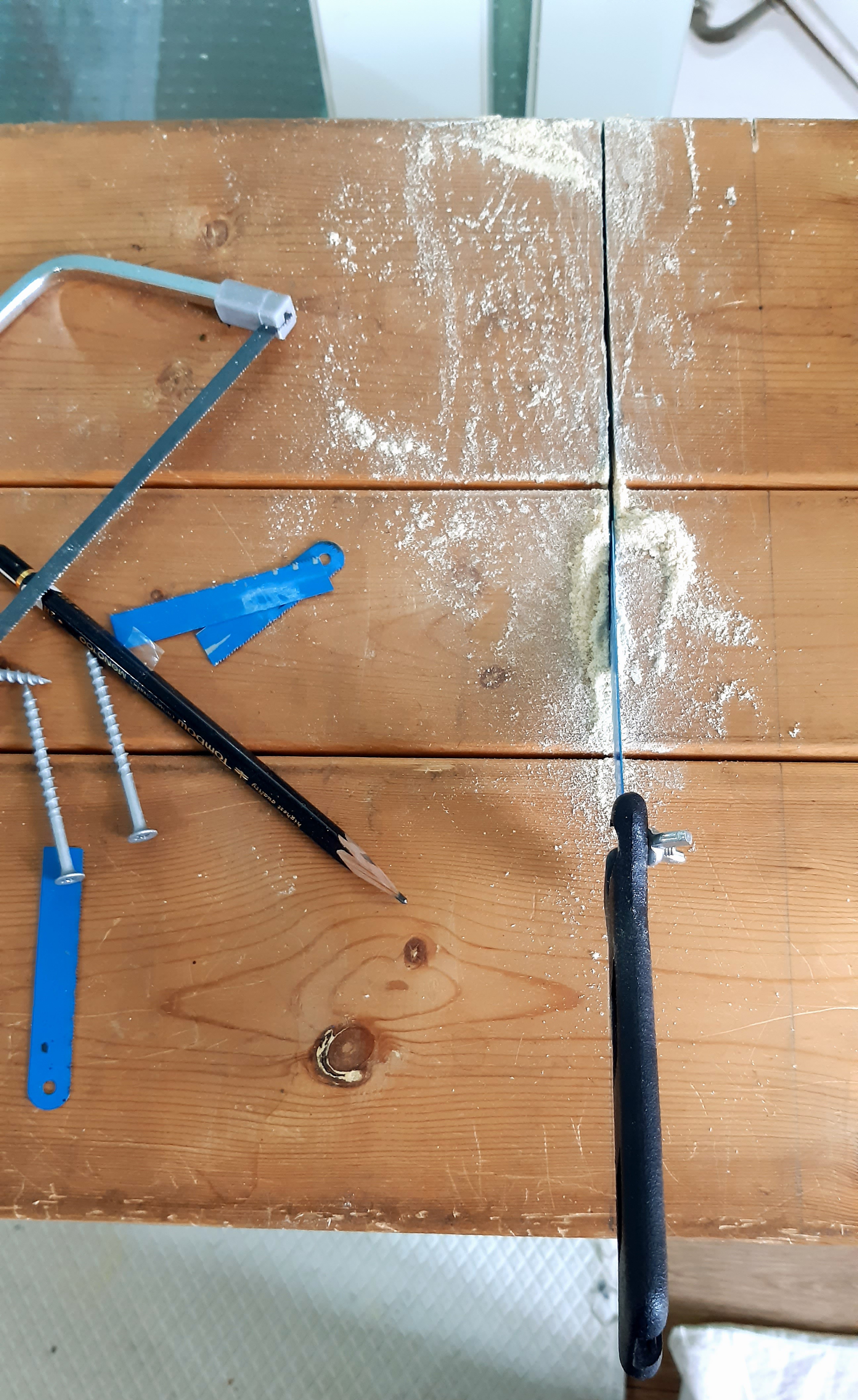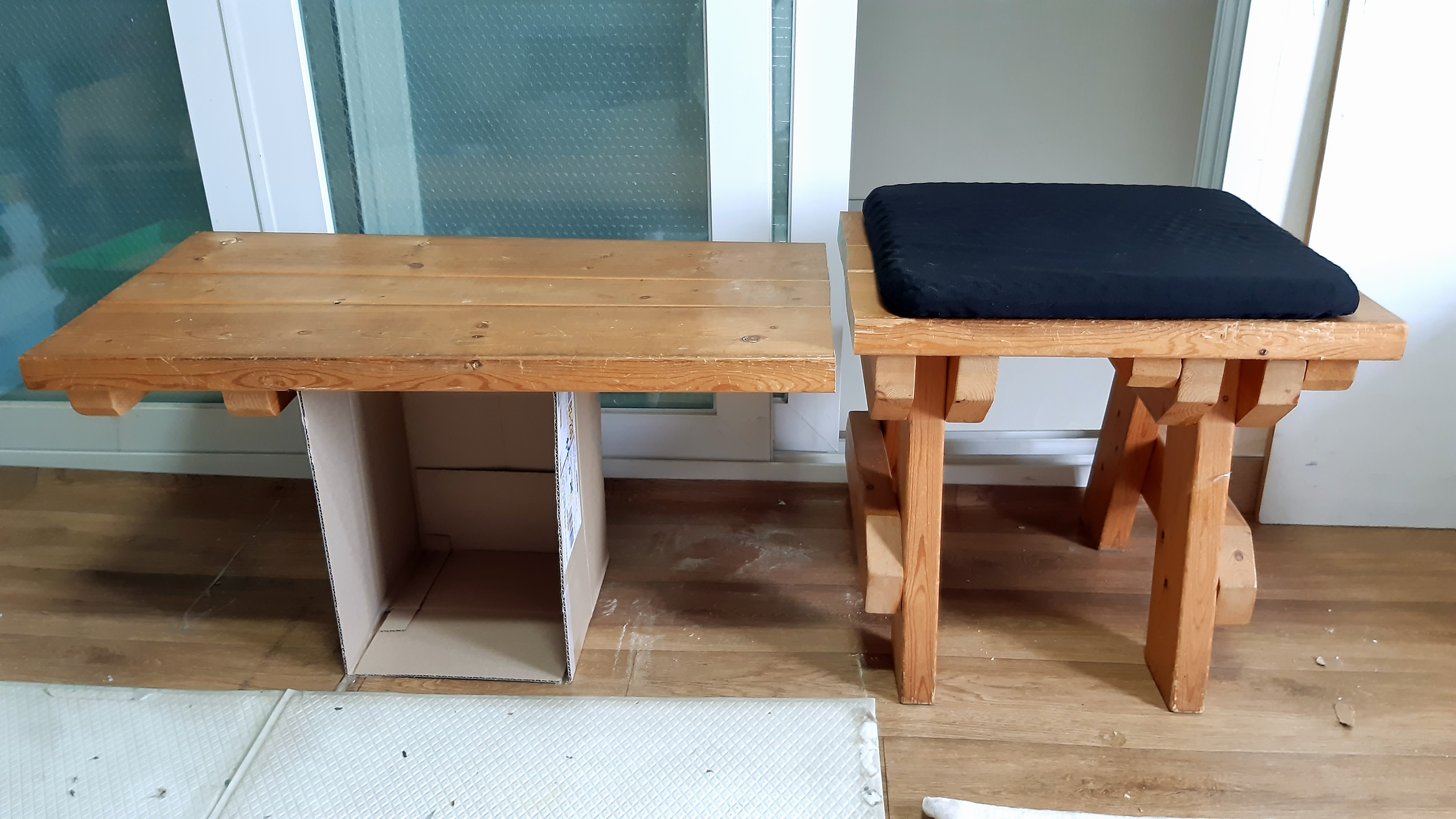 파는 의자는 없고 맞춤구입 해야 되는 상황이었는데, 마침 가지고 있던 정원용 긴 나무의자가 높이가 맞아서 잘라서 개인 의자를 만들었다.