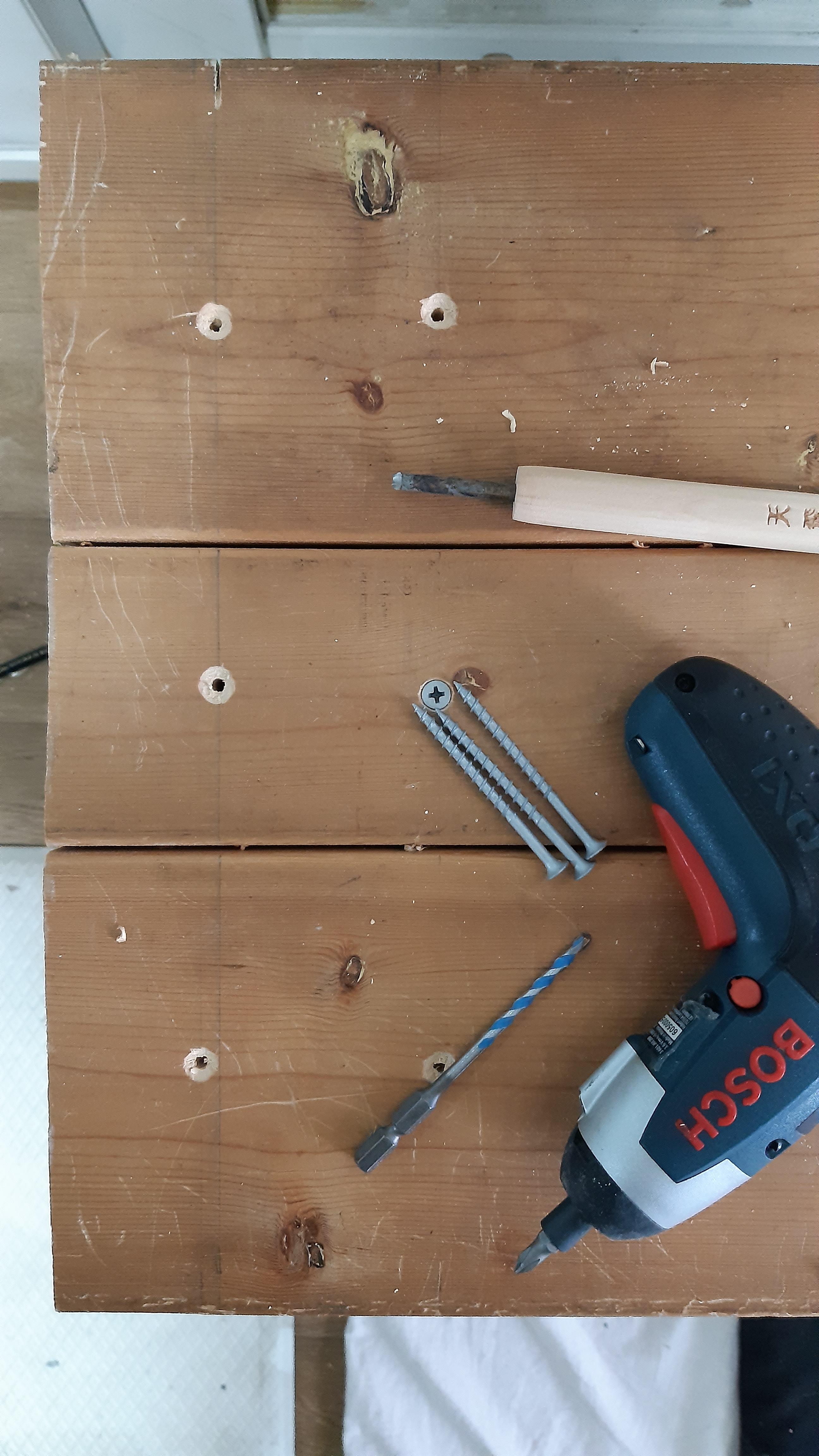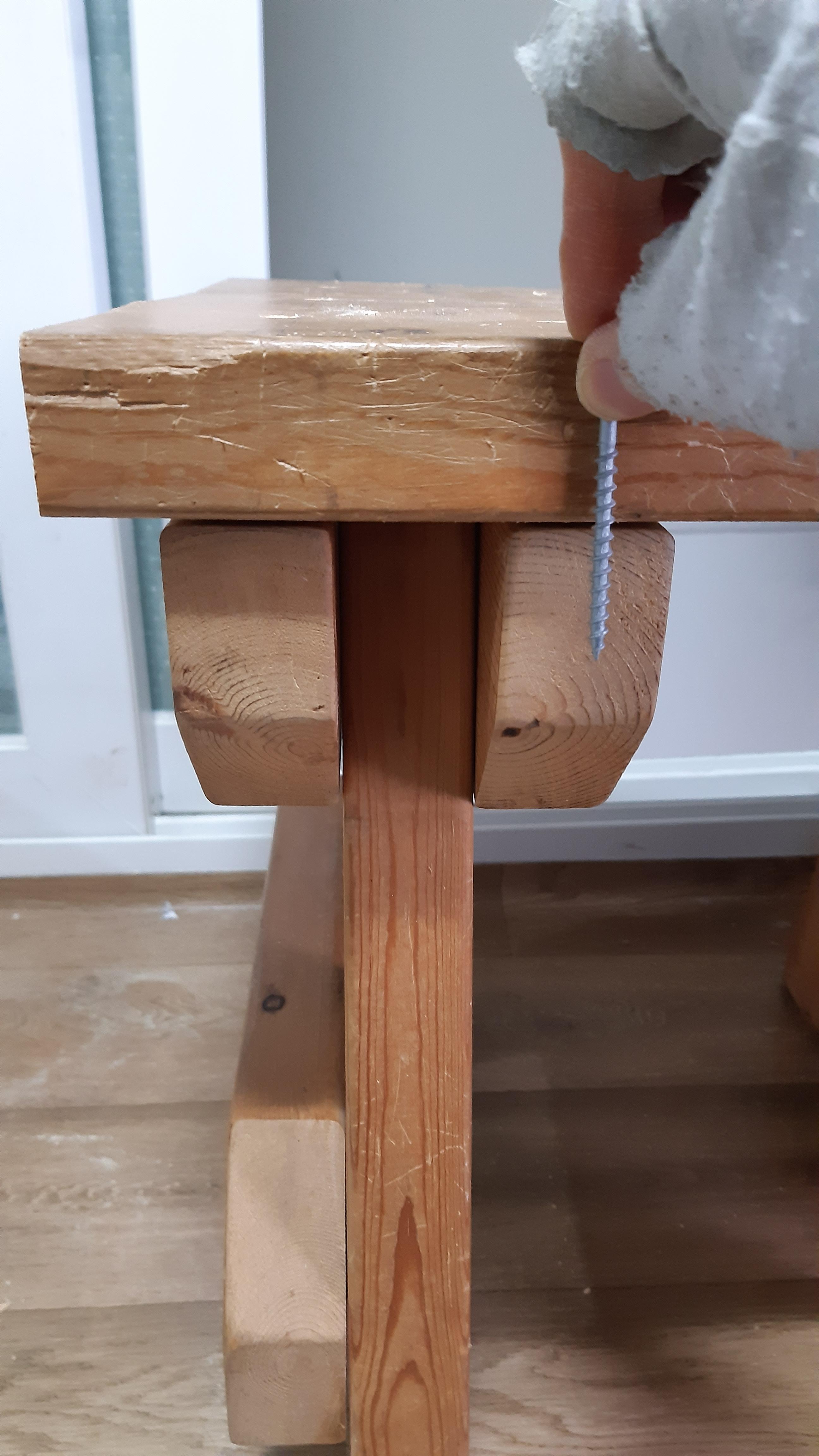 두꺼운 나무에 이렇게 긴 나사못을 박을 때는 *힘주어 *누르면서 박아야 한다. 그냥 박으면 두 나무사이에 공간이 생겨 의자 높이가 달라진다.