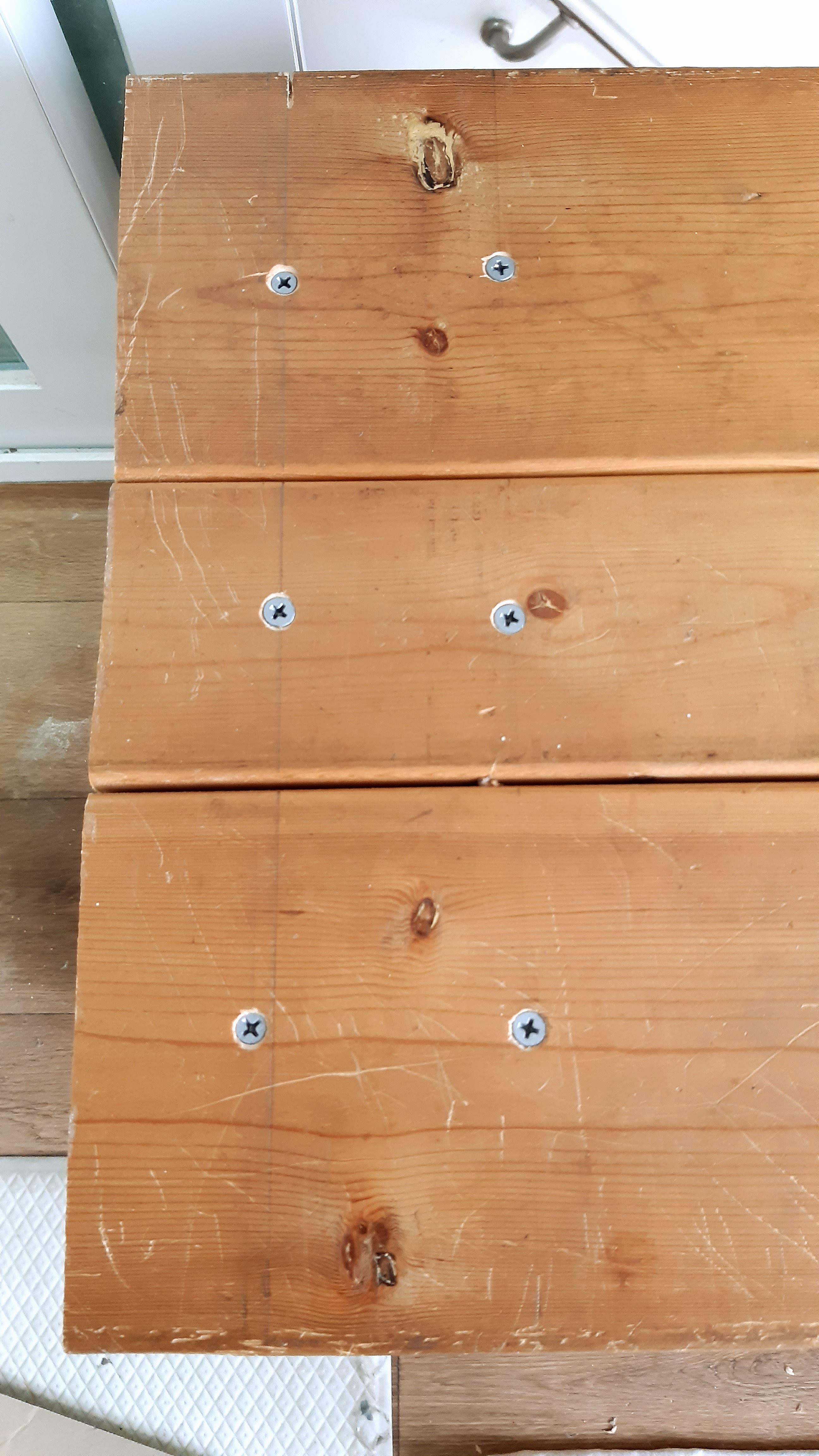 자르기 전에 사진을 안찍어서, 자른 후에 맞춰놓고 사진을 찍었다. 의자 다리가 있던 부분에 두 개의 지지대는 못으로 박혀 있어서 빼낼수가 없었다.