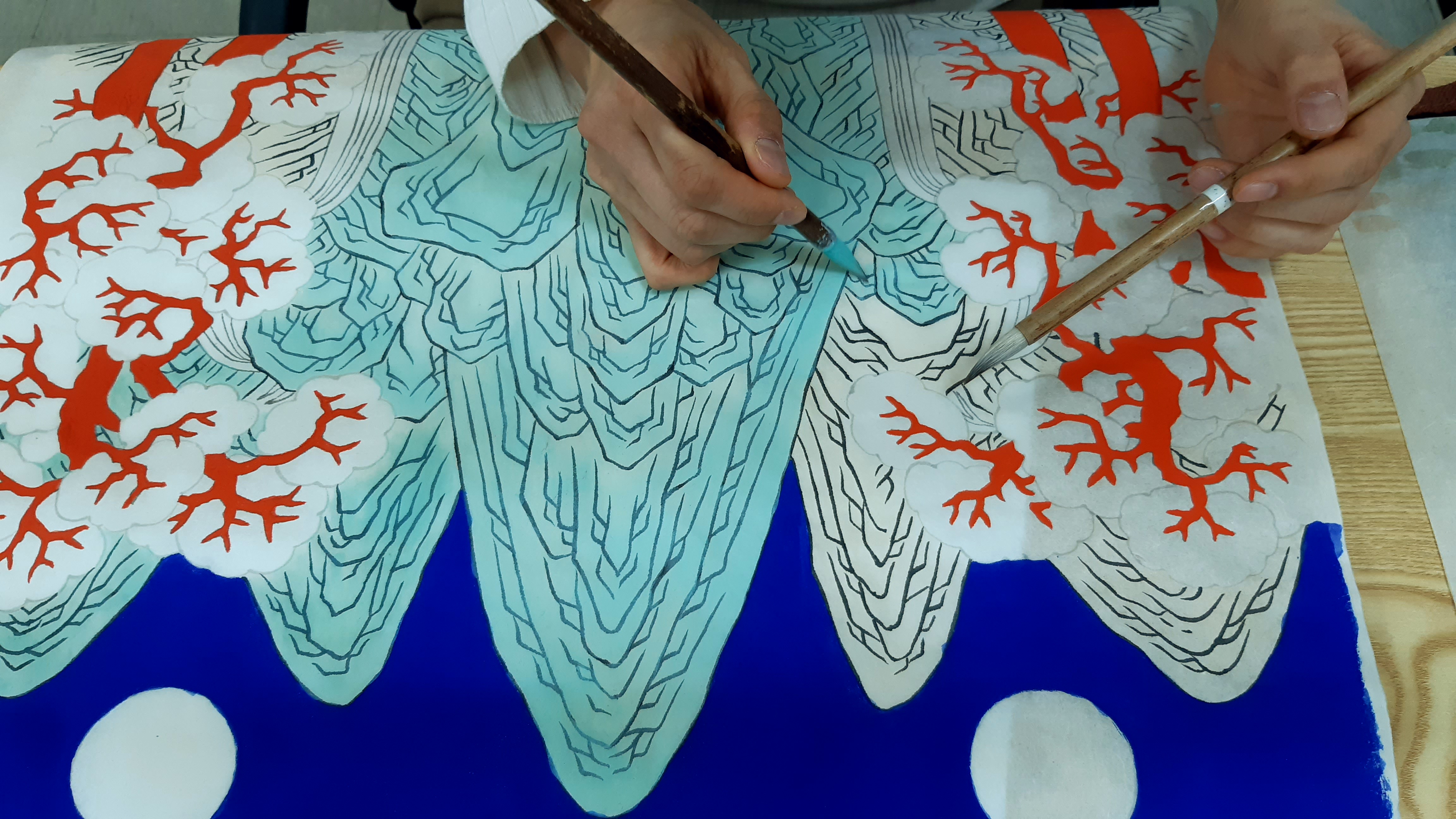 순지에 세 분 진행하고 있는데, 신한 한국화 튜브물감과 분채로 채색하고 있습니다.