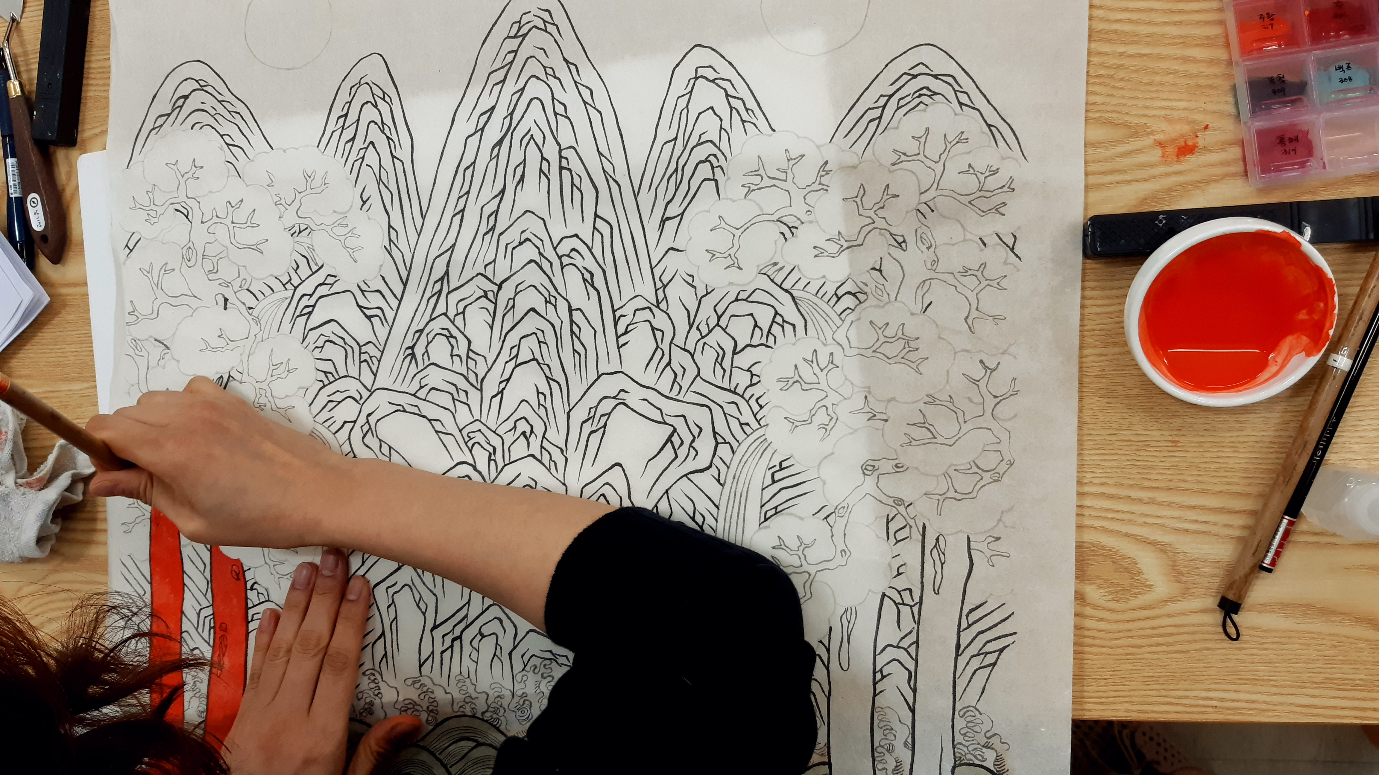 일월오봉도를 채색 하면서 나무와 바위의 윤곽, 덩어리 개념을 알게 됩니다.