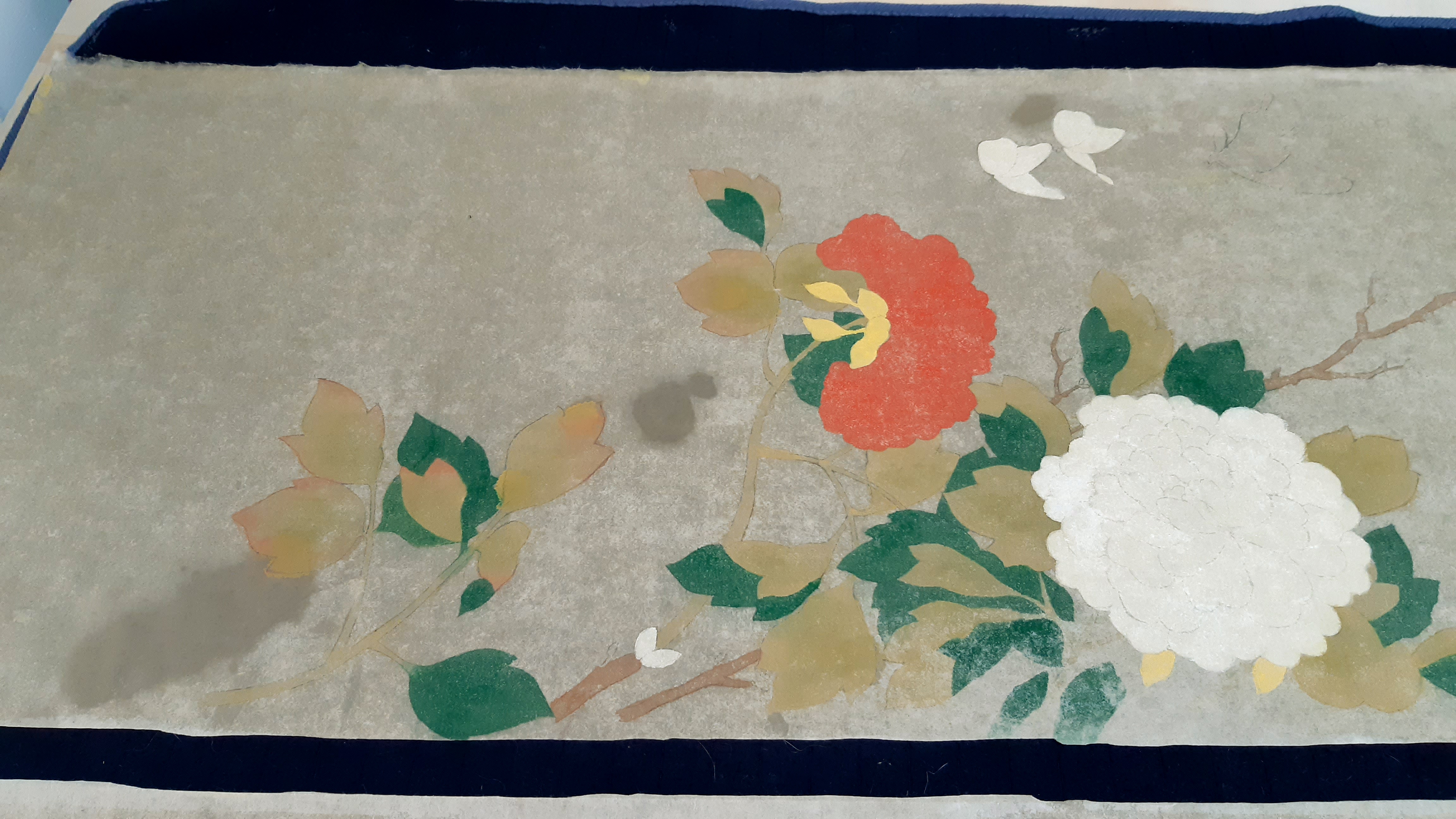 채색을 중단하고 뒷면에 1.5% 교반수를 도포하였습니다.
