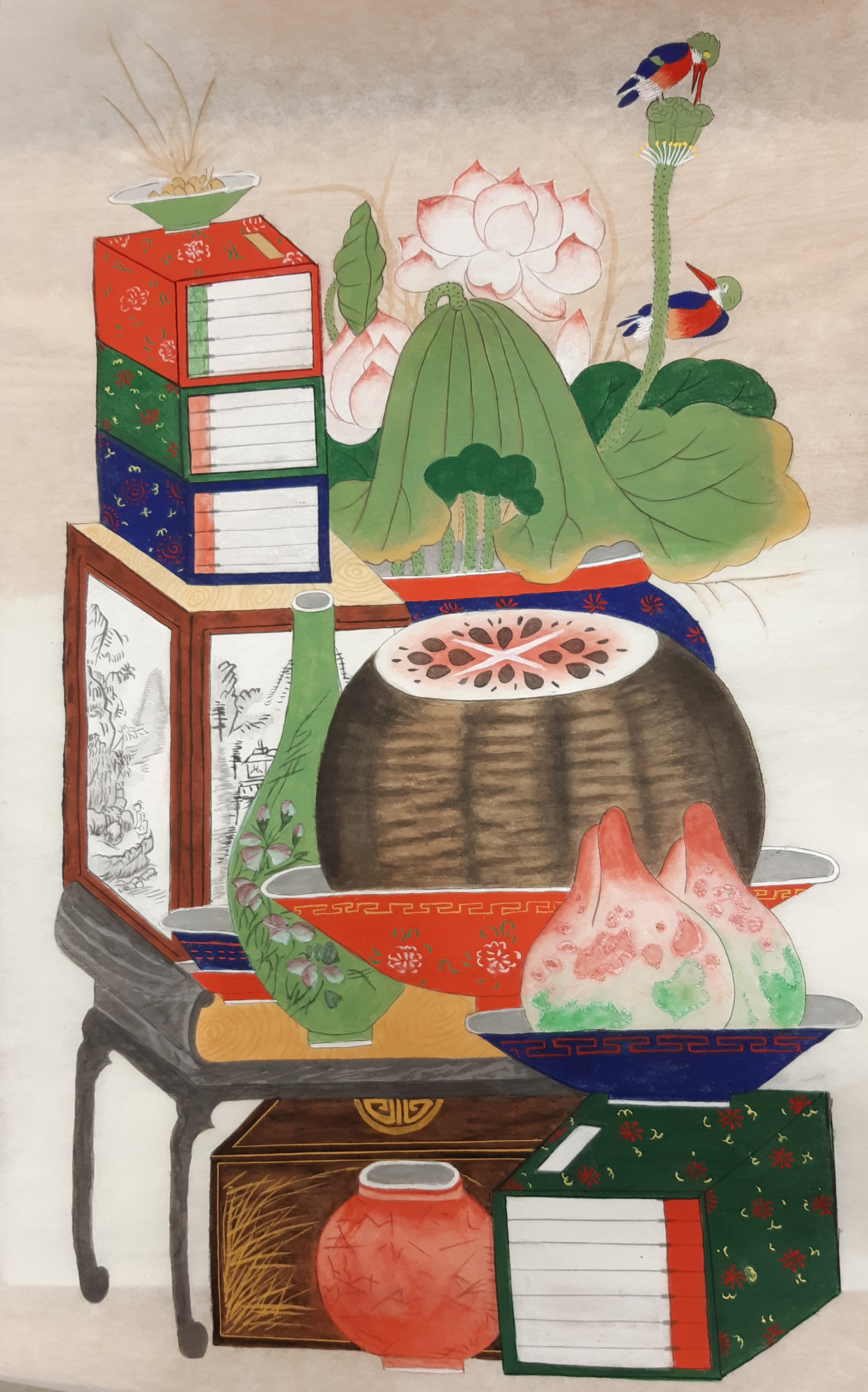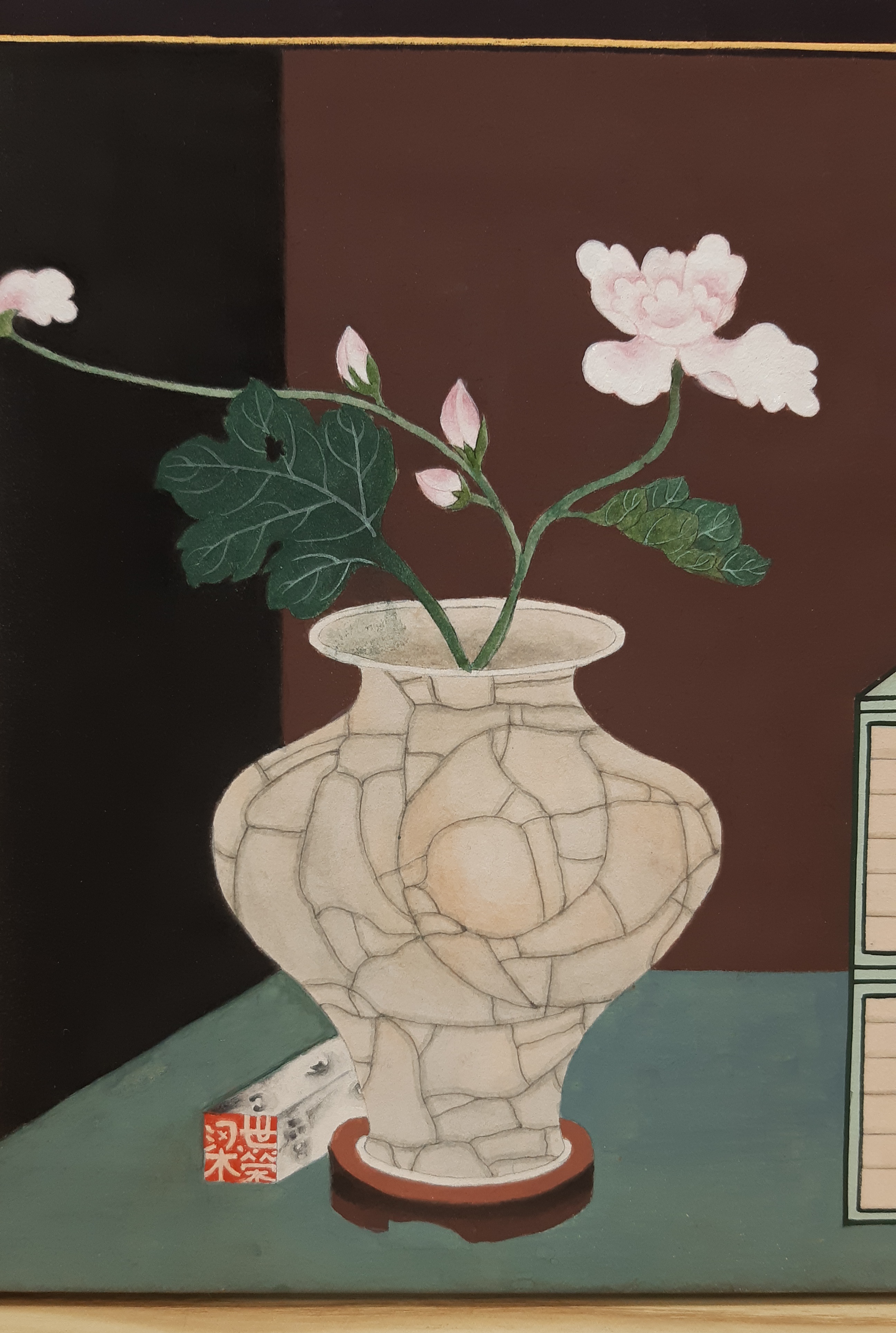 워낙 얇게 물감을 잘 올리셔서 옻지의 바탕색이 전체적인 색감을 차분하게 만들어 줍니다.