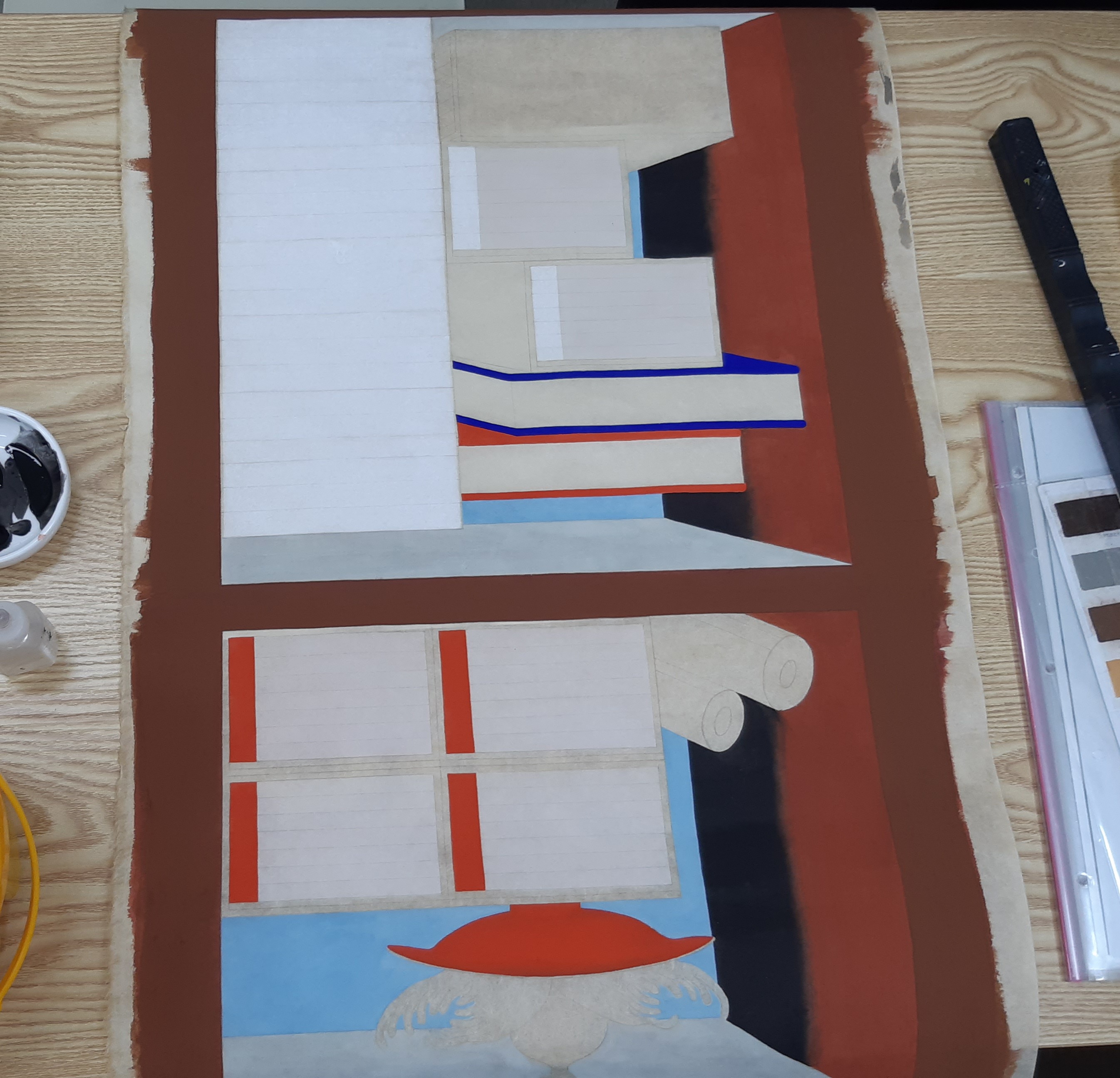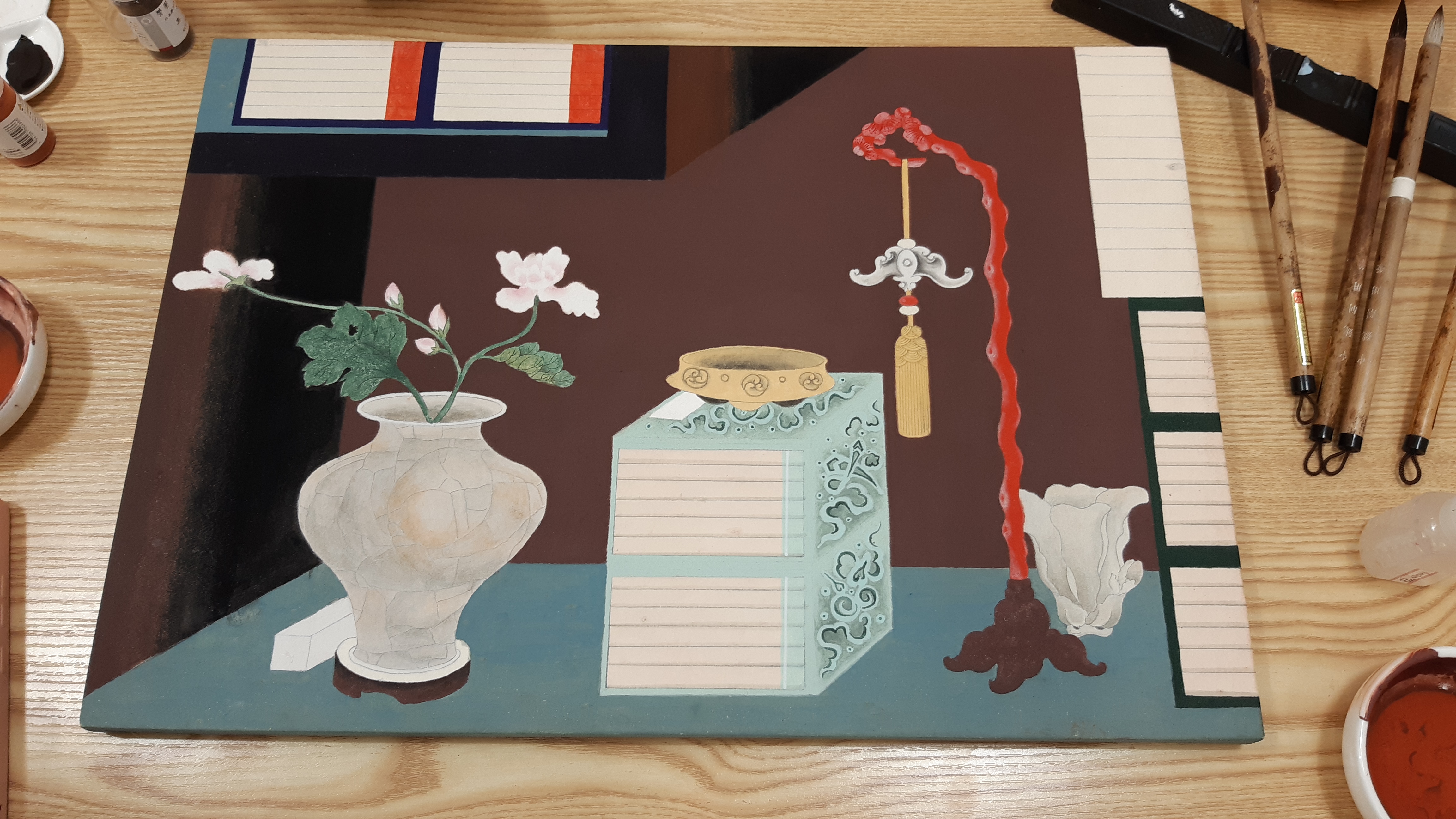 물감을 밀도있게 충분히 올리기 위하여 배접하여 판넬에 고정한 후 채색을 하고 있습니다.
