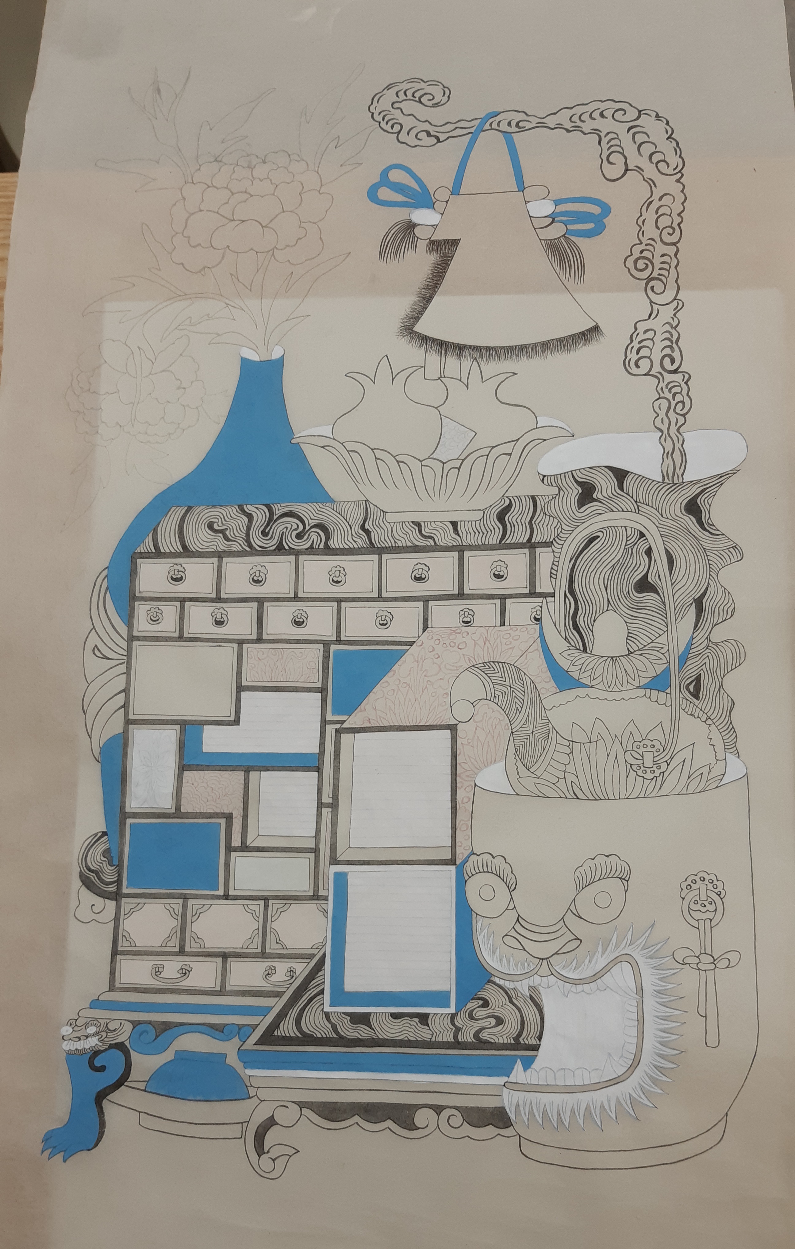 운현궁 책가도를 옻지에 작업하고 계십니다.
