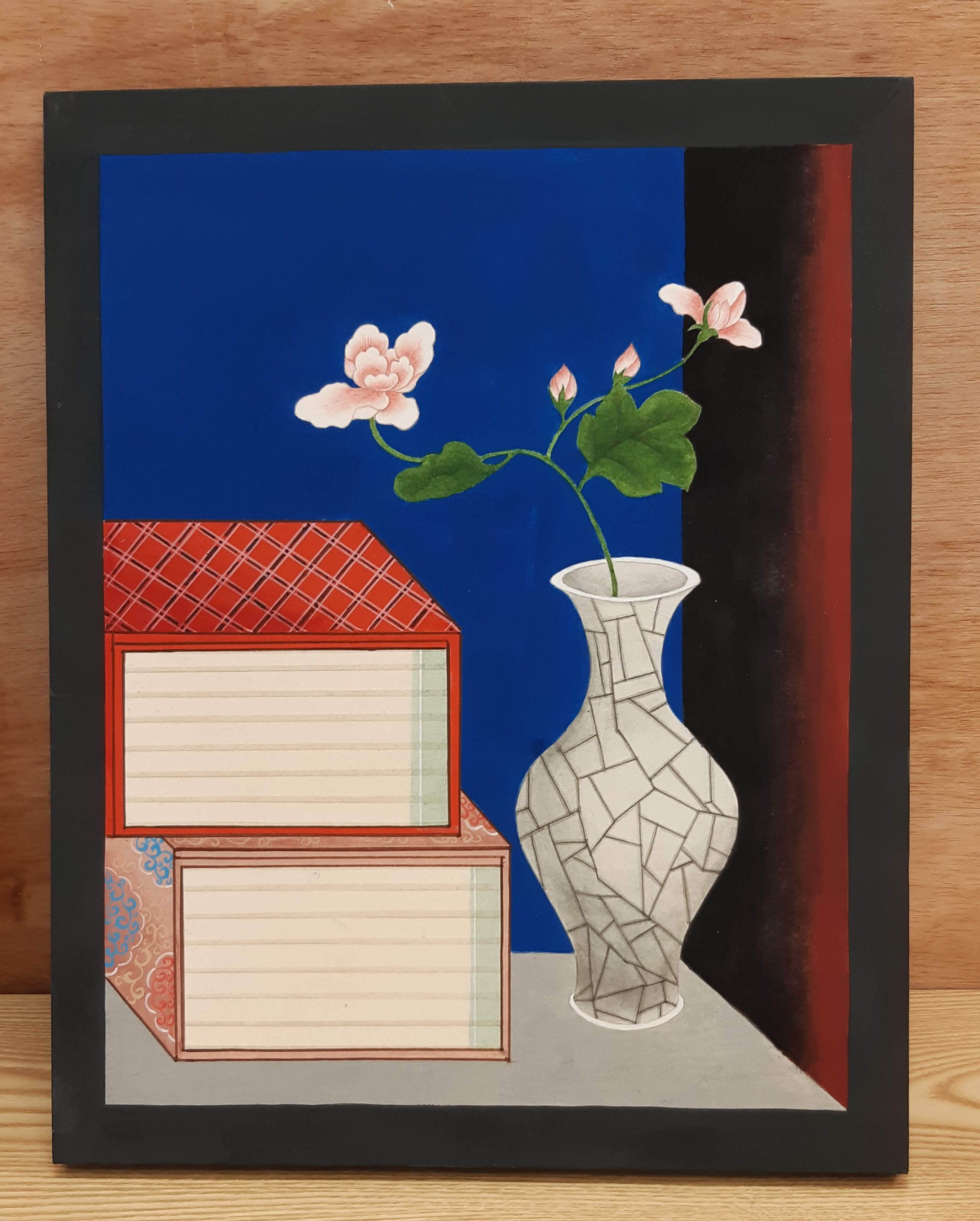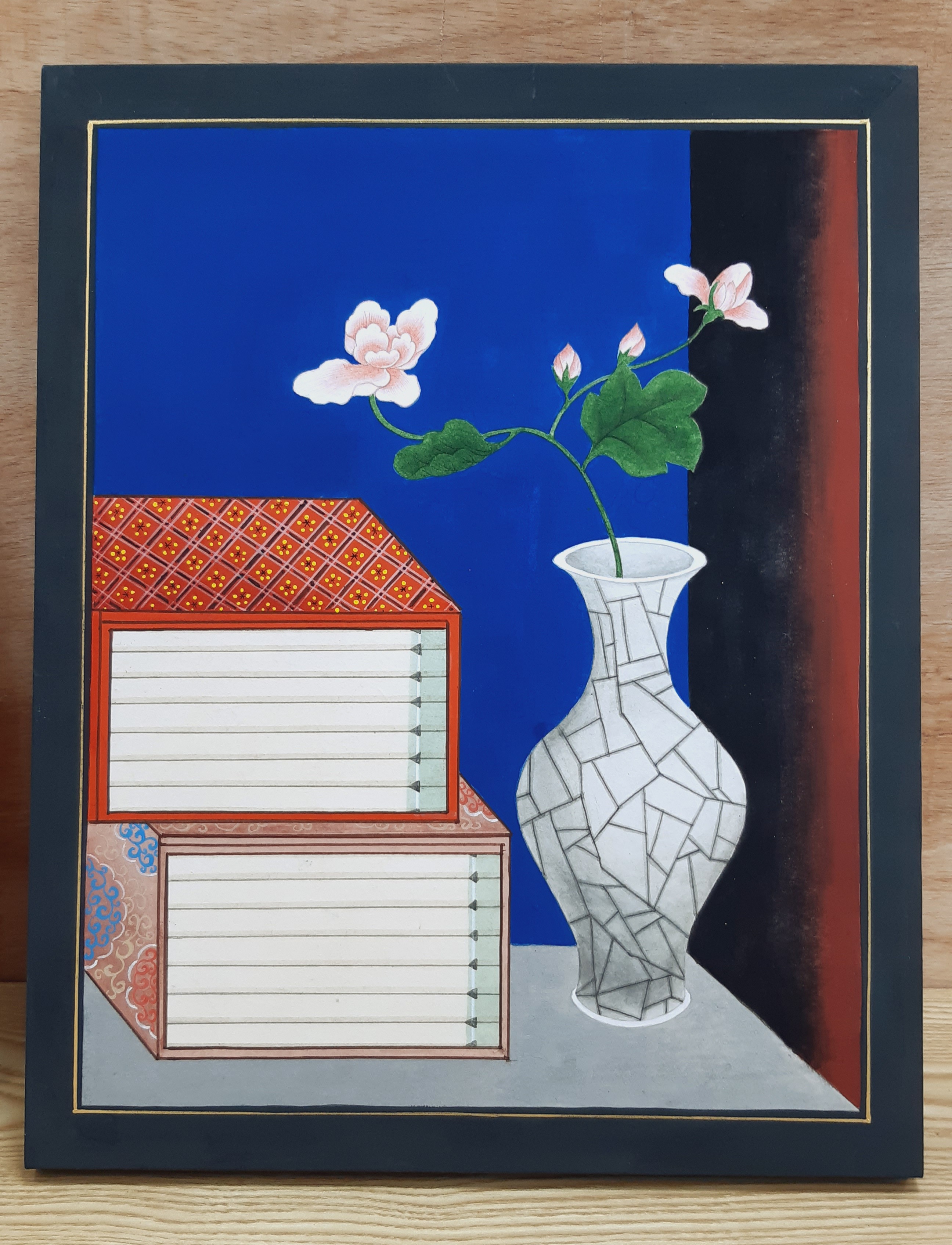 진채 책가도는 채색을 상대적으로 두껍게 올리기 때문에 바탕재를 배접하여 판넬에 고정하고 채색 합니다.