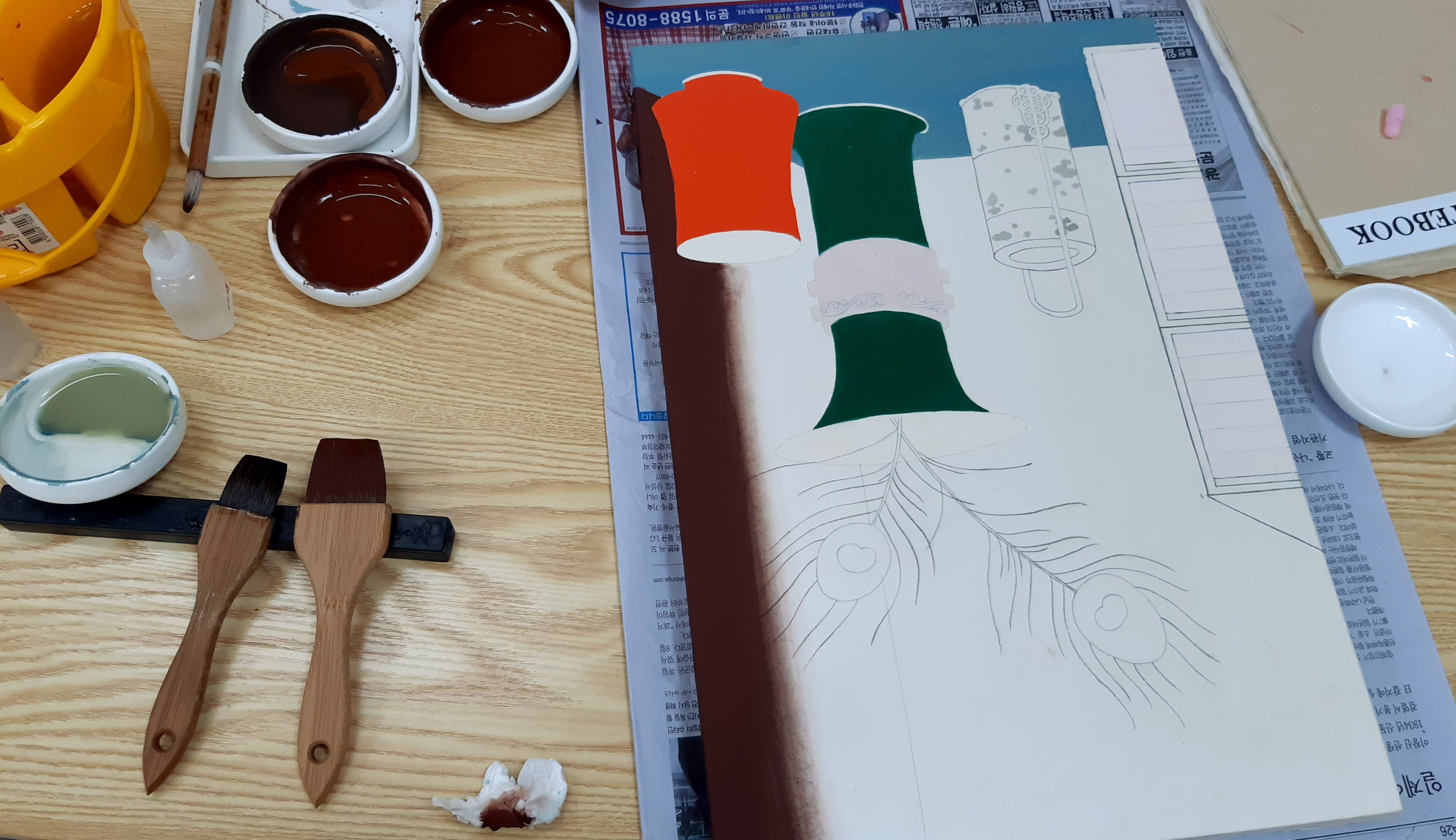바탕색을 얼룩 없이 칠하기가 쉽지 않으며, 어느 정도 두껍게 올리는것이 적당한지 감을 익힙니다. 너무 많이 올라갔으면 넓은 붓에 물을 묻혀 붓질하여 닦아냅니다. 바탕재가 견딜 수 있을 만큼만 물붓질을 합니다.