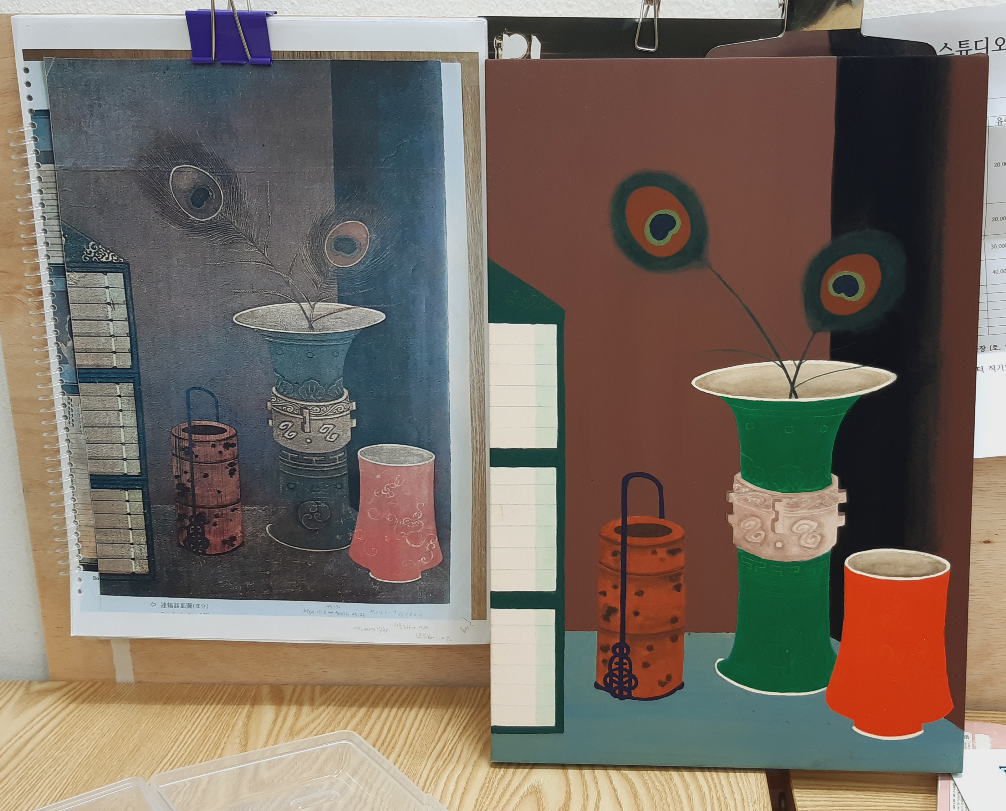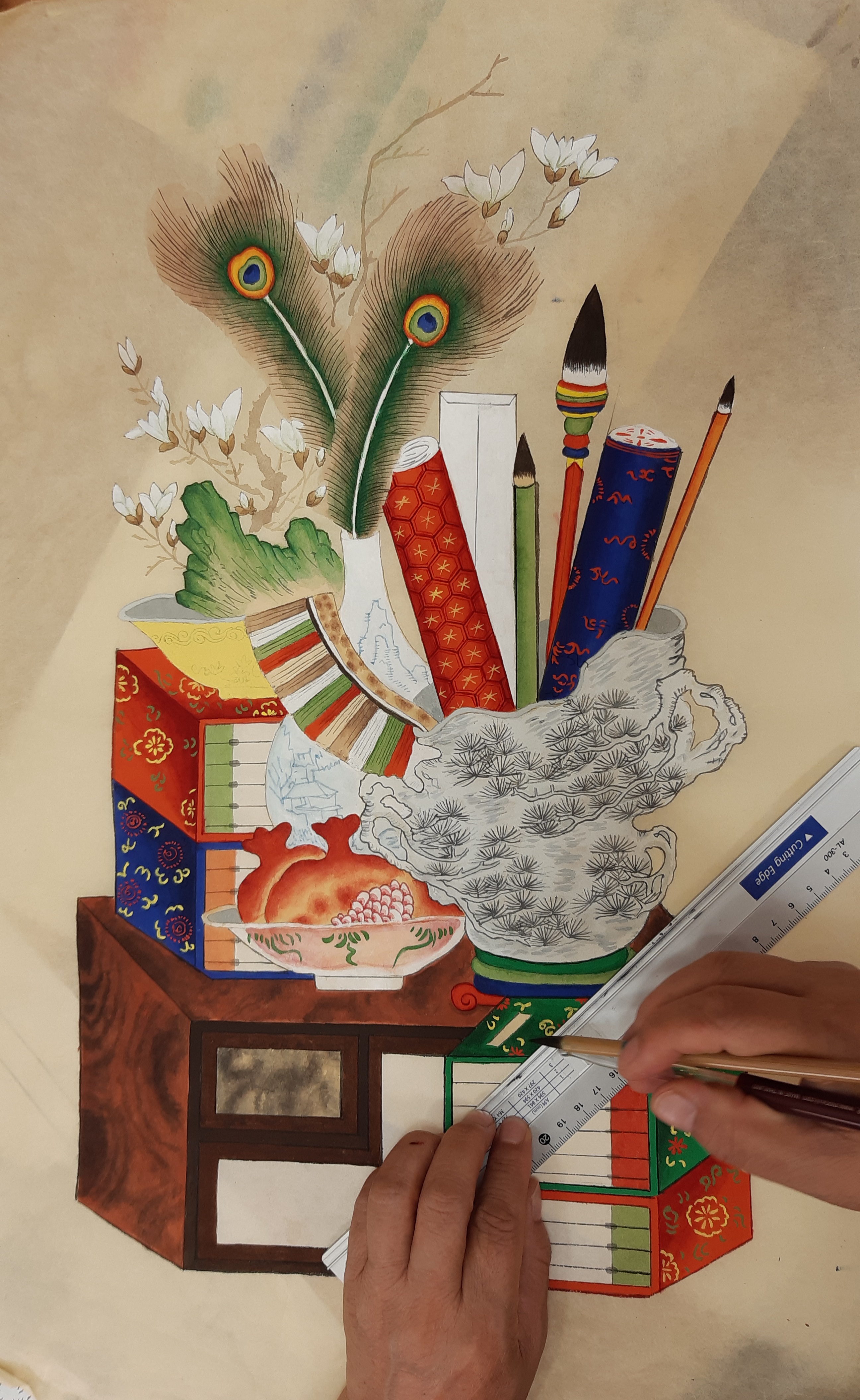 어르신이 작업하고 계신 리움 미술관 소장 책거리도 입니다. 진채에 비해 물감을 얇게 칠하는 민화 책거리도는 바탕재를 말아서 가지고 다녀도 무방합니다.
