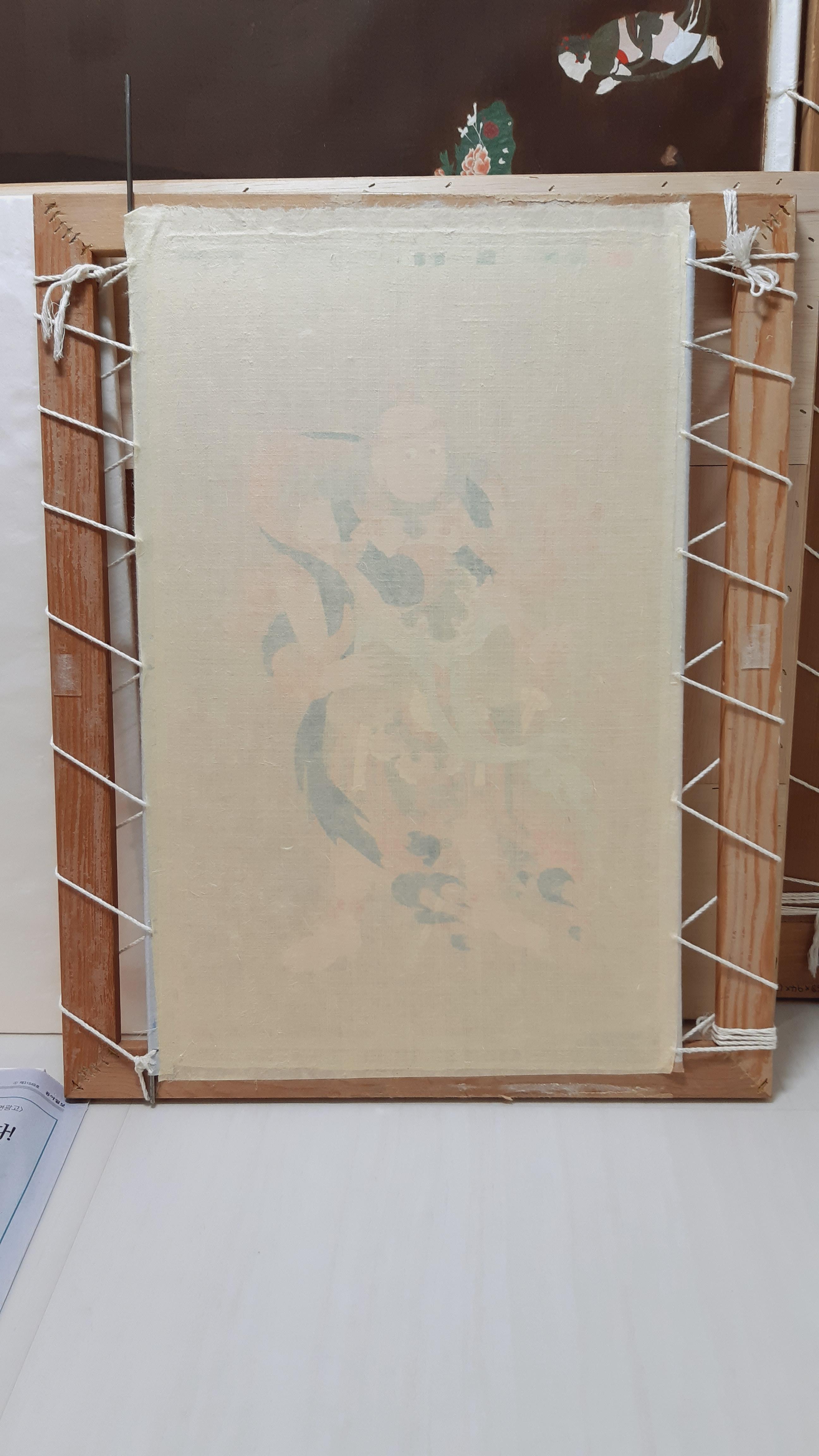 삼베는 올 풀리기 쉬우므로 그림을 자르지 않고 2면은 변사의 올풀림이 방지된 부분, 2면은 배접 비단으로 연결해 놓은 그대로 박았습니다.