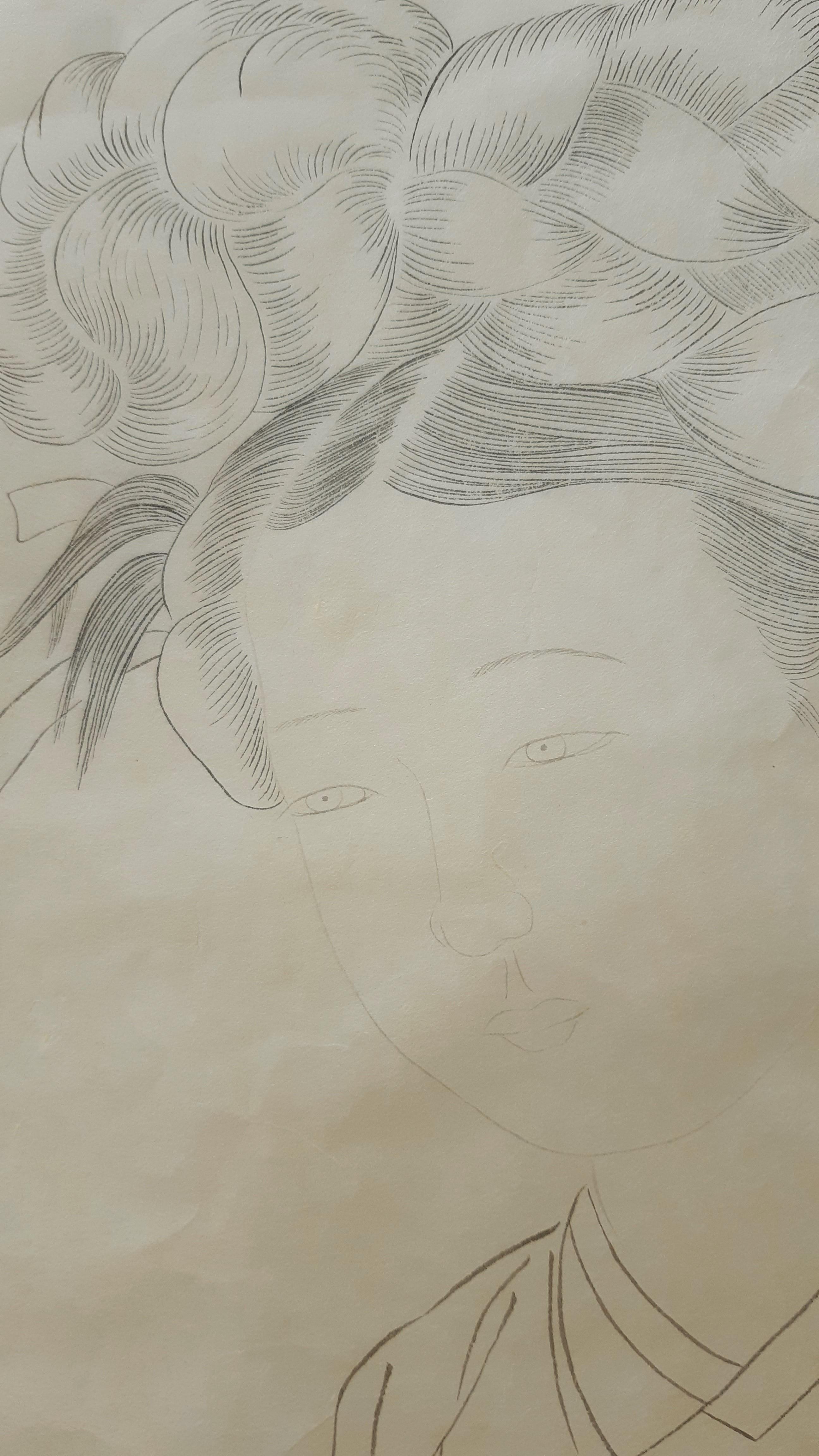얼굴 선 그리는 방법, 옷을 그은 먹선의 붓머리와 방향, 머리카락의 선을 찾아 연필로 본을 만듭니다. 그리고 먹의 농담과 굵기를 달리하여 먹초를 만드는 과정을 알려 드립니다. 초를 만드는 과정은 시간이 많이 걸리고 인내를 요하며 많은 것을 익히게 됩니다.