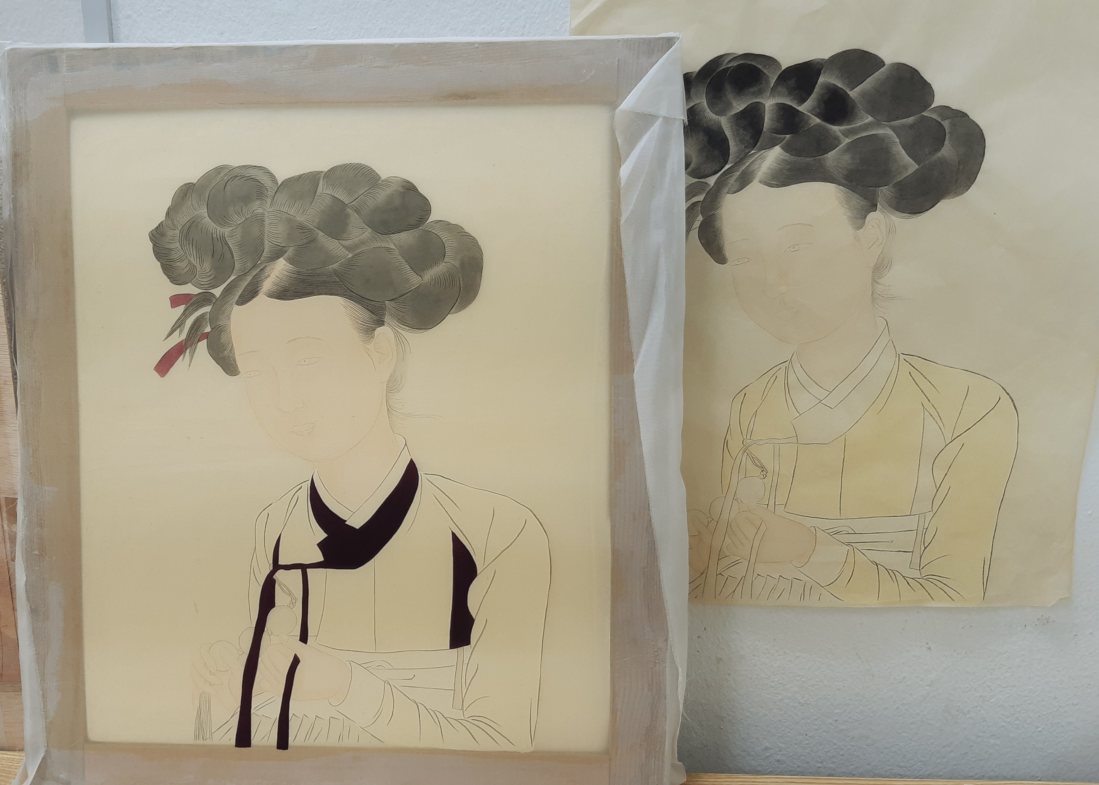 비단에 그리며 과정이 쉽지 않기 때문에 연습을 충분히 하고 작품에 임하기 위해 옻지, 테스트용 작은 비단 (3호나 6호), 작품용 비단 (10호나 15호) 이렇게 3 장을 준비합니다.
