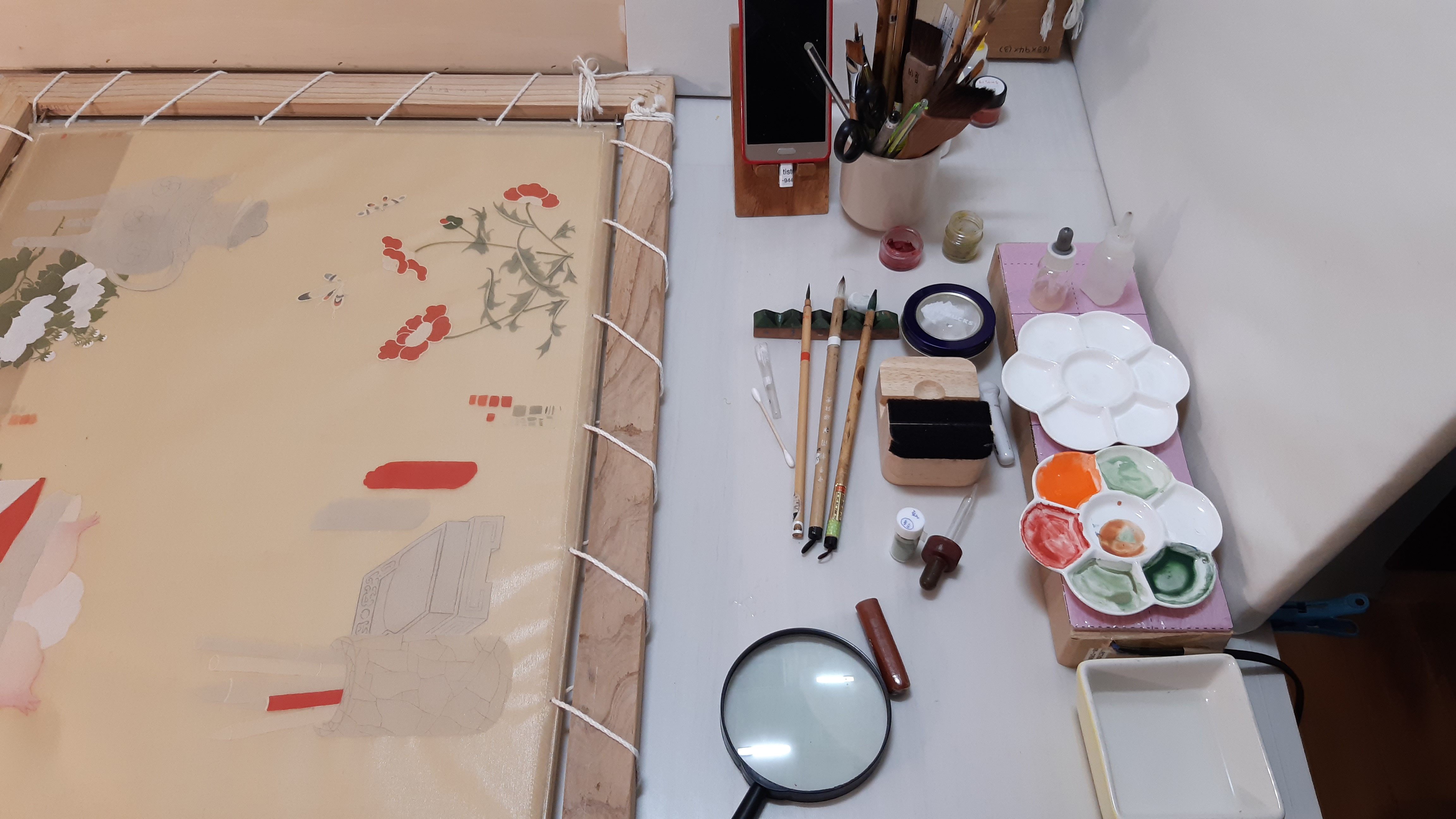 물감접시, 아교액, 물 등을 놓고 씁니다.