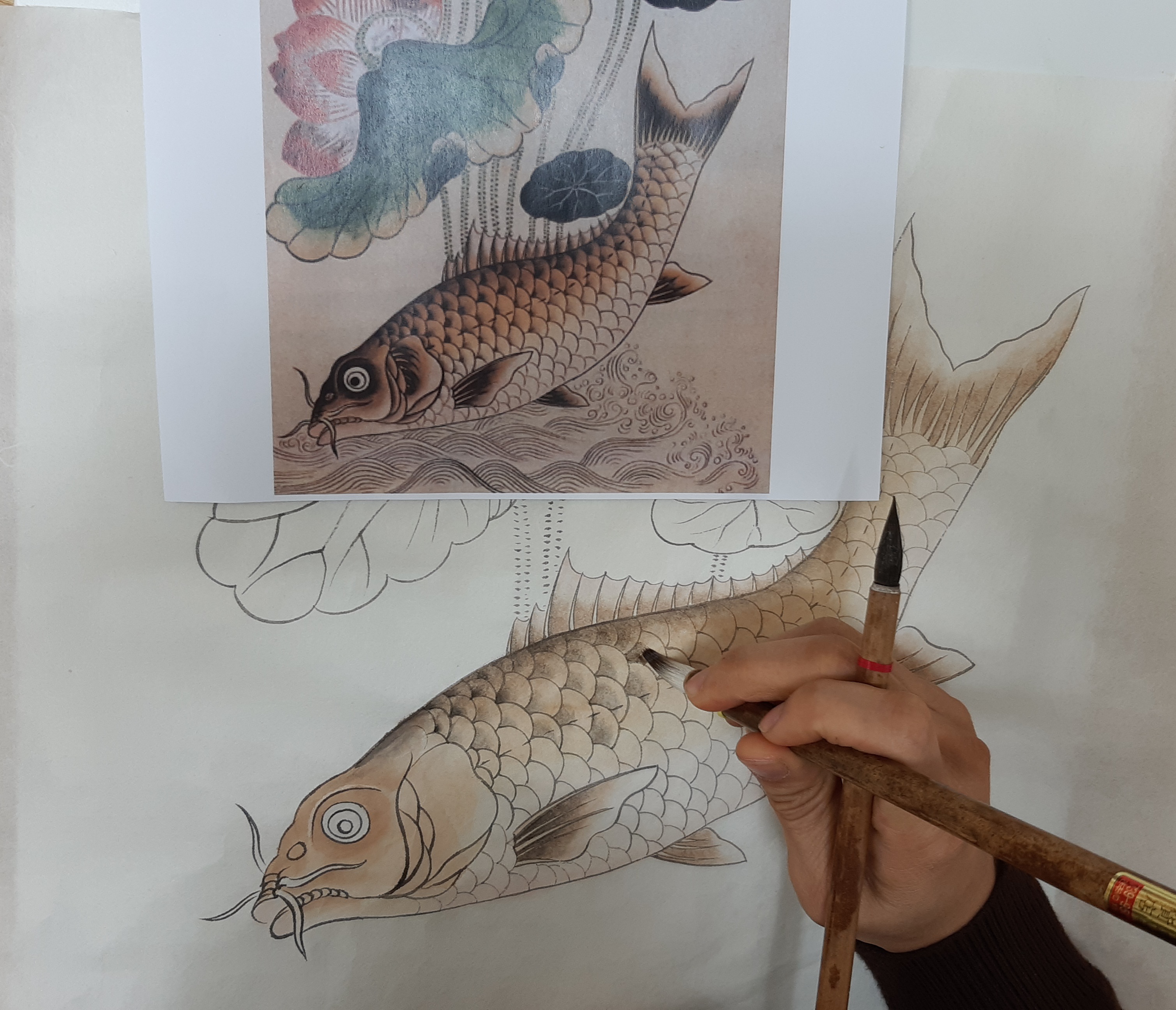 연꽃과 물고기를 그리고 계십니다.