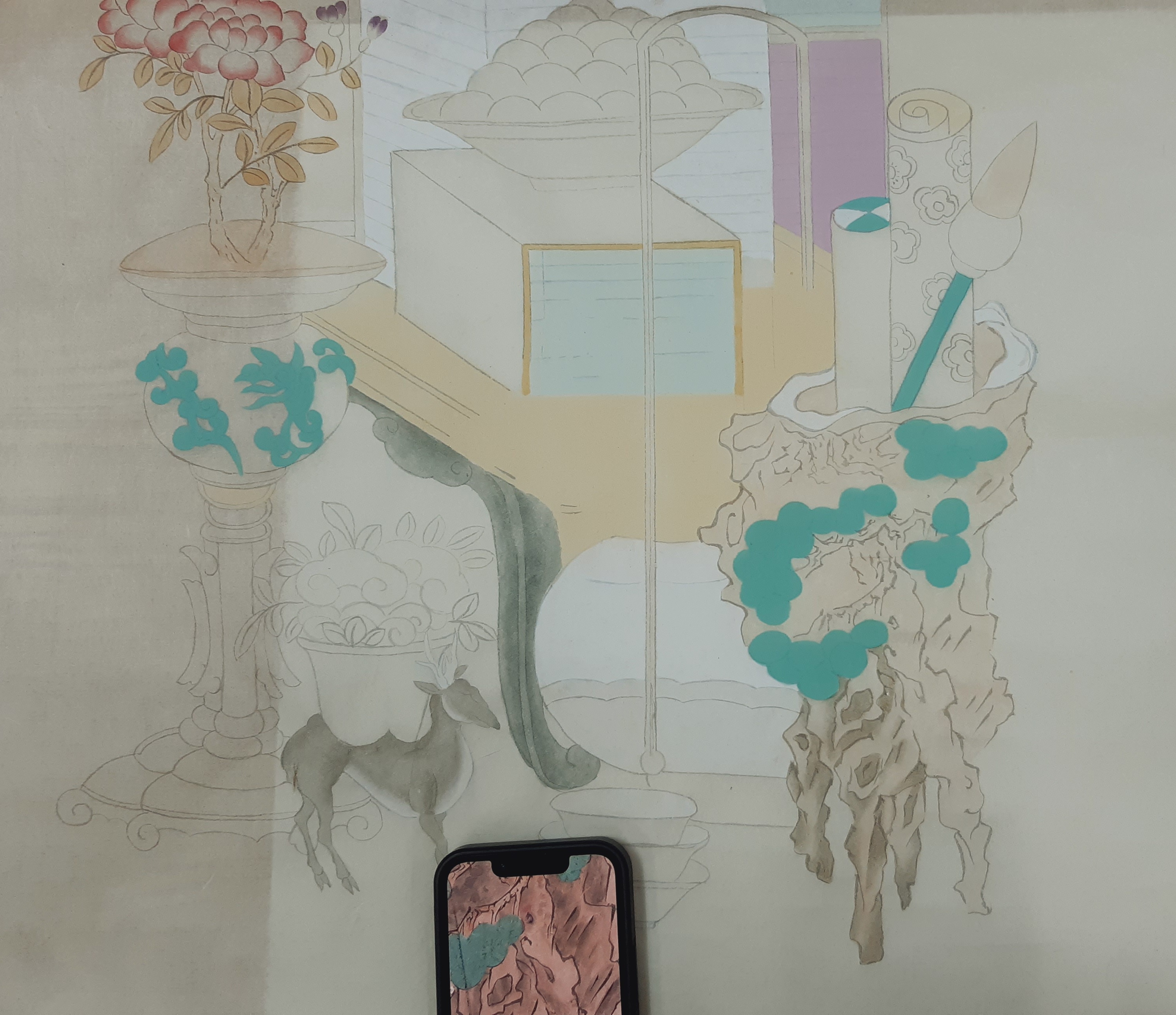 웹서칭을 통하여 국립중앙박물관 사이트에서 책가도를 찾아 선택하여 그리고 계십니다.