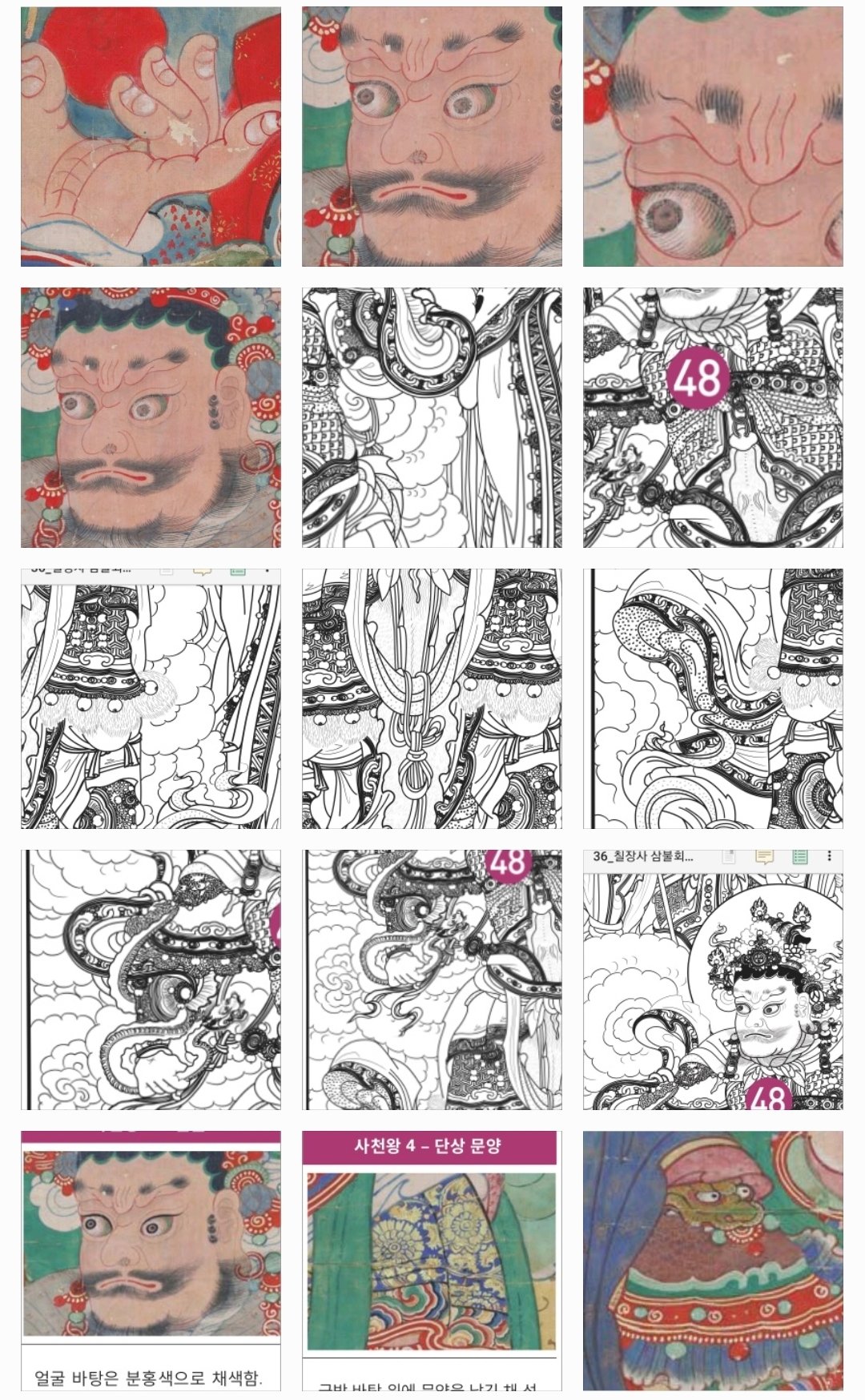 A3 크기 (세로 42cm) 로 본을 뜰 때는 이틀이 걸렸지만, 크게 세로 82cm 로 본을 뜨니 일주일이 넘는 시간이 걸렸습니다. 문양도 미리 선을 만들고 채색 계획도 하면서 본을 만듭니다.