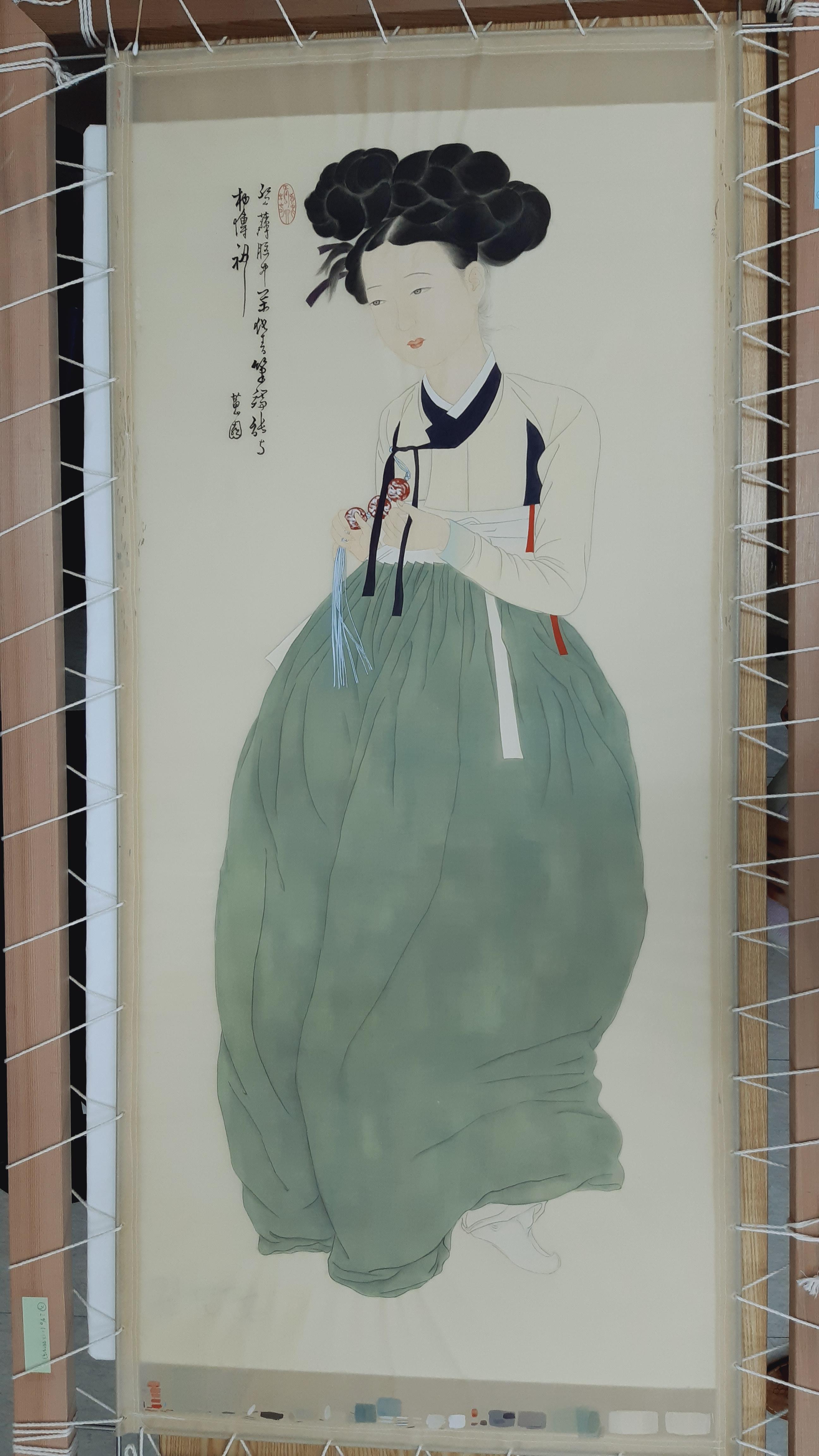붓을 놓치기도 하고, 물감과 먹물이 알지 못하는 사이에 튀기도 해서 꼭 순지 등으로 덮고 작업 해야 합니다. 다른 부분 채색시 특히 얼굴을 잘 덮어 놓고 해야 합니다.