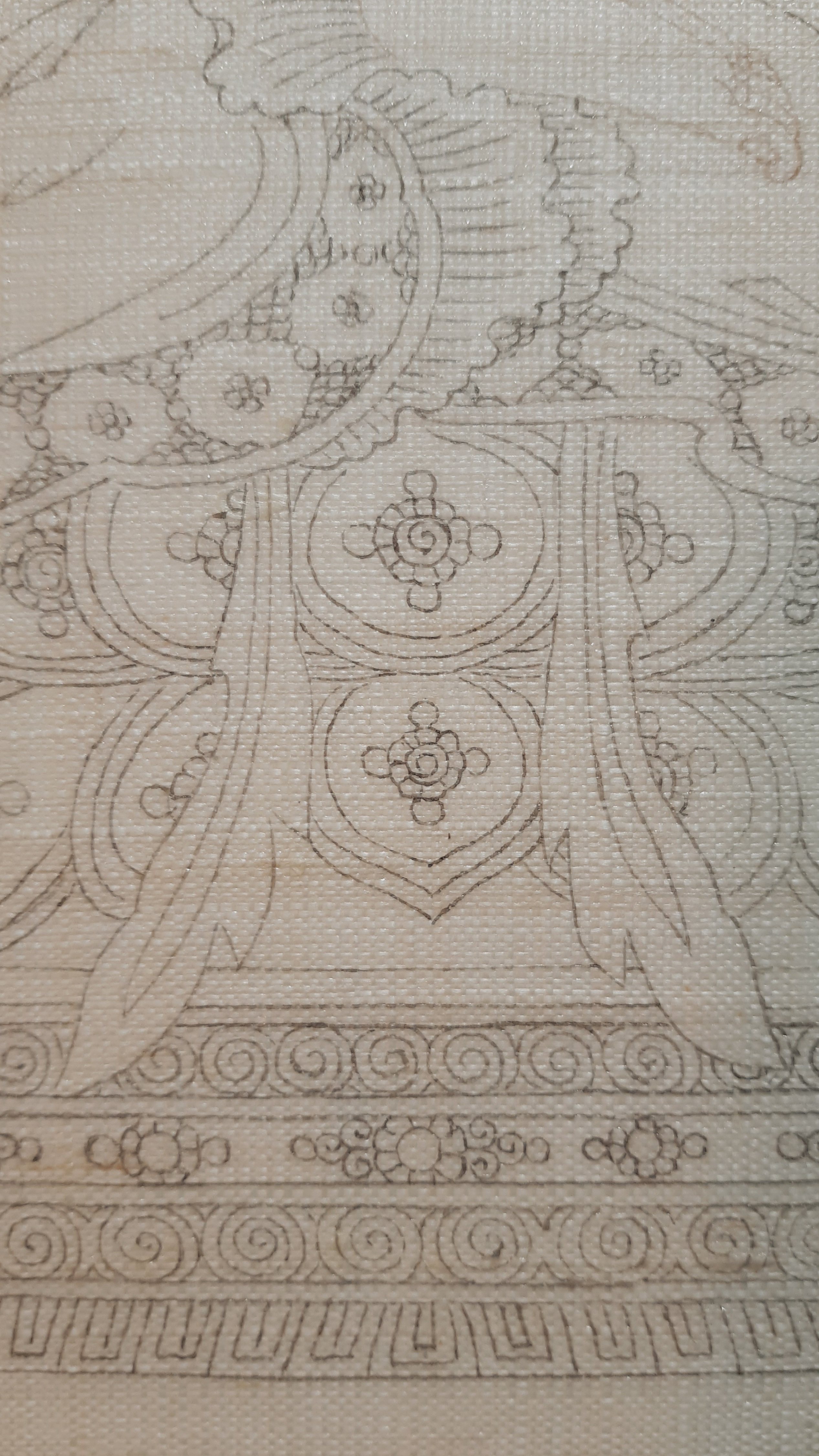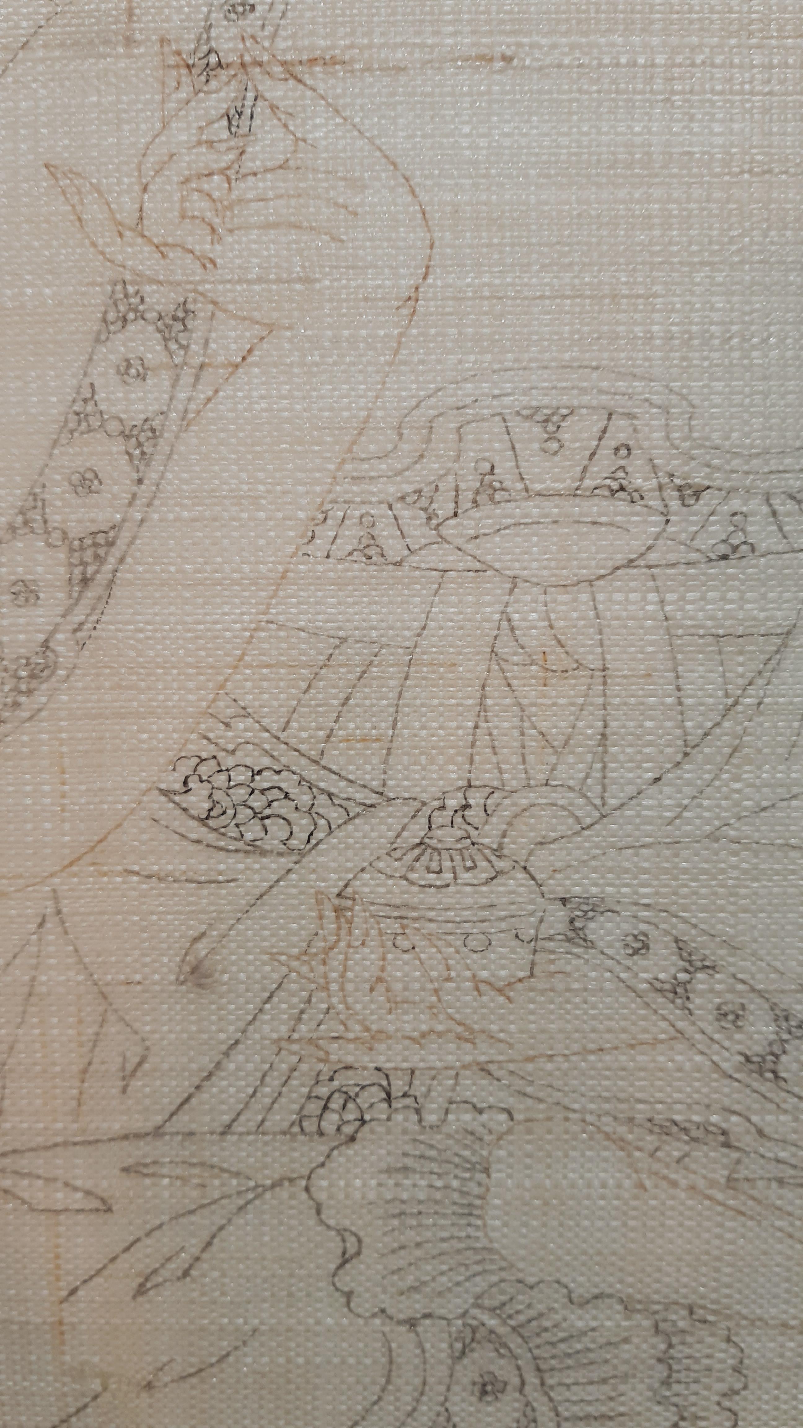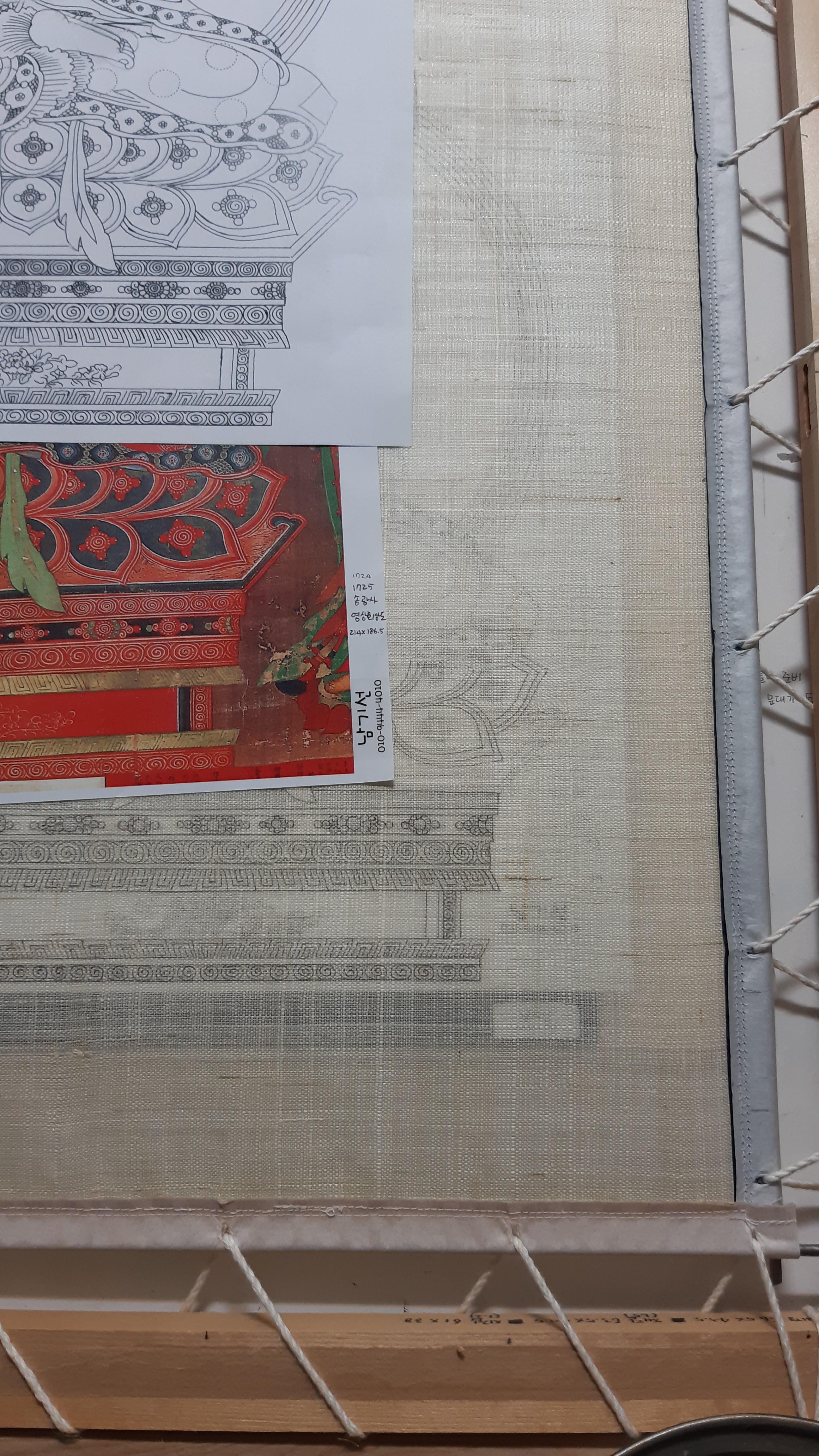 삼베가 완전 투명하진 않고, 도침을 했어도 평활하지 않기 때문에 밑에 댄 본이 잘 안보입니다. 원화와 본을 옆에 놓고 보면서 뜹니다.