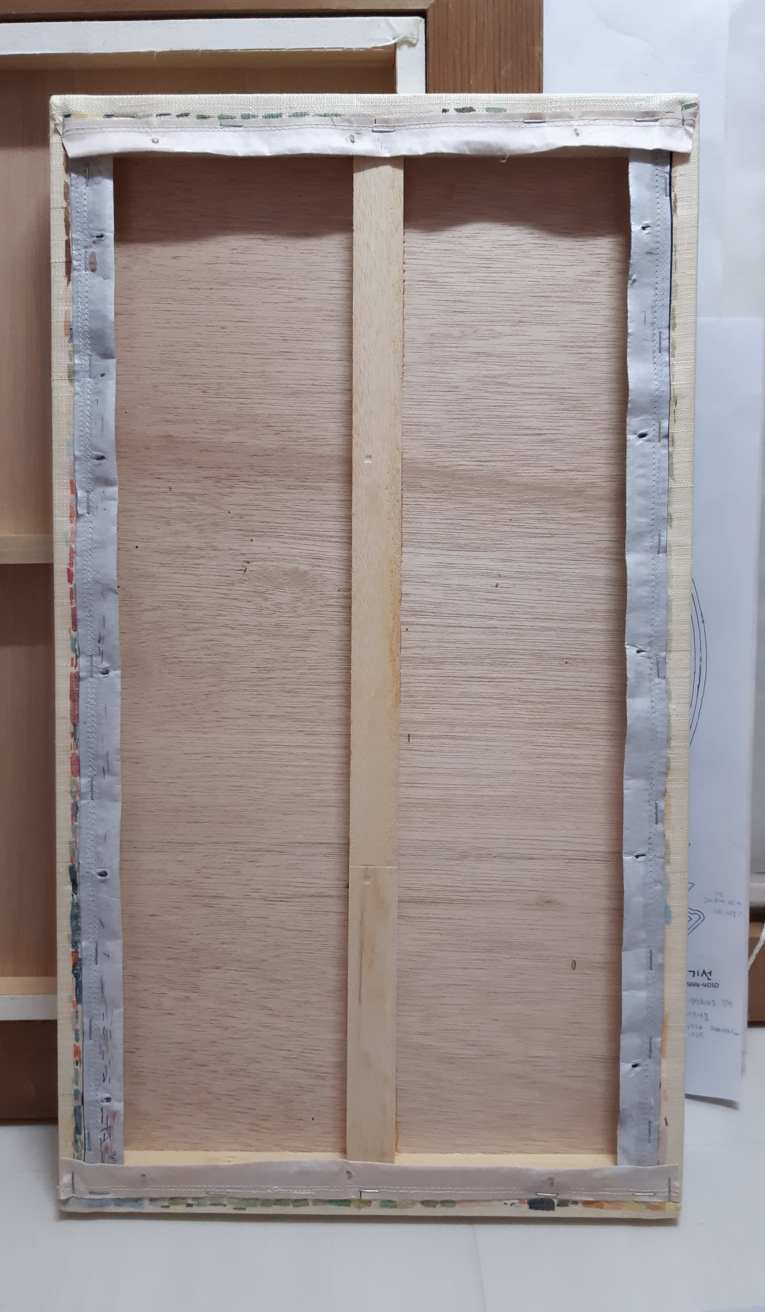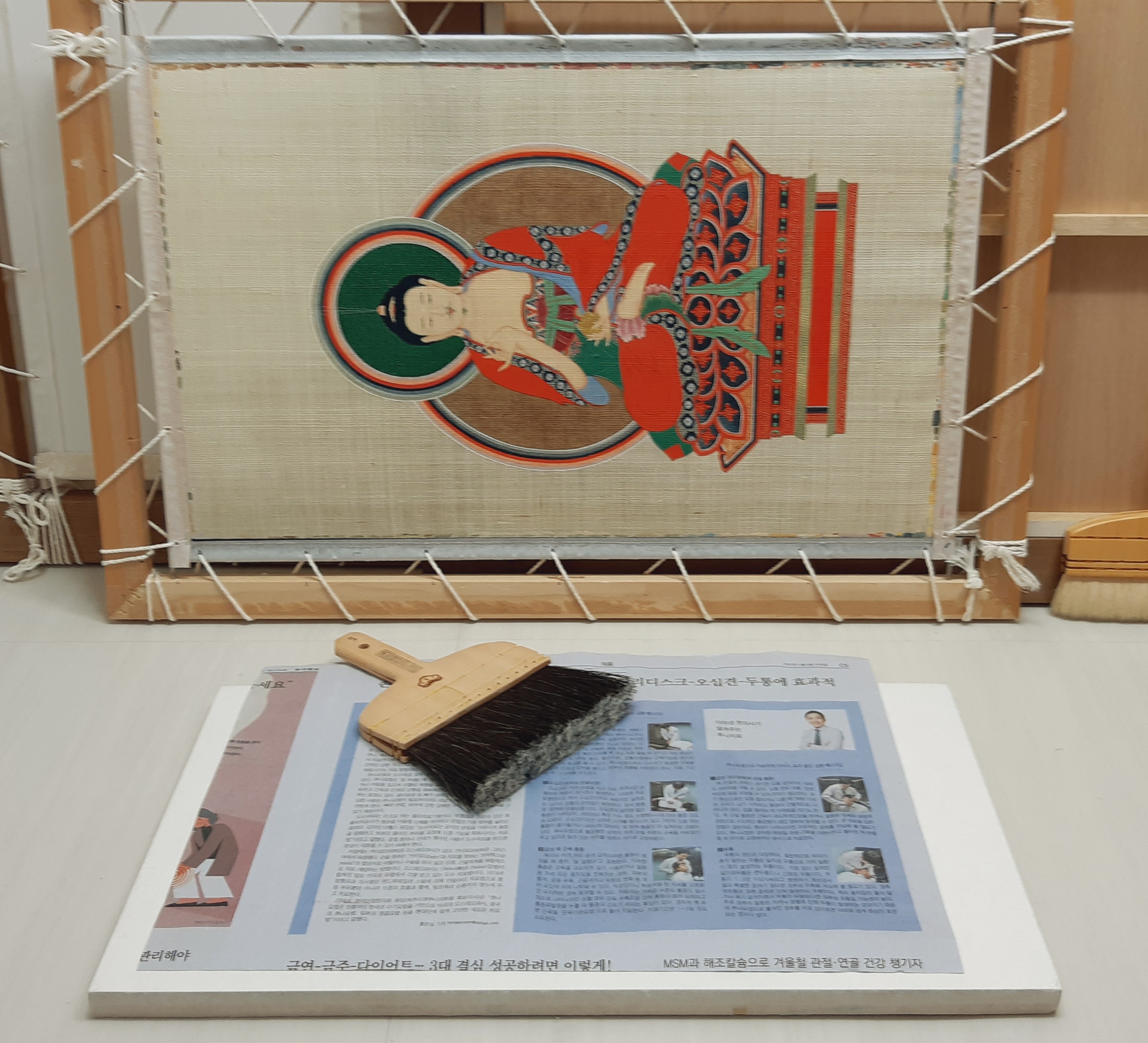 틀에 붙인 채로 배접하기 때문에 (공중에 떠 있어서) 판넬 위에 신문지를 깔고 그림을 엎어 놓고 배접 하였습니다.