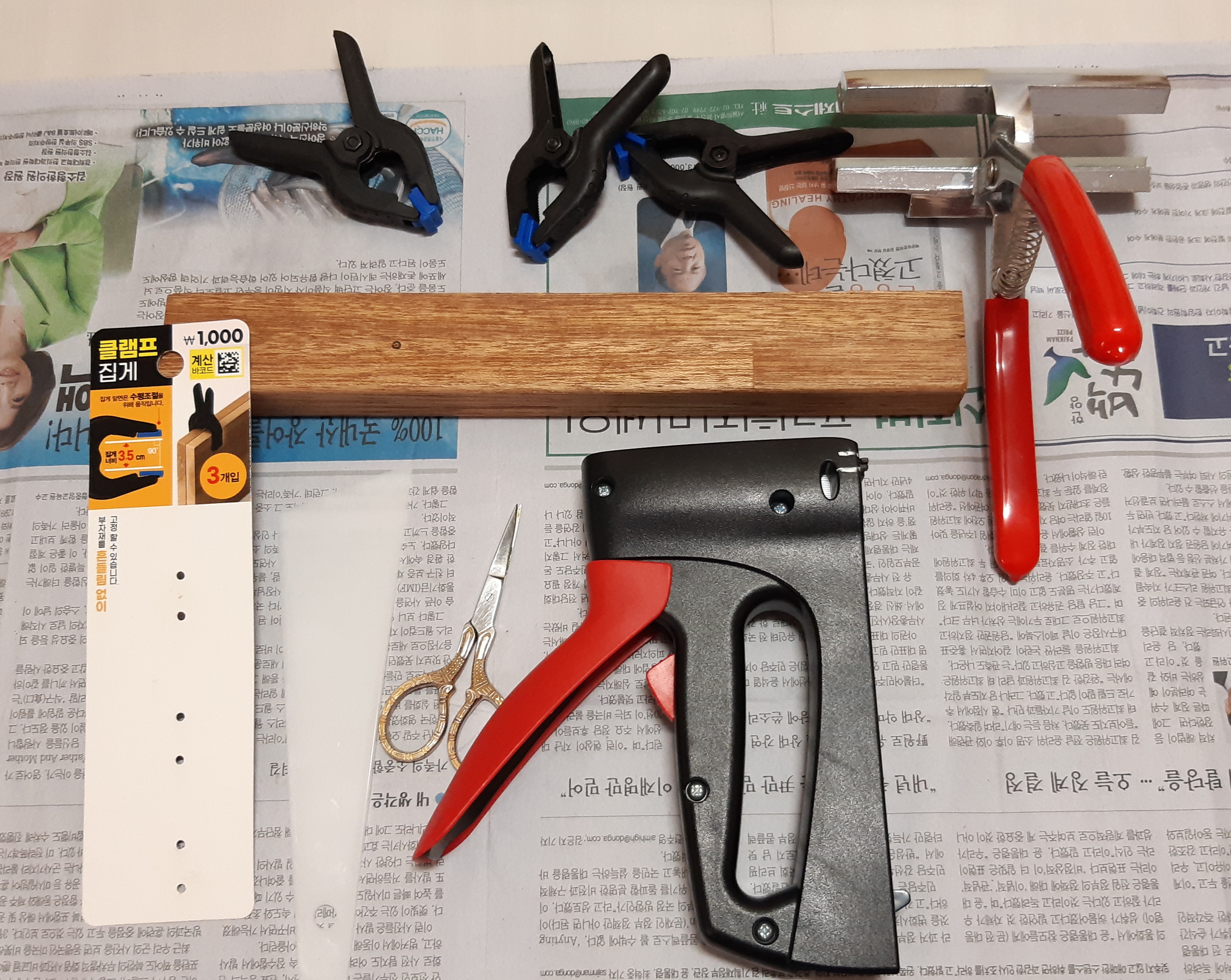 나중에 액자 뒷판에 타카로 고정하고, 와이어도 나사로 고정하기 때문에 타카가 겹치지 않도록 박은 곳을 기억해 놓습니다.
