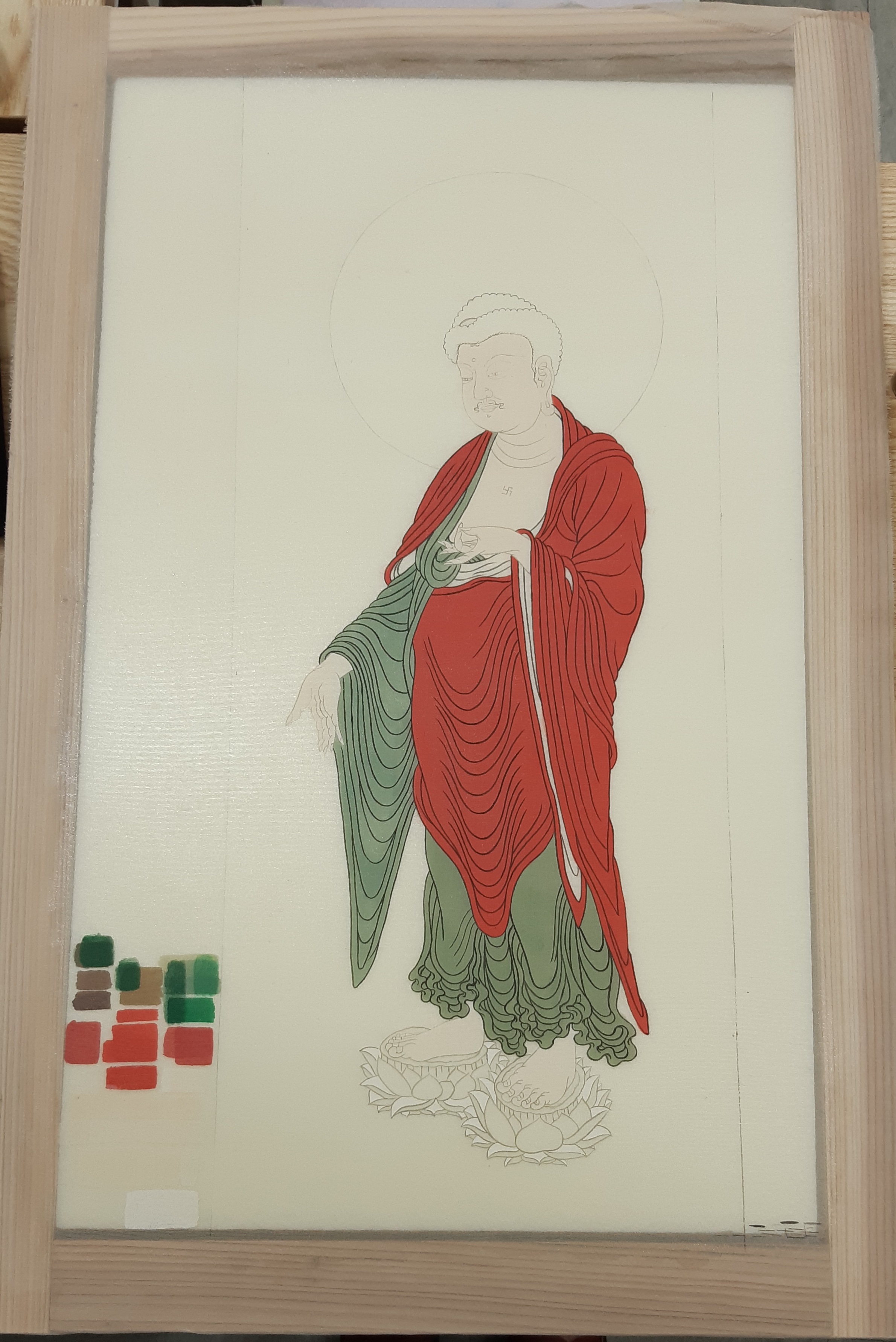 오간자 3합 비단을 수세하고 염색하고 틀에 고정한 후 아교포수 하였습니다.