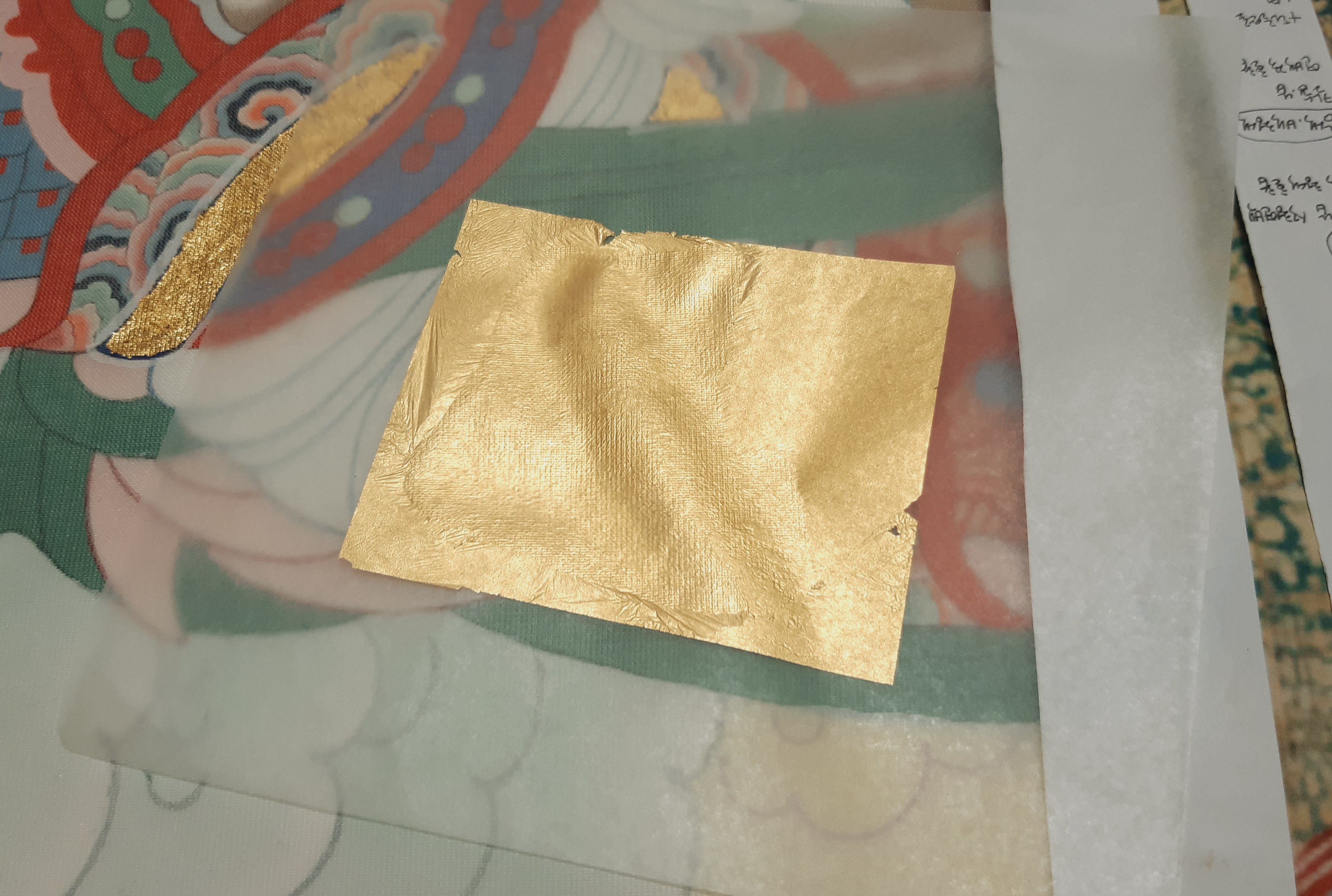 붙이고 난 후 비단의 올이 금박위로 올록 볼록 보이는 것이 잘 붙은 것입니다. 금박이 스스로 달라 붙는 느낌 입니다.