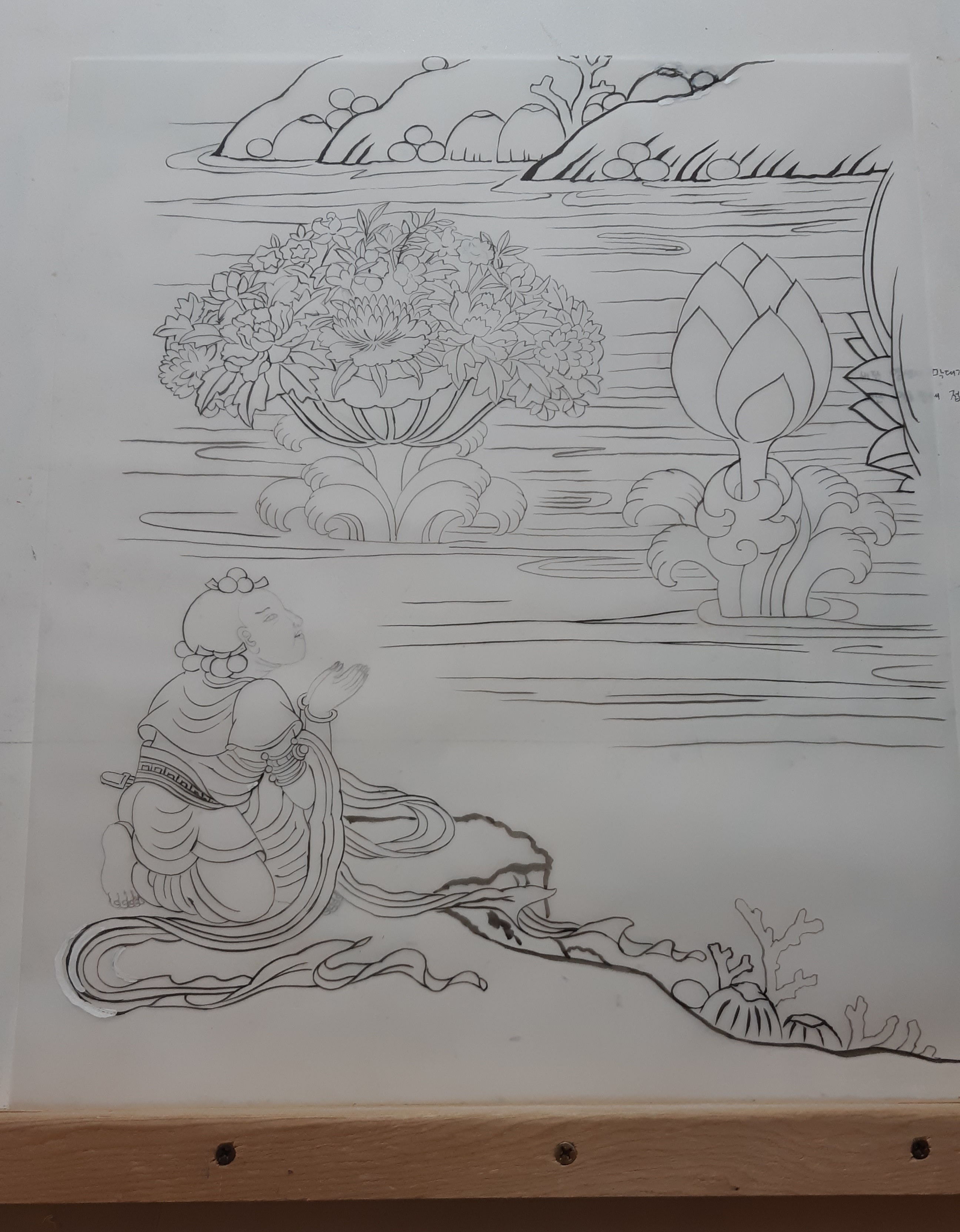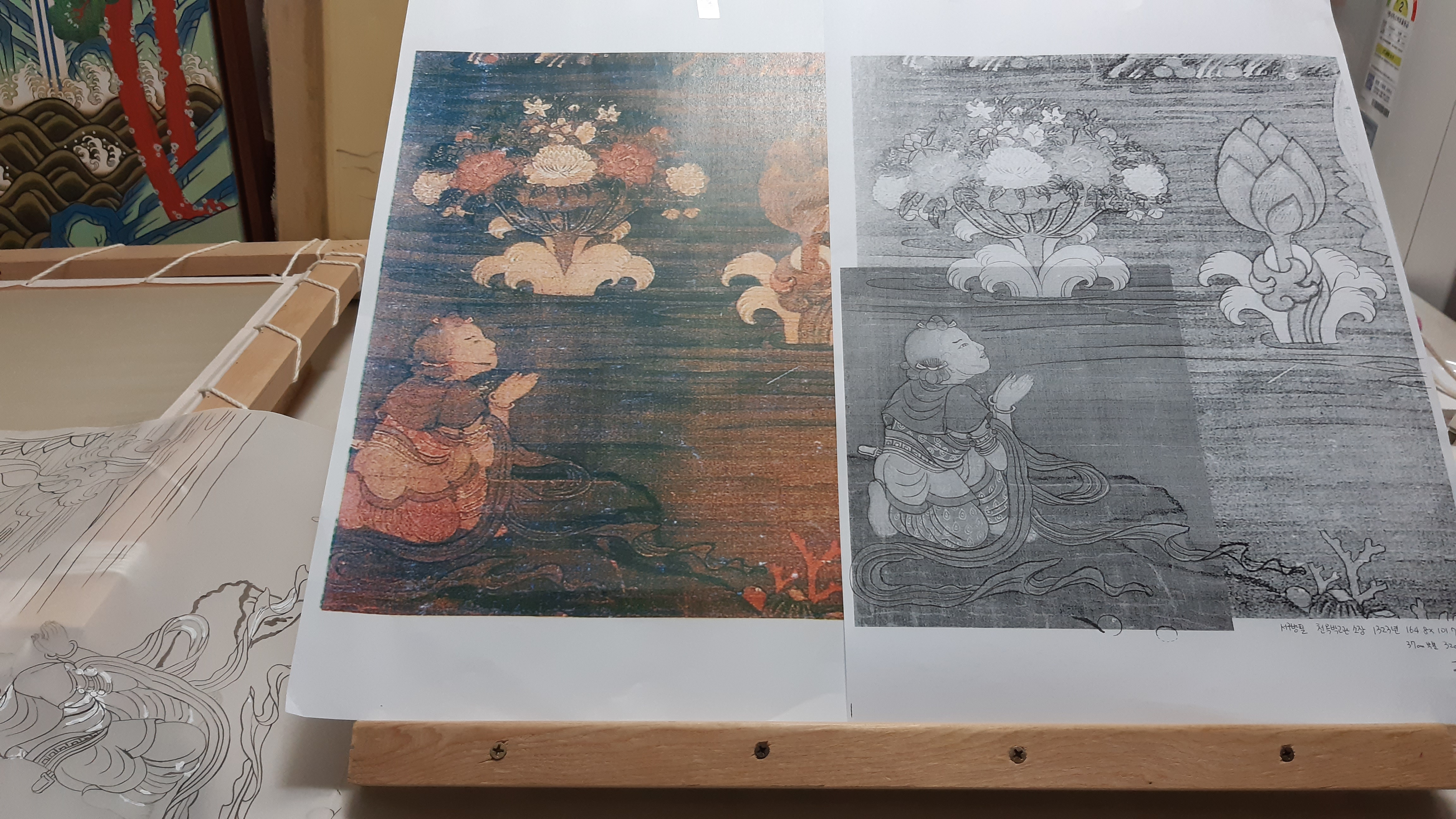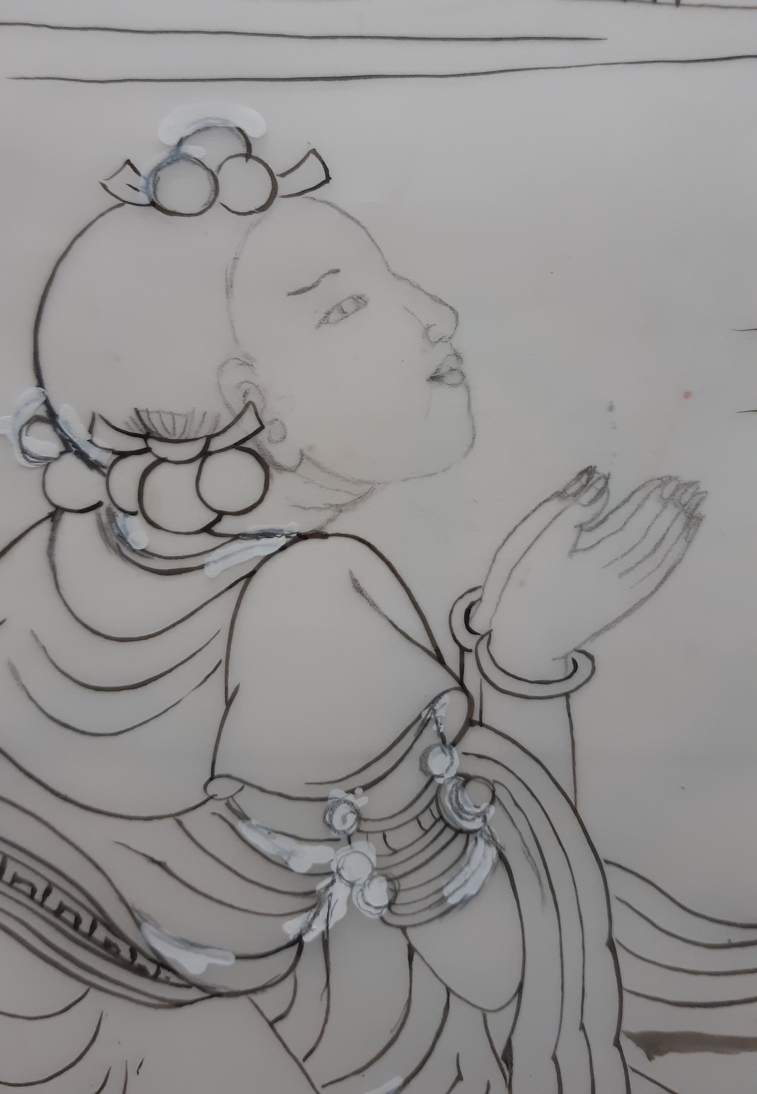 선재동자의 발과 손, 눈매, 입매, 눈썹, 얼굴 선 등을 세심하게 수정합니다.