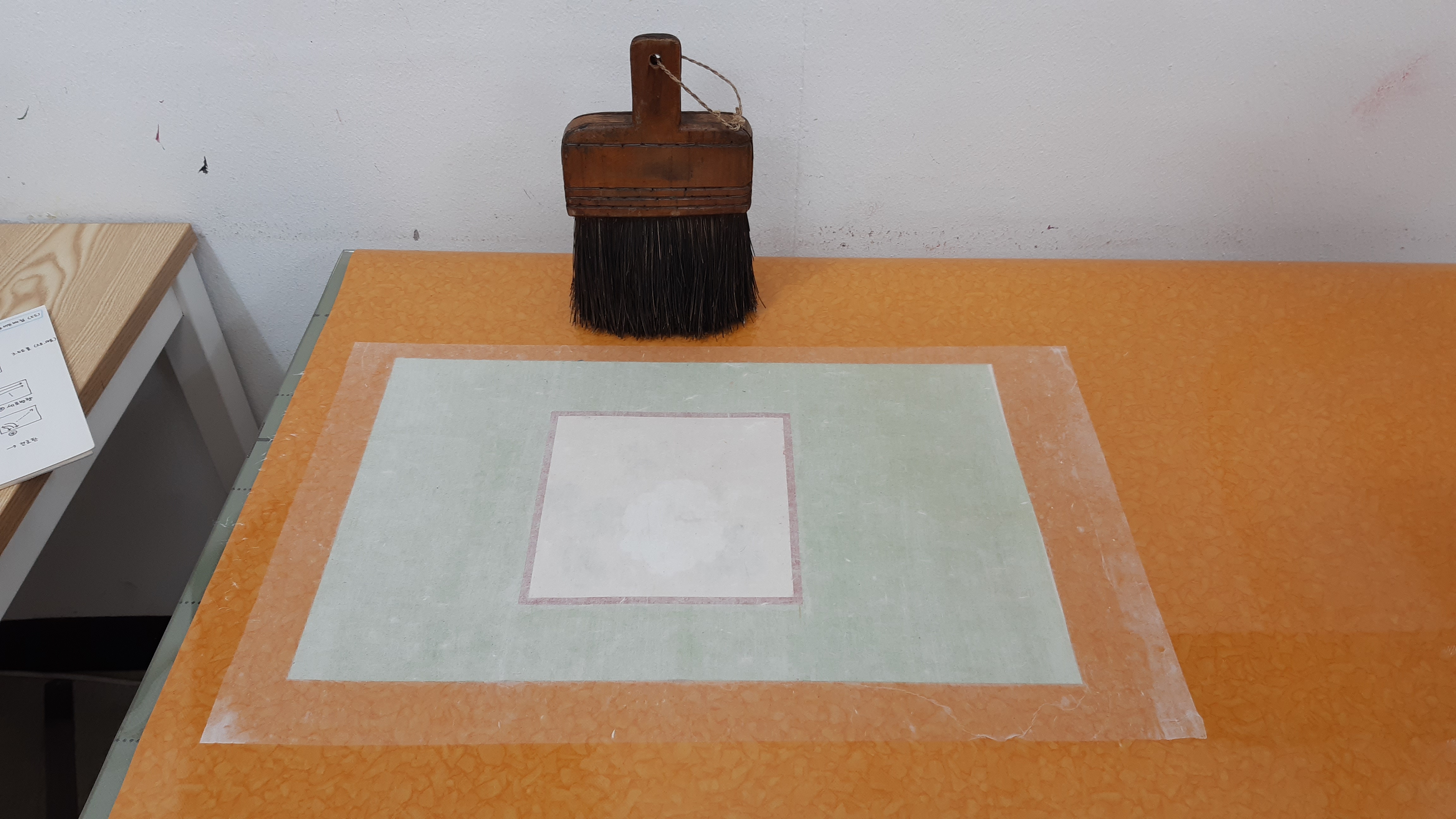 장황비단 배접 하기 전, 건조판에 고정합니다.