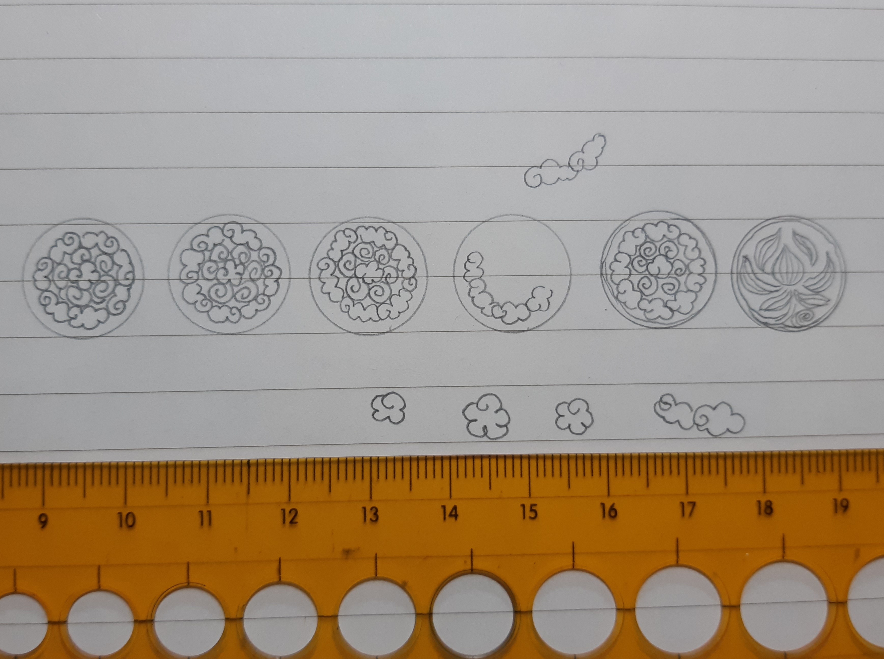 붉은 대의에 구름무늬 원형 문양을 금분으로 그리려고 합니다. ohp 투명 필름에 동그라미를 그려 속을 칼로 오려낸 후 그 안에 그립니다. ohp 필름에 붓이 닿으면 ohp 필름 밑으로 금분이 번지므로, 그리고자 하는 크기보다 지름 2mm 크게 구멍을 만듭니다.