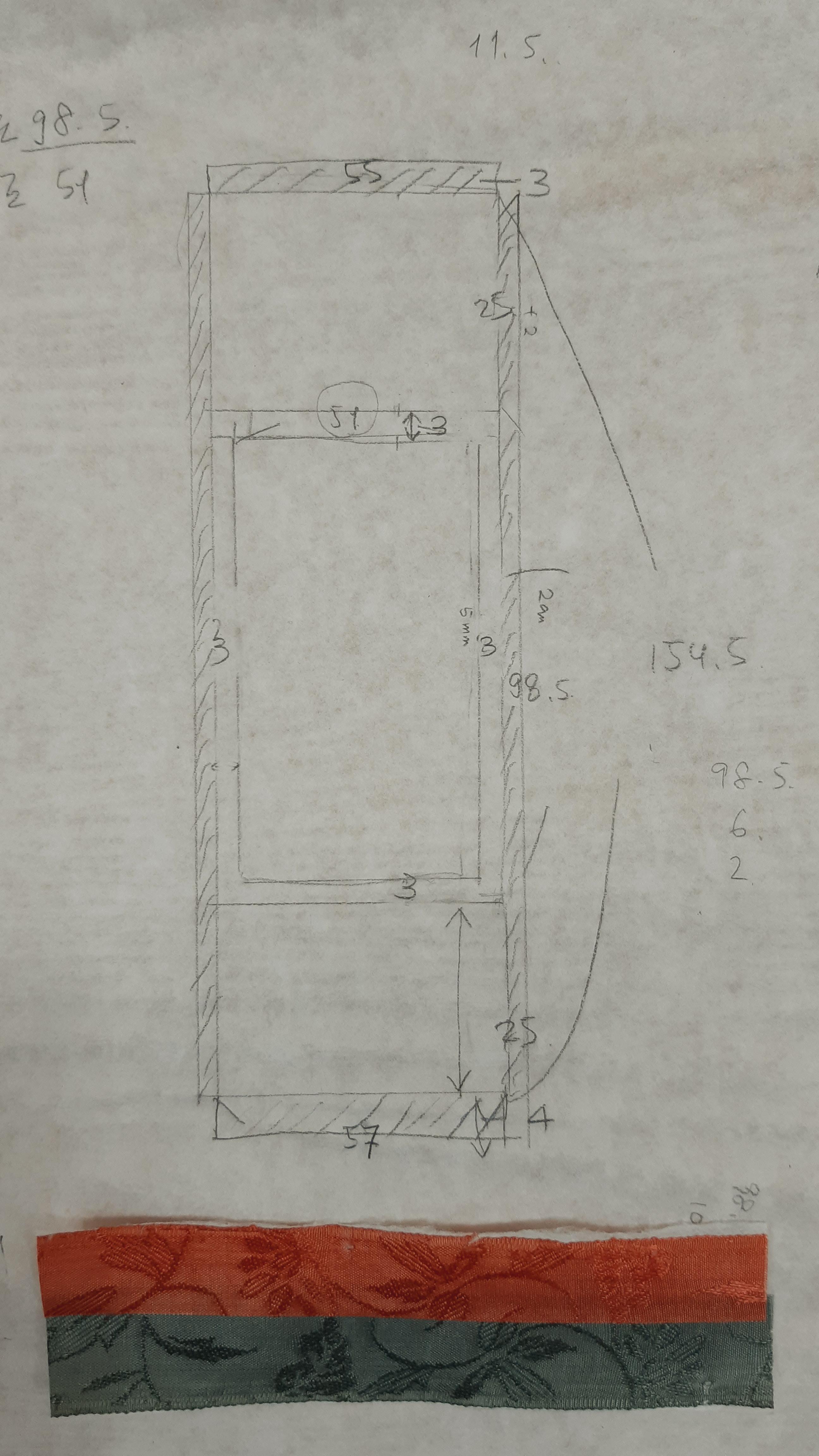 보통 두께의 배접지로 (족자 세로 방향에 대해) 가로 방향으로 축목 주머니를 재단합니다.