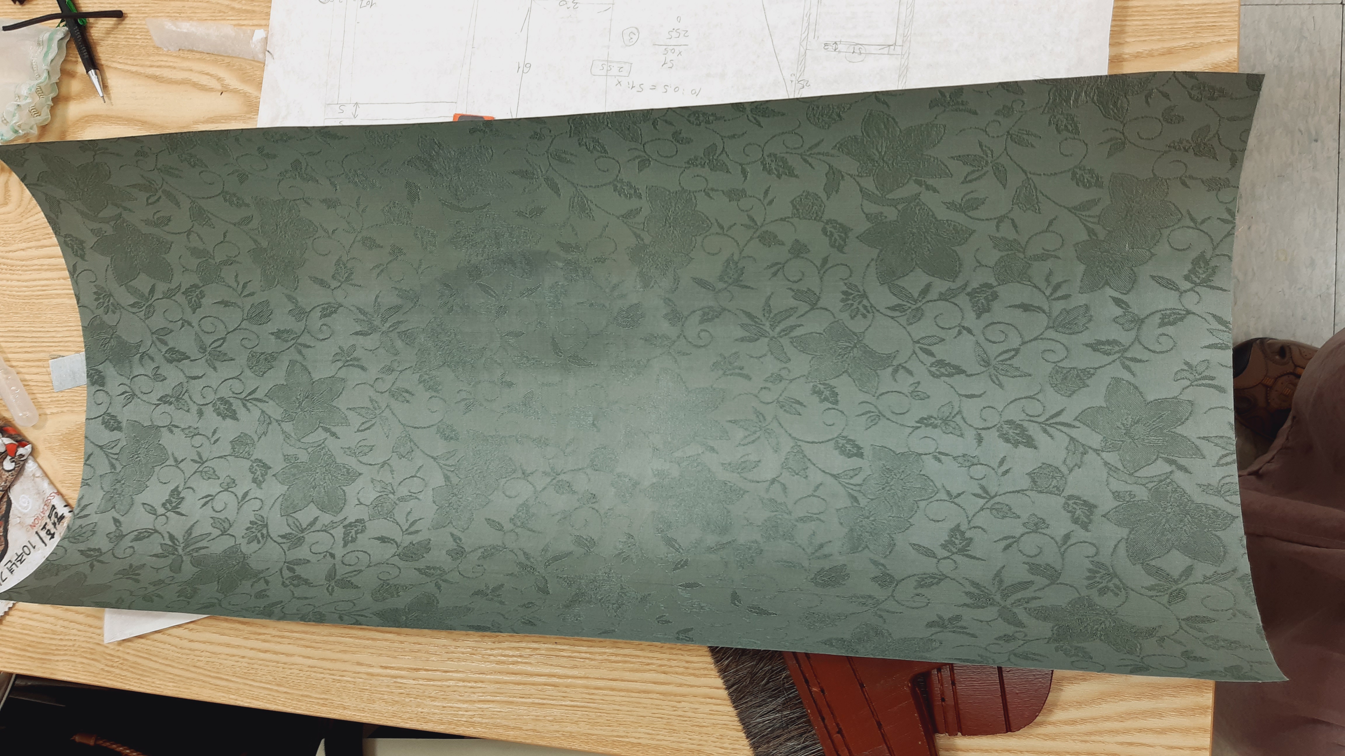 사방직각재단 방법으로 배접한 장황비단을 재단합니다.